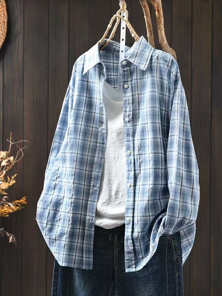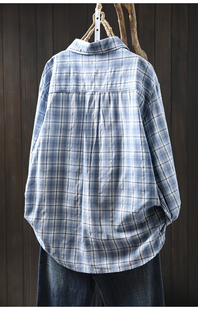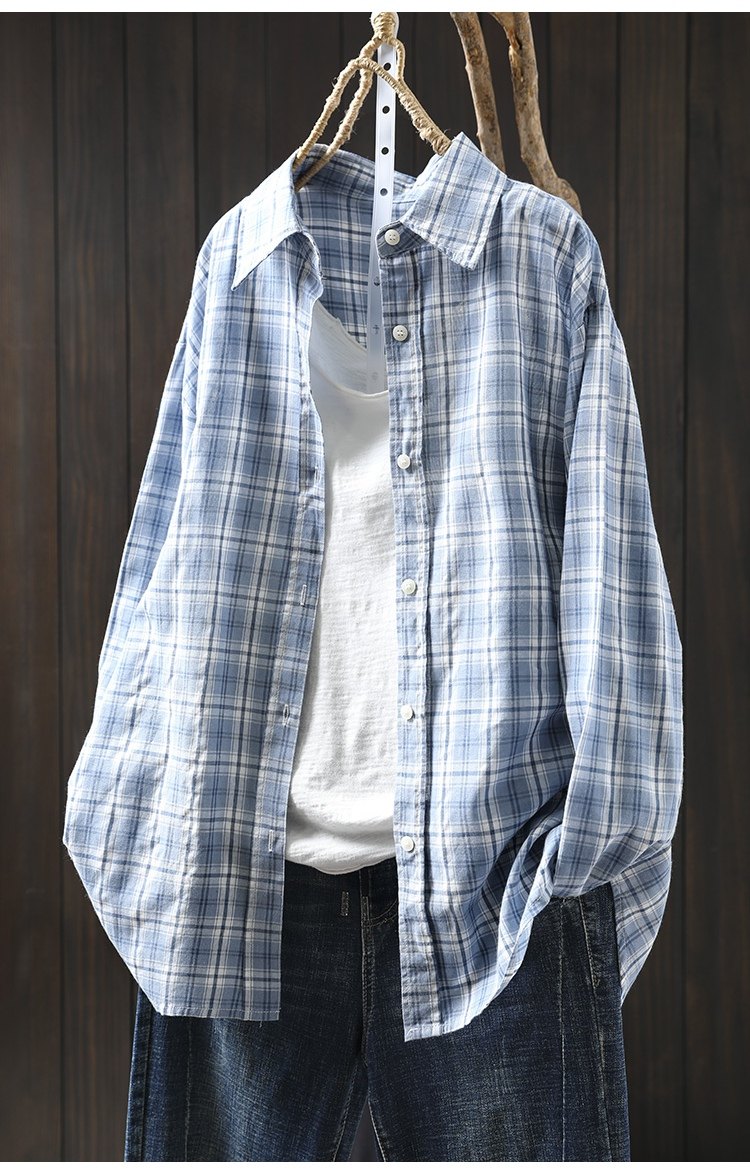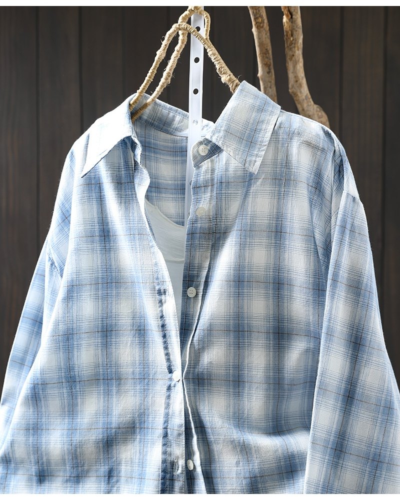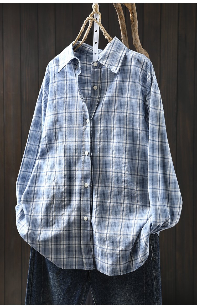 봄 새로운 면 블루 격자 무늬 셔츠 여성용 홍콩 스타일 얇은 셔츠 탑 3605