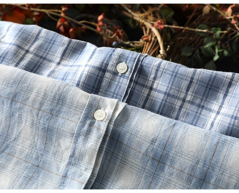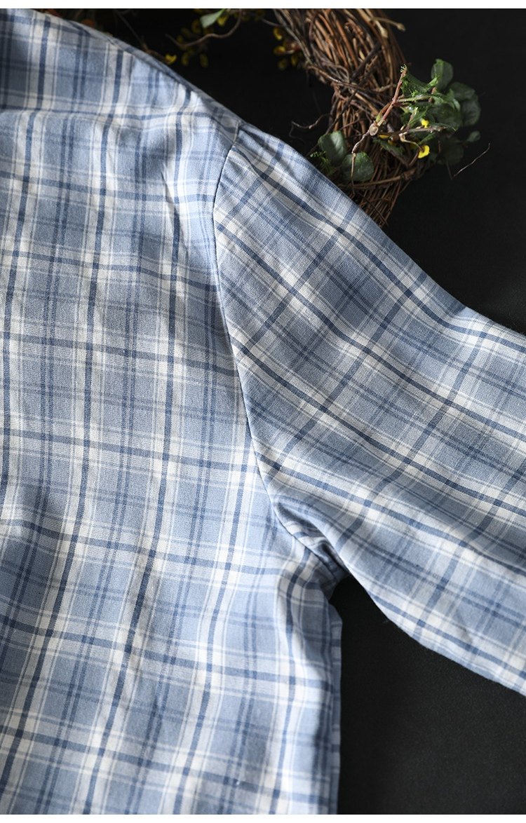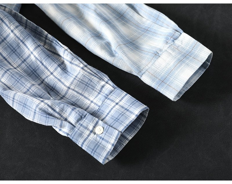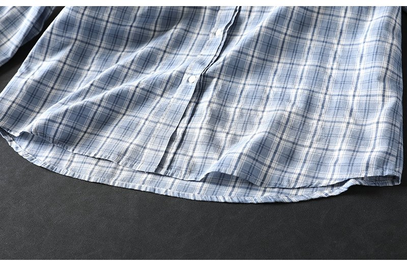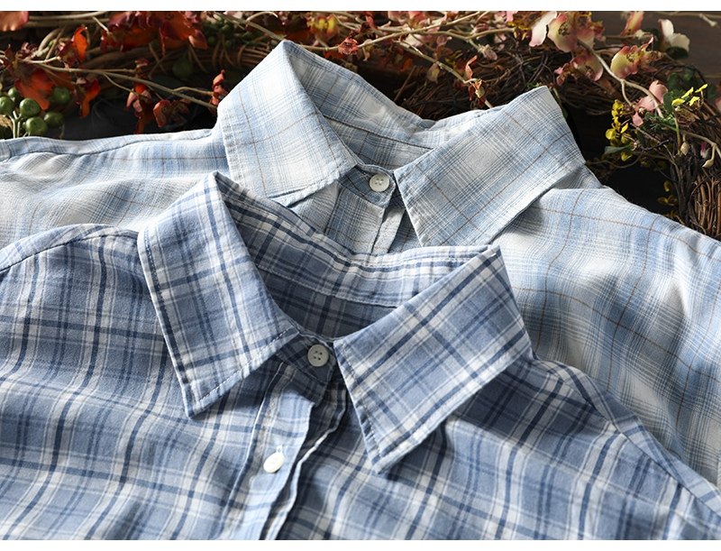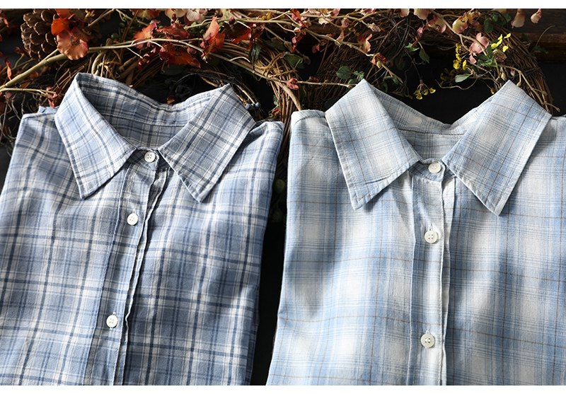봄 새로운 면 블루 격자 무늬 셔츠 여성용 홍콩 스타일 얇은 셔츠 탑 3605스토어 가기