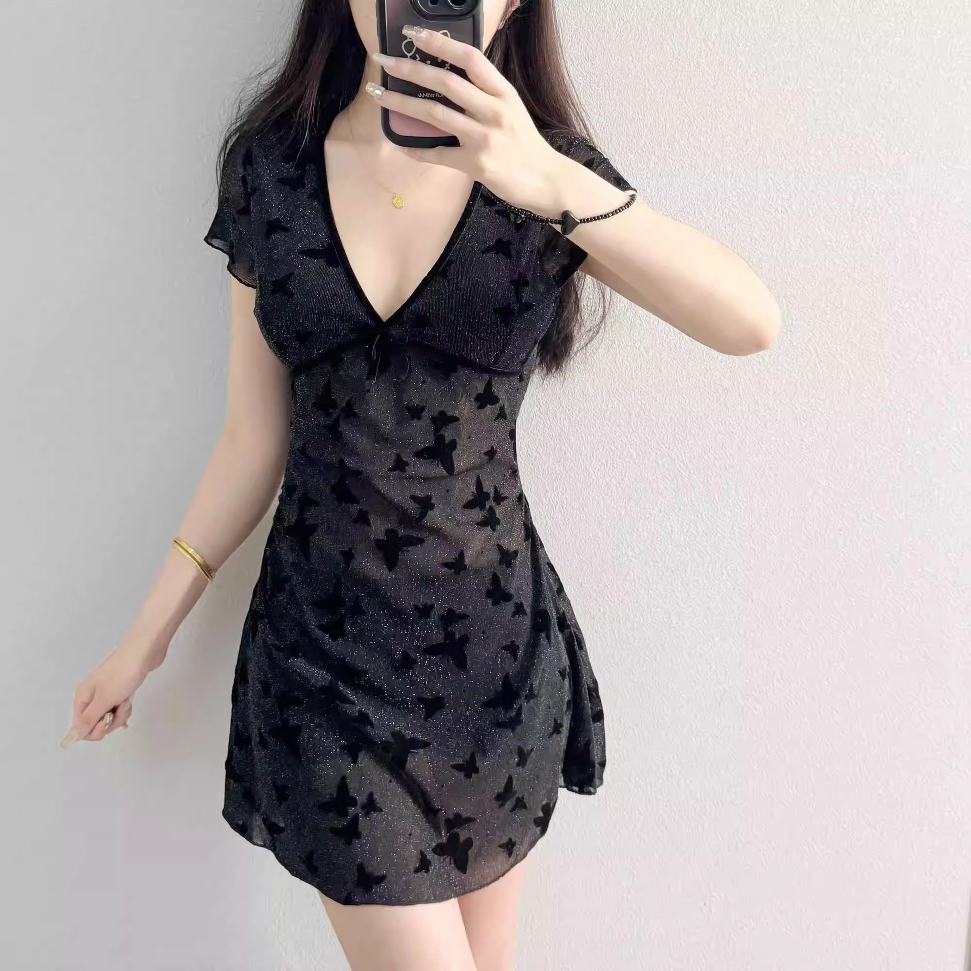 핫 걸 빈티지 섹시 V 넥 플로랄 반팔 청삼 스플릿 플랫 수영복 여성용 퓨어 슬림핏 슬림핏 스커트