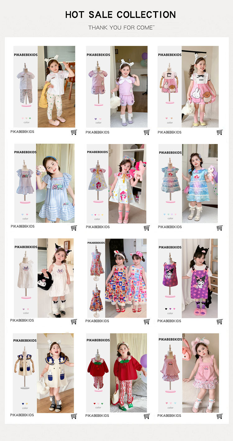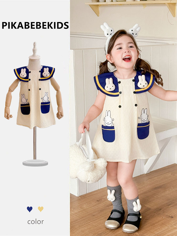 프레피 스타일 토끼 소녀 의류 여름 드레스 옷깃 포켓 만화 귀여운 토끼 어린이 스커트스토어 가기