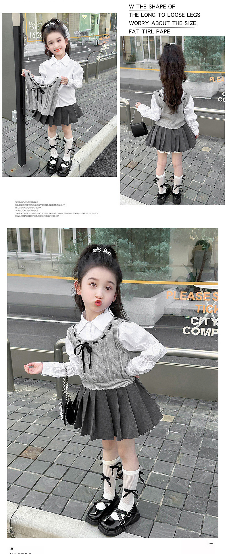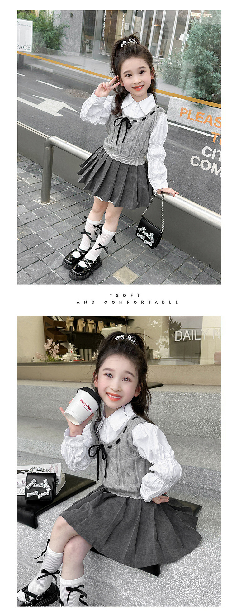 소녀의 세련된 봄 원피스 세트 2025 새로운 어린이 어린 소녀 대학 스타일 봄 원피스 3 피스 세트