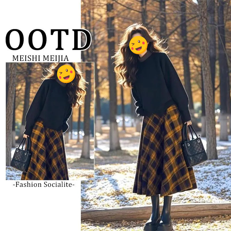 2024 년 새로운 작은 향수 스타일의 사교계 명암 대비 컬러 스웨터 체크 무늬 오버 스커트 연령을 줄이는 겨울-세트 여성 의류 감소스토어 가기