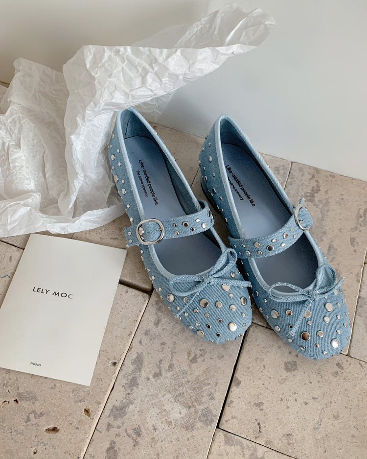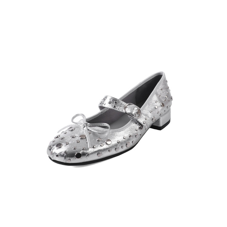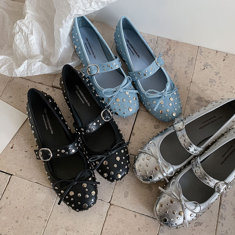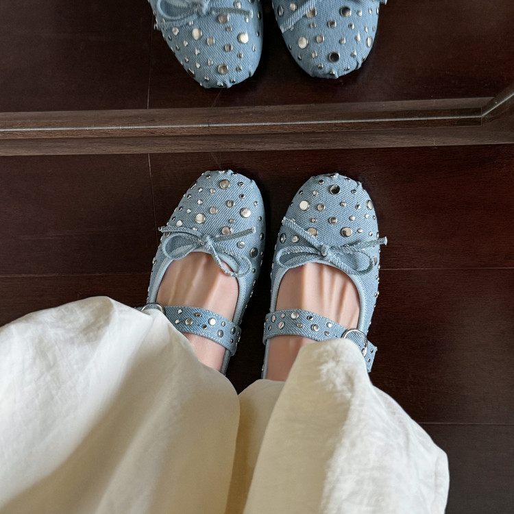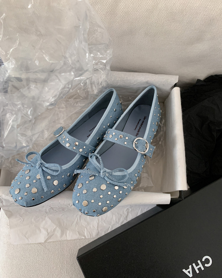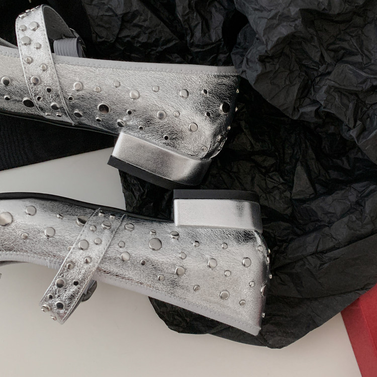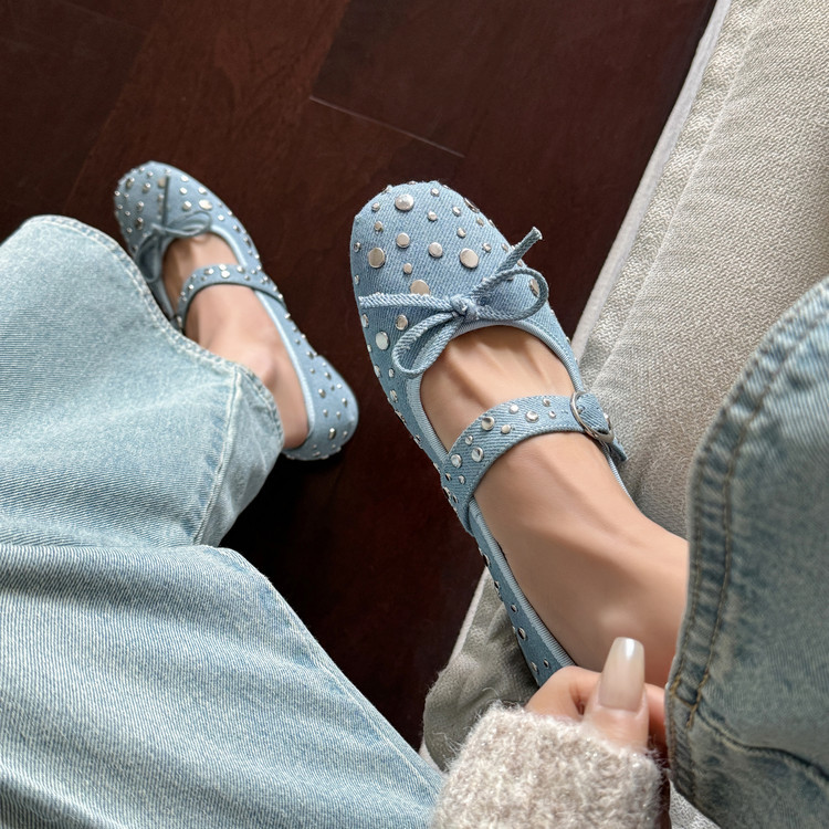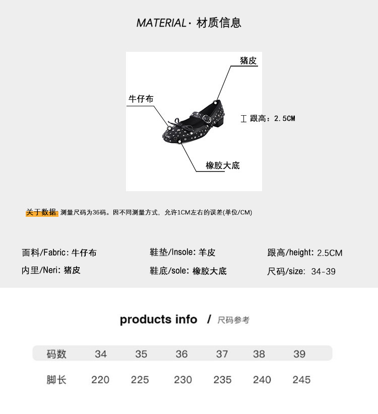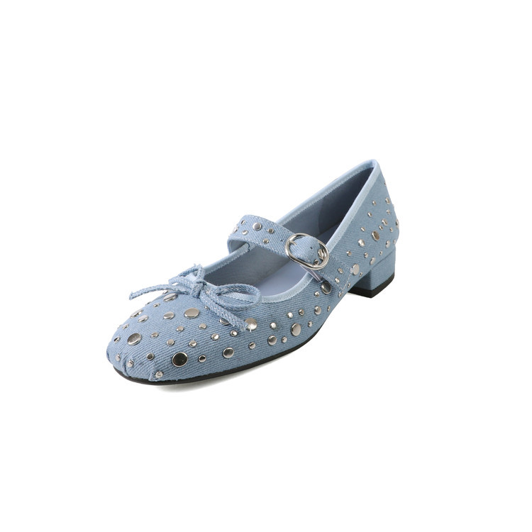 데님 리벳 메리 제인 신발 여성용 두꺼운 힐 신발 새로운 라운드 토 활 미드 힐 신발 여성용 정품 가죽 얕은 입 신발스토어 가기
