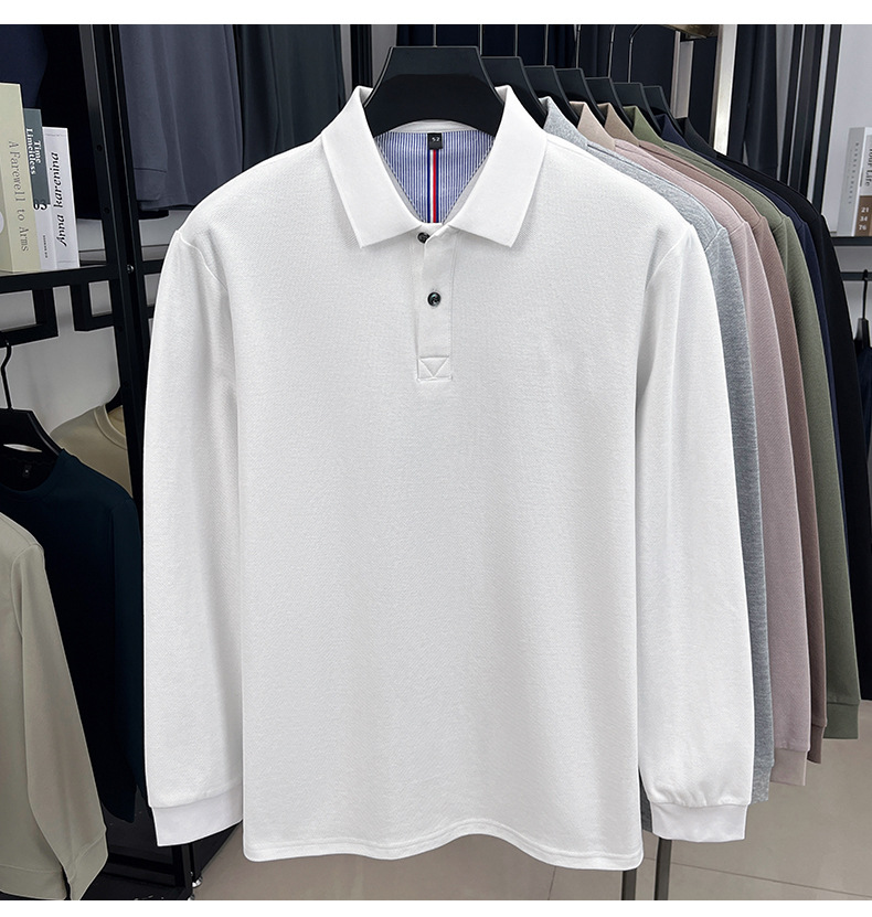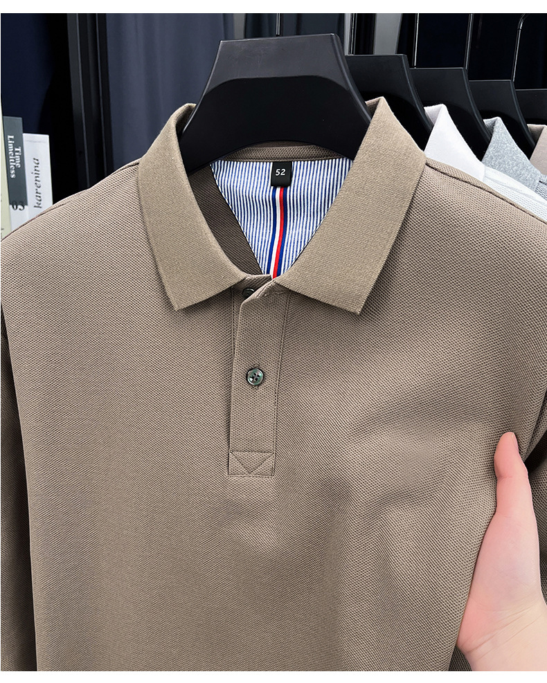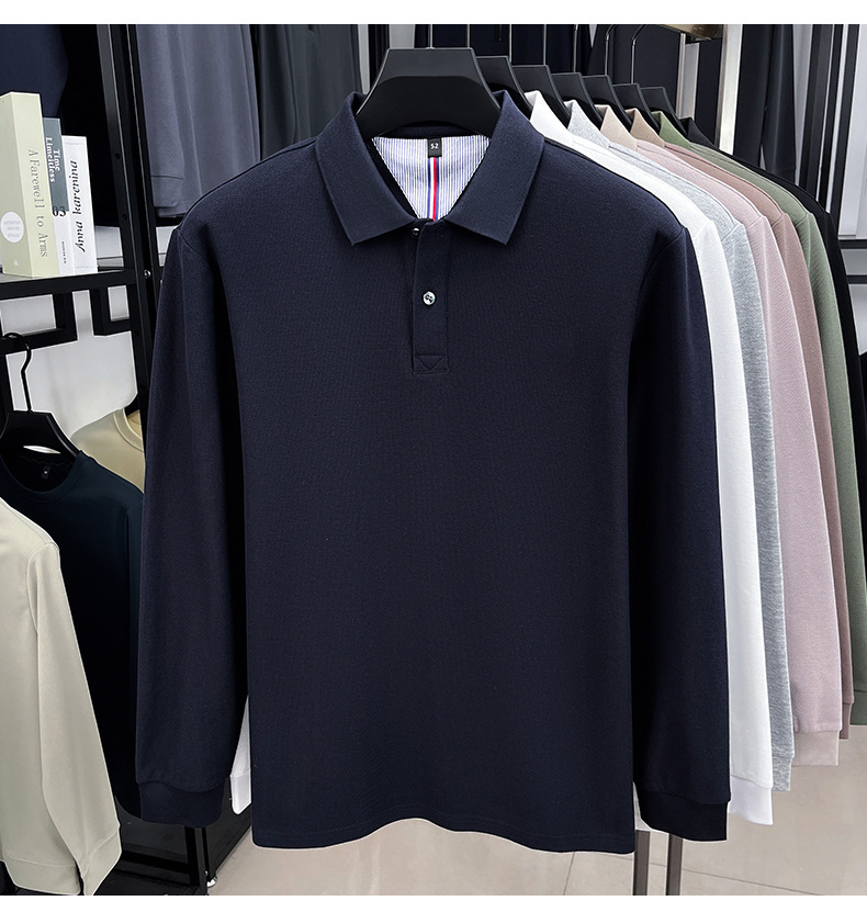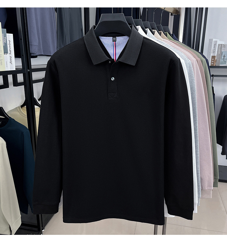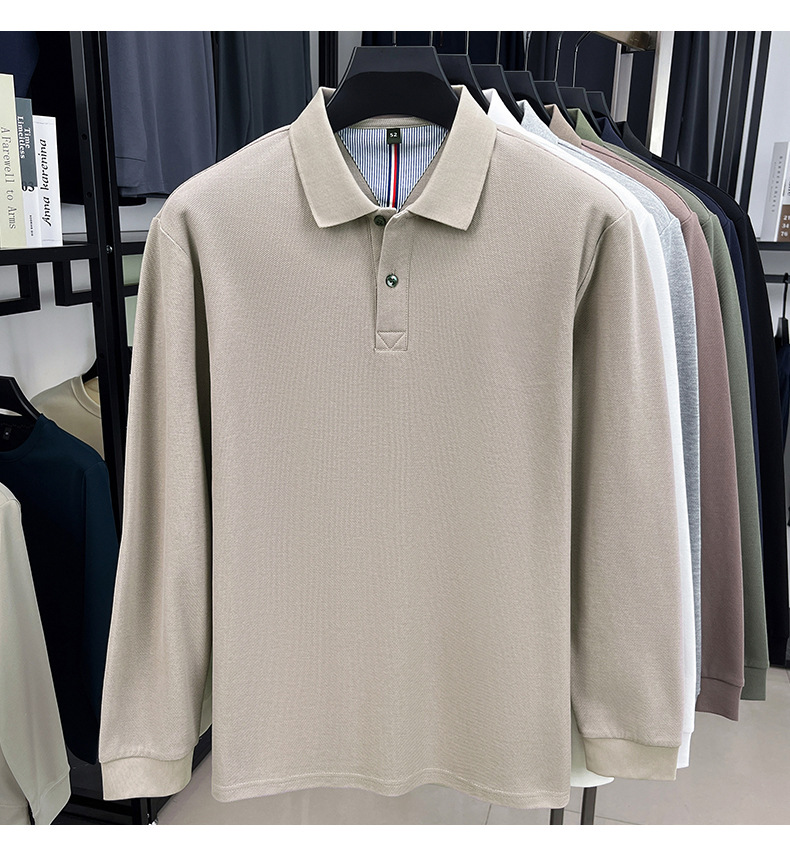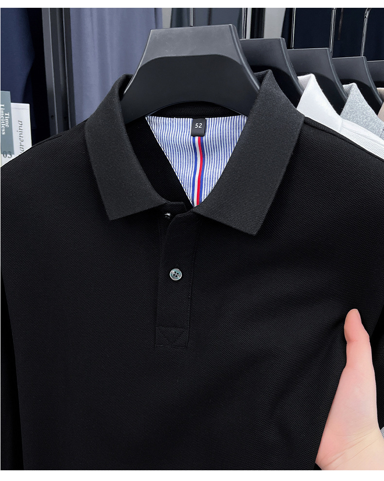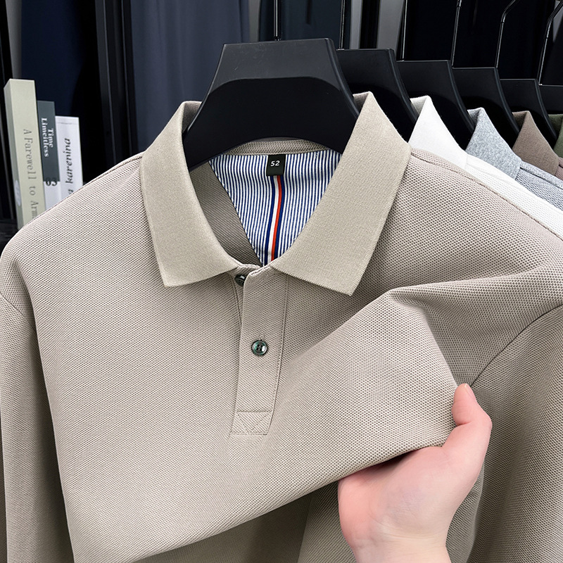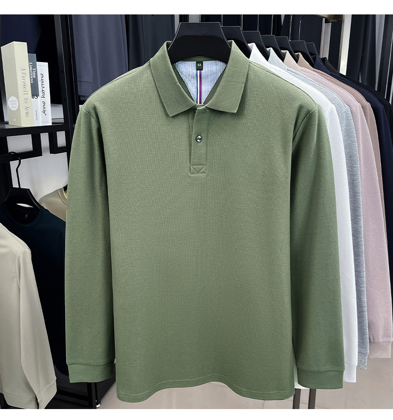 2025 봄과 가을 새로운 100 순수 면화 구슬 남성용 폴로 셔츠 비즈니스 캐주얼 단색 옷깃 긴 소매 티셔츠 남성용