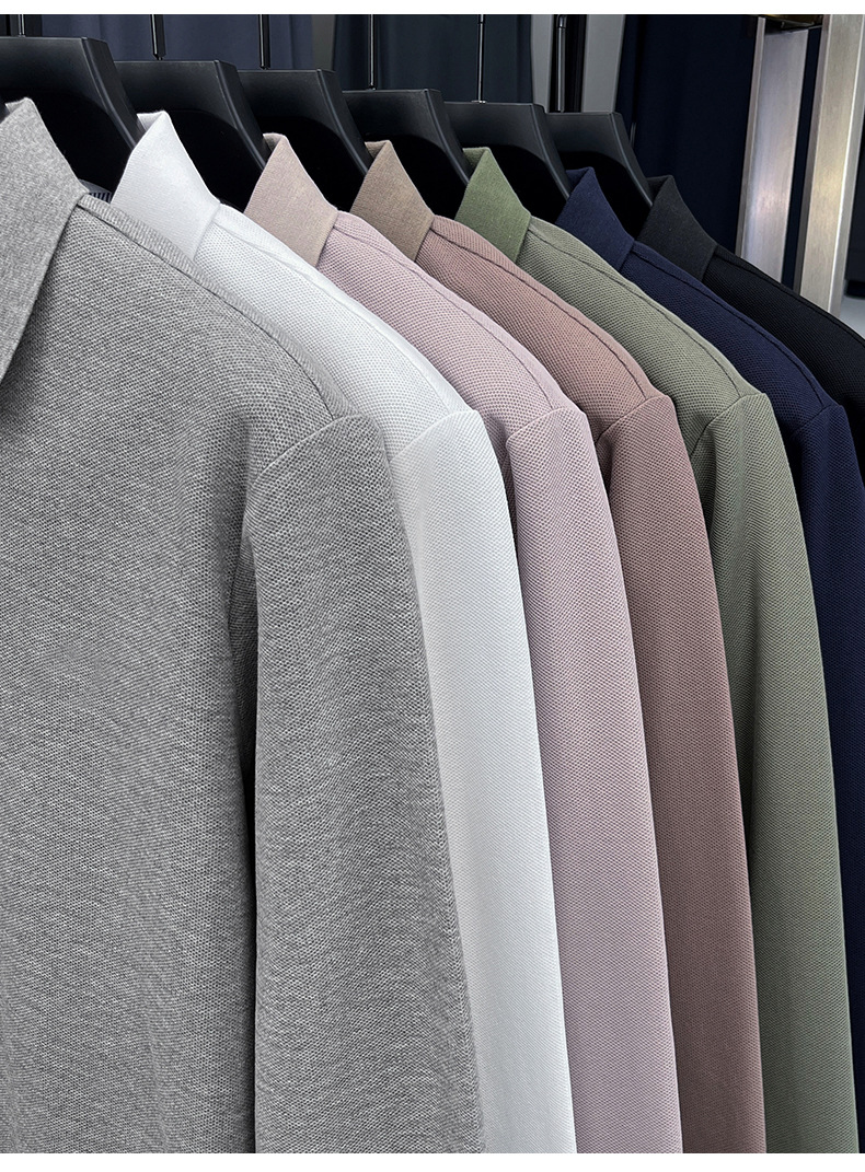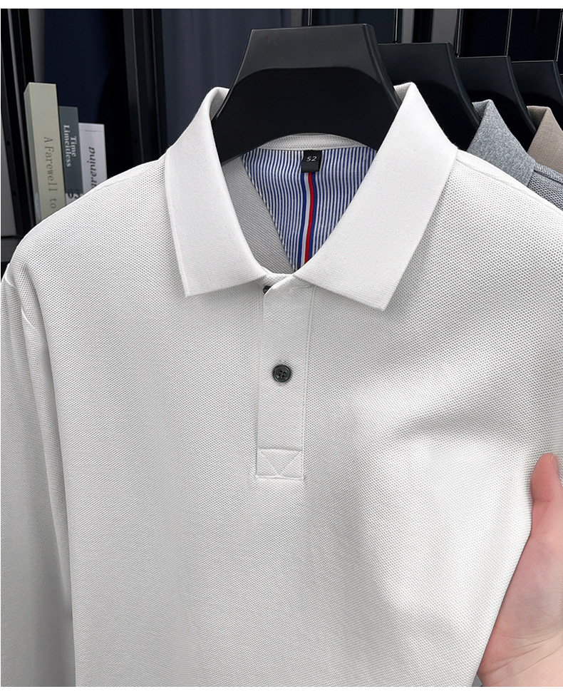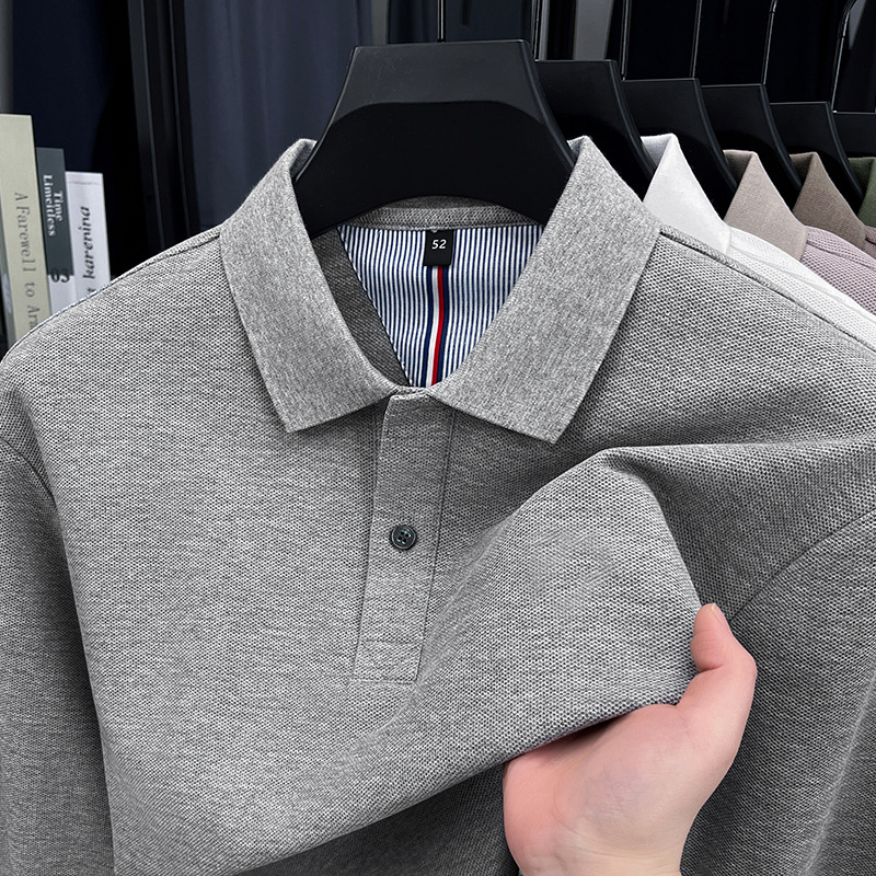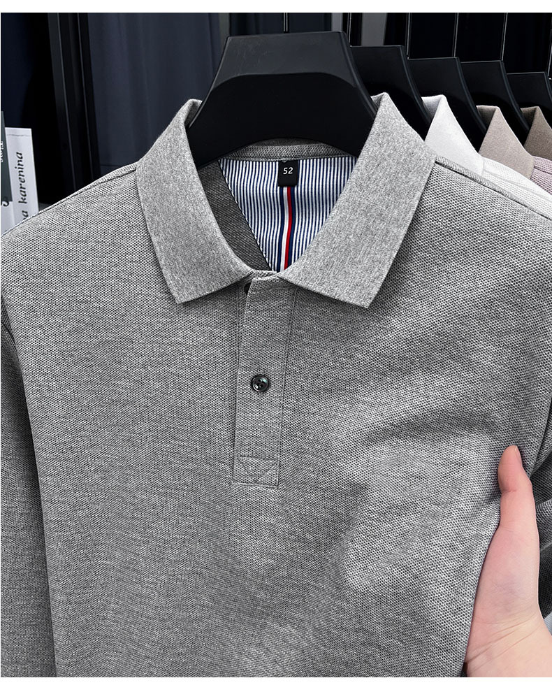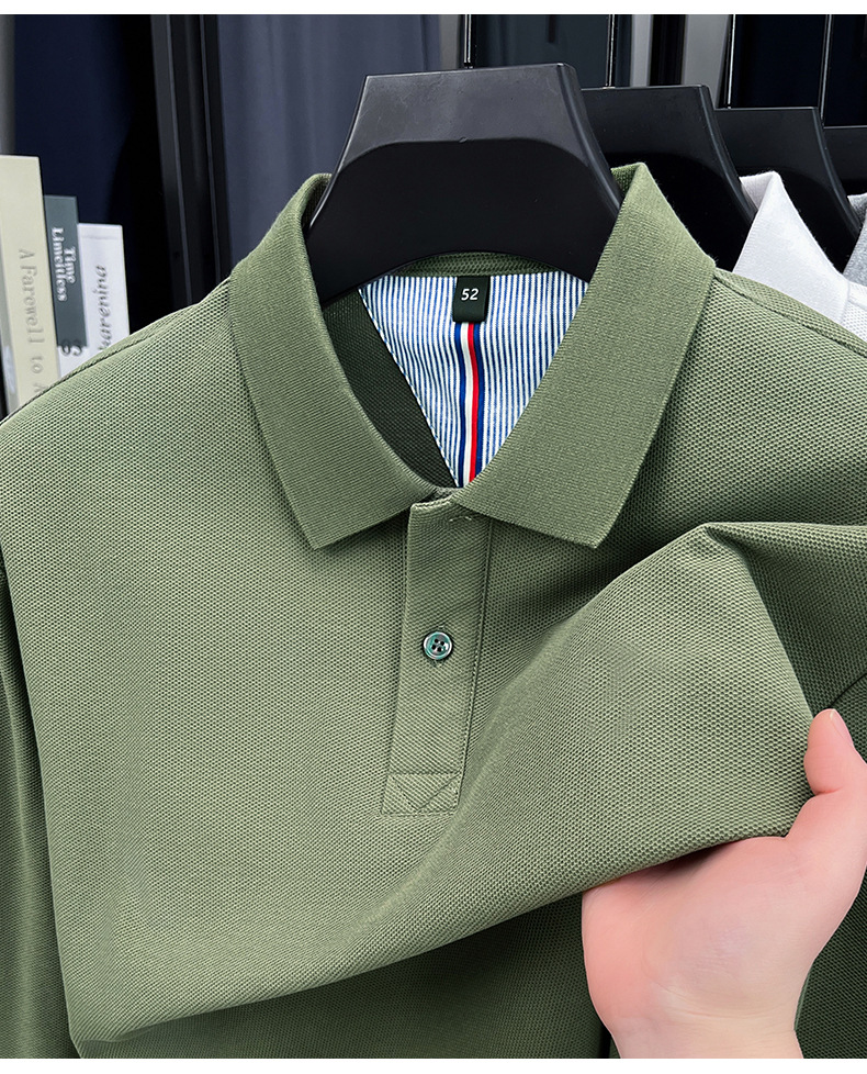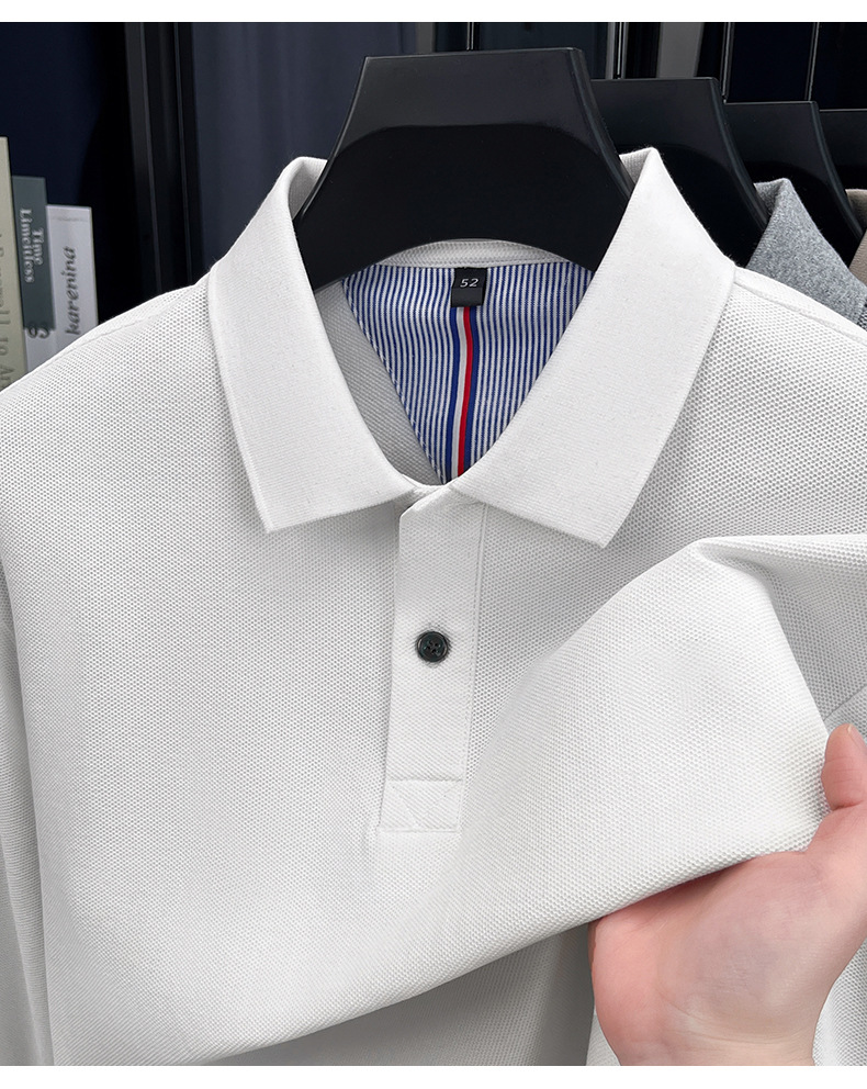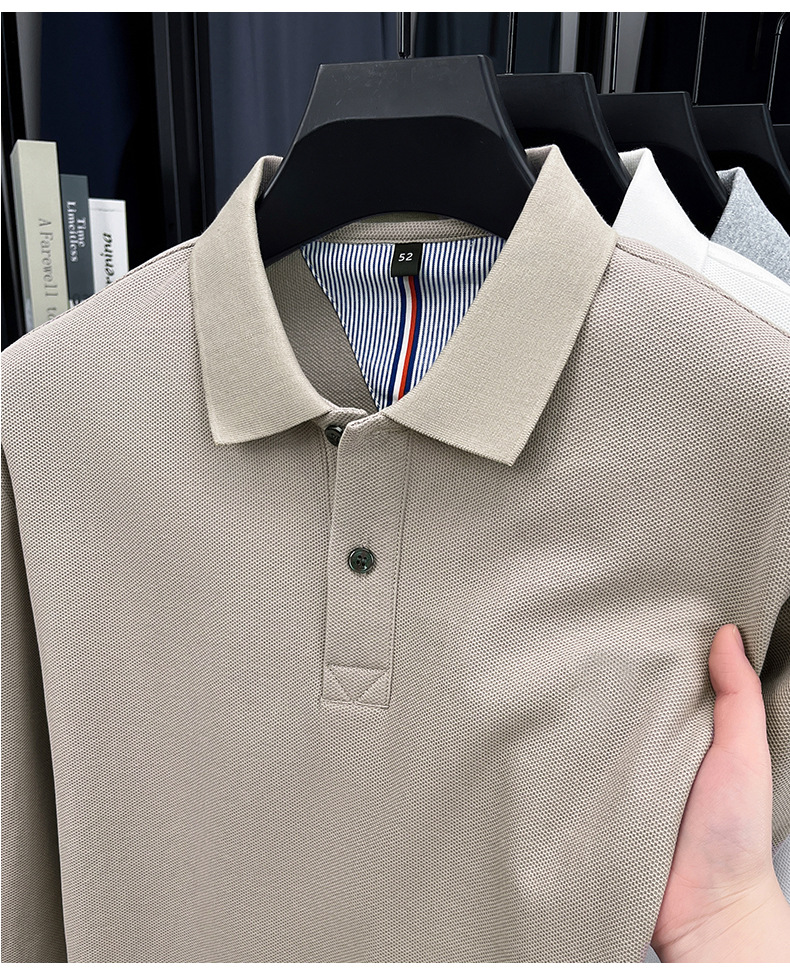 2025 봄과 가을 새로운 100 순수 면화 구슬 남성용 폴로 셔츠 비즈니스 캐주얼 단색 옷깃 긴 소매 티셔츠 남성용