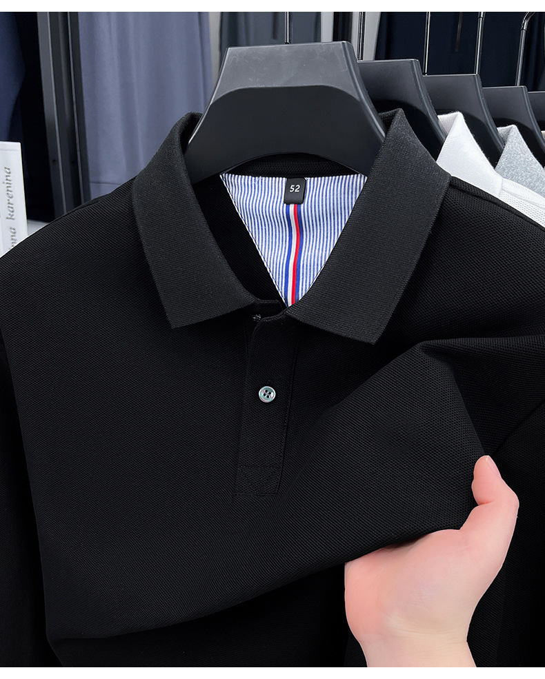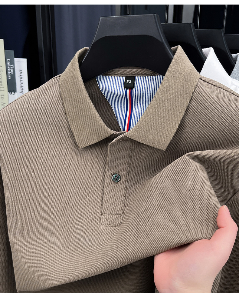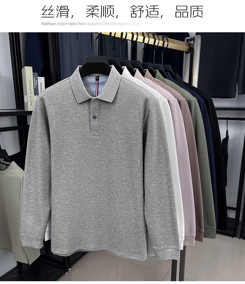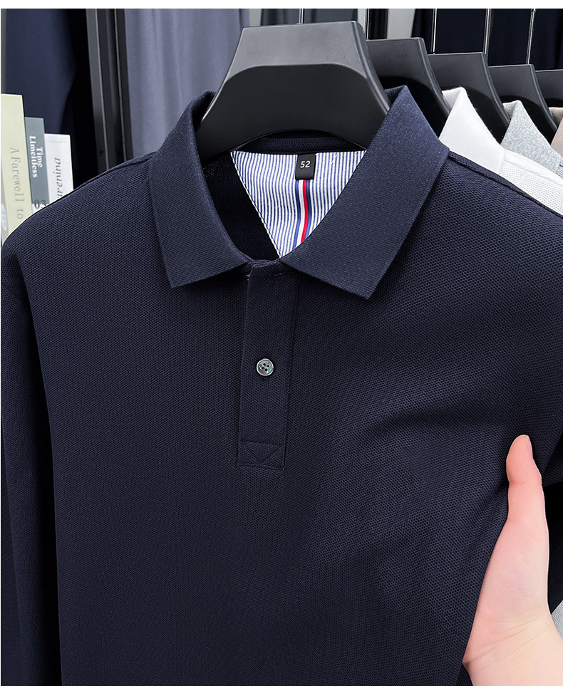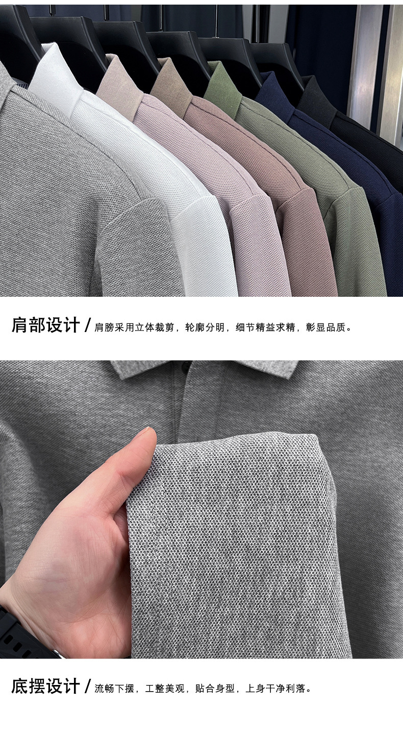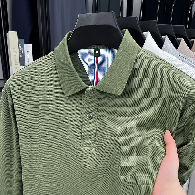 2025 봄과 가을 새로운 100 순수 면화 구슬 남성용 폴로 셔츠 비즈니스 캐주얼 단색 옷깃 긴 소매 티셔츠 남성용