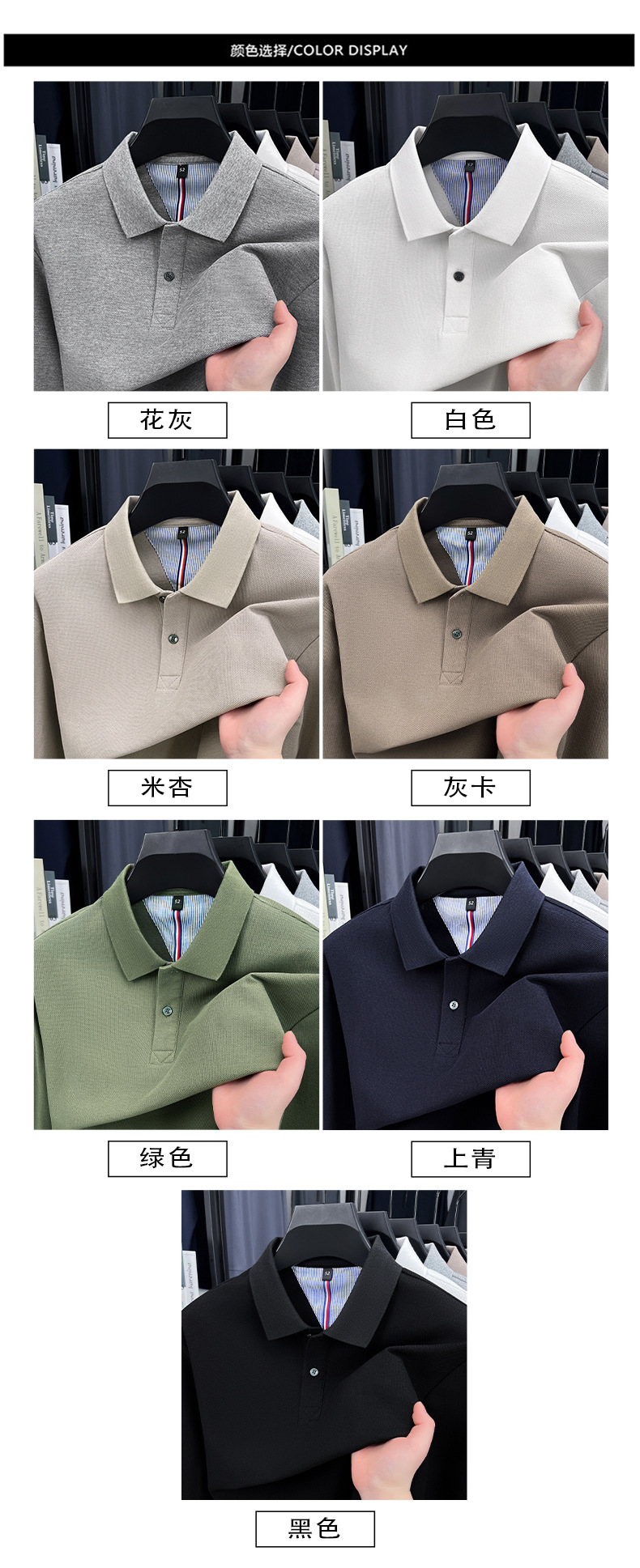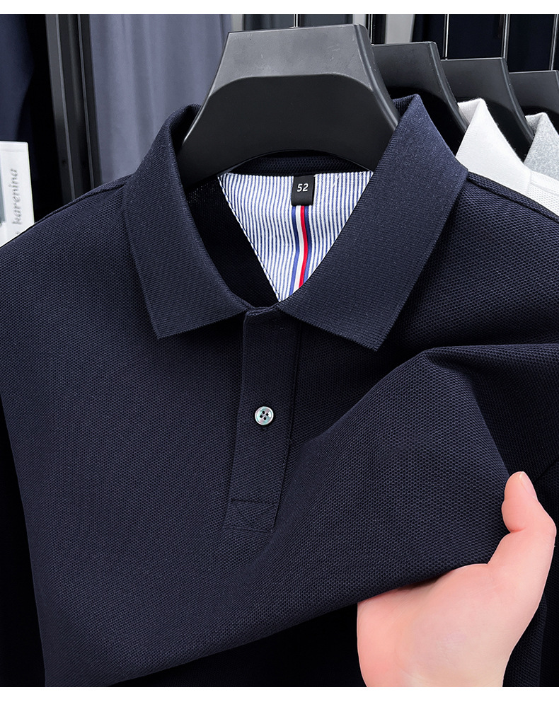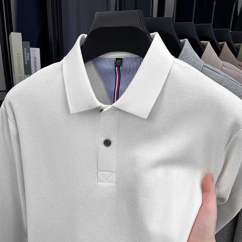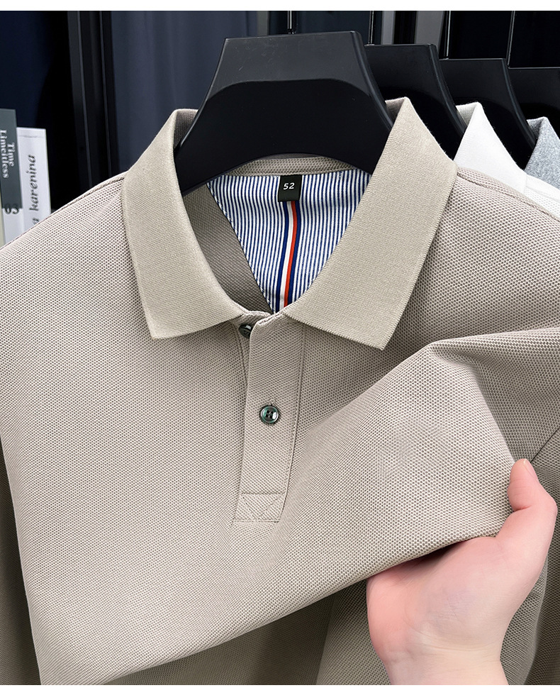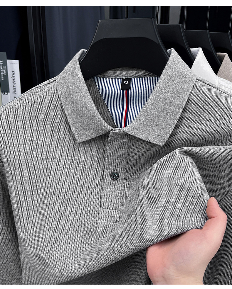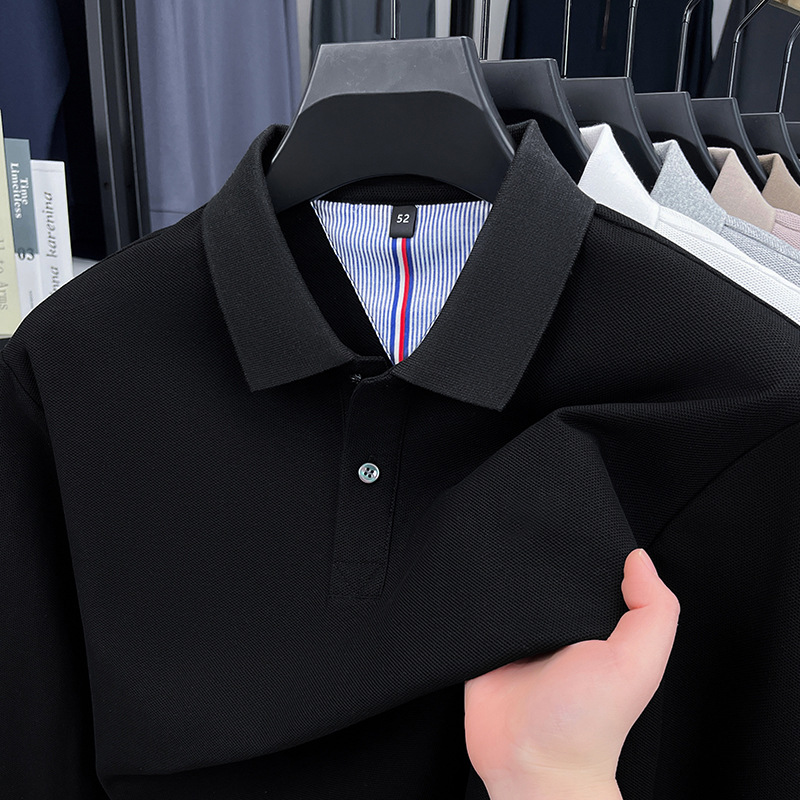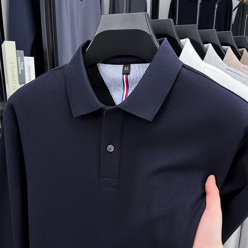 2025 봄과 가을 새로운 100 순수 면화 구슬 남성용 폴로 셔츠 비즈니스 캐주얼 단색 옷깃 긴 소매 티셔츠 남성용