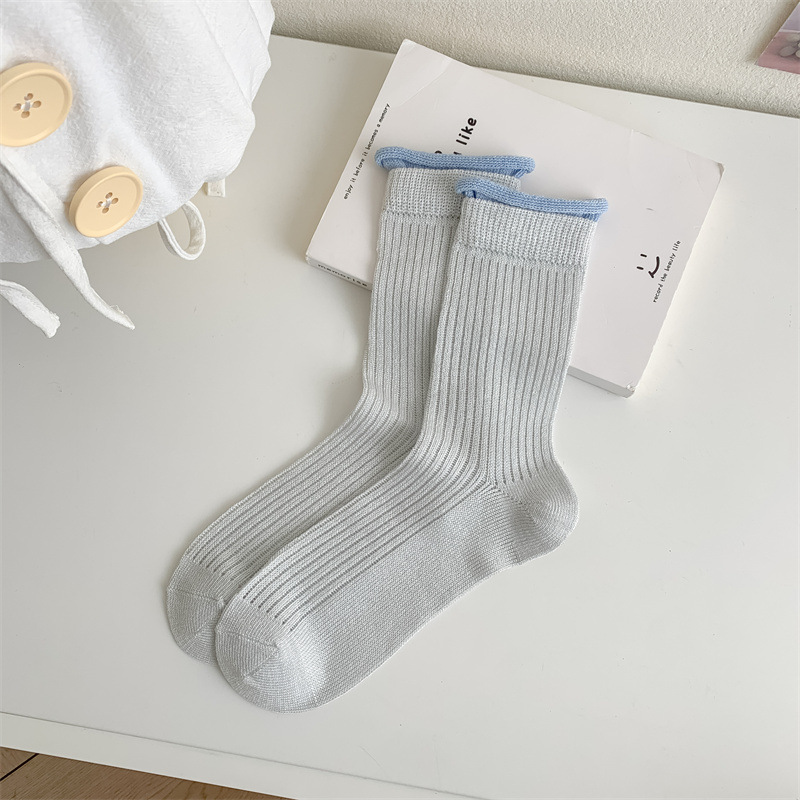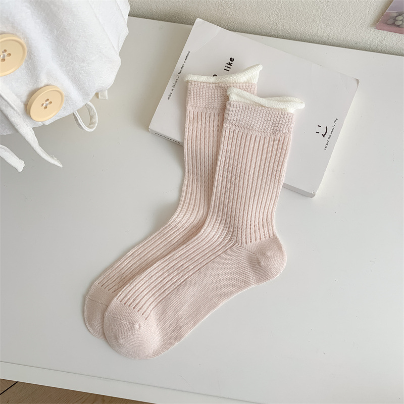 미우 바람 봄 얇은 단색 수직 스트립 더미 양말 컬러 더블 양말 입 튜브 여성 양말