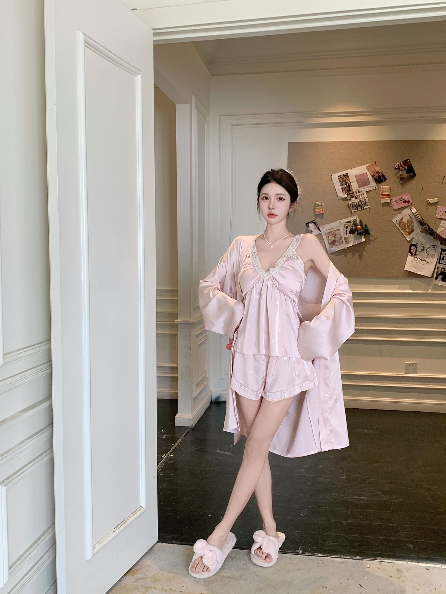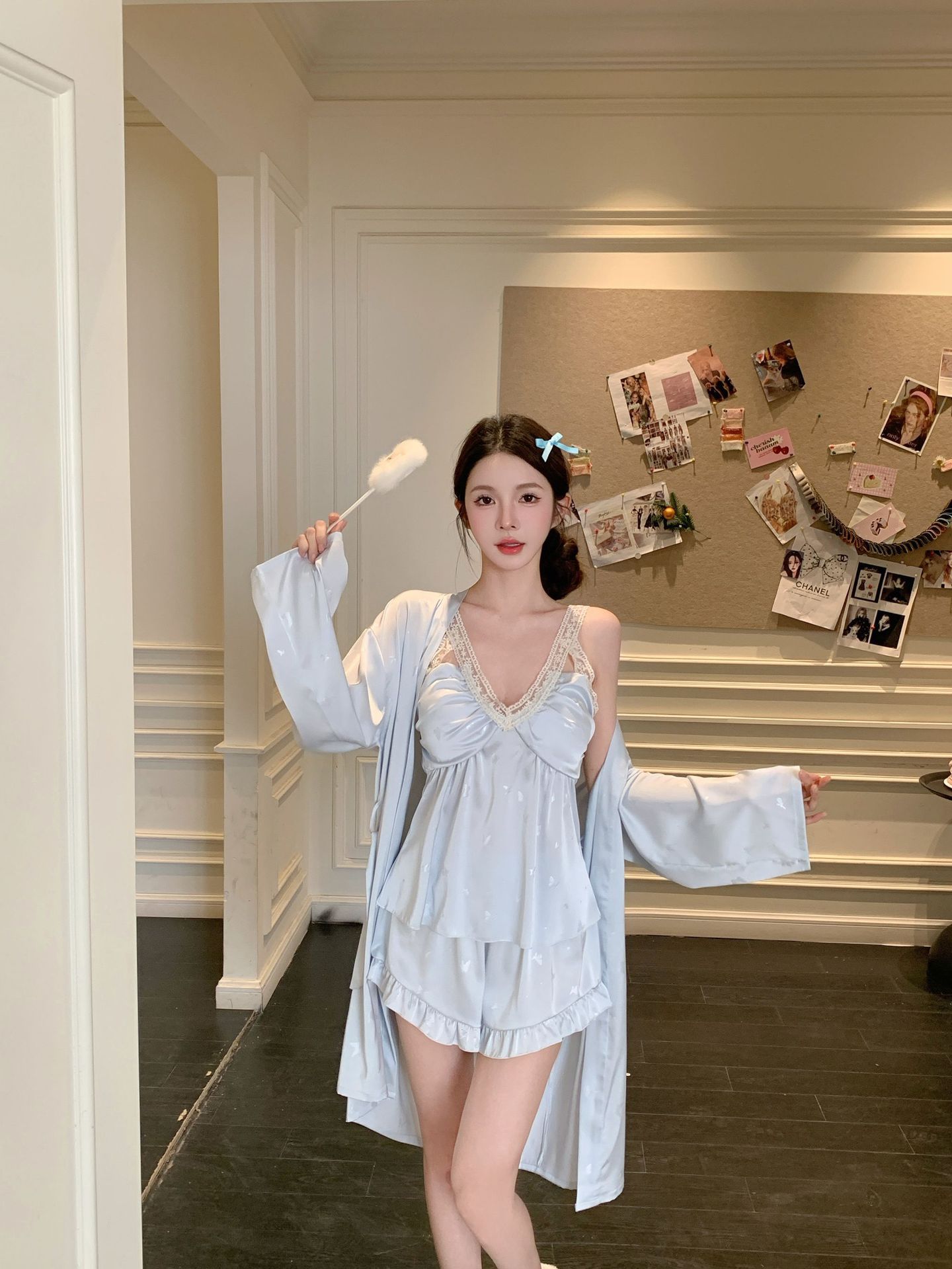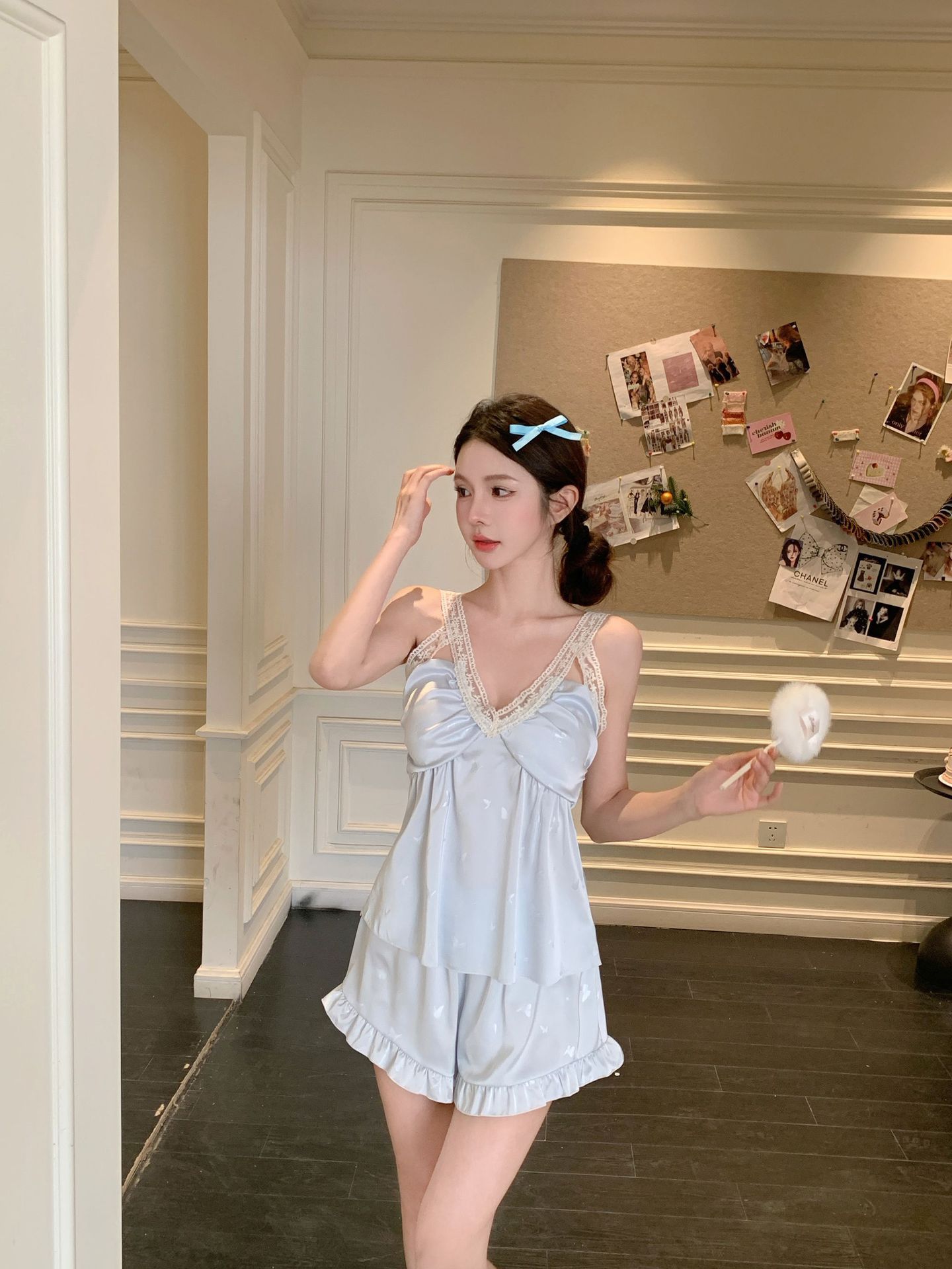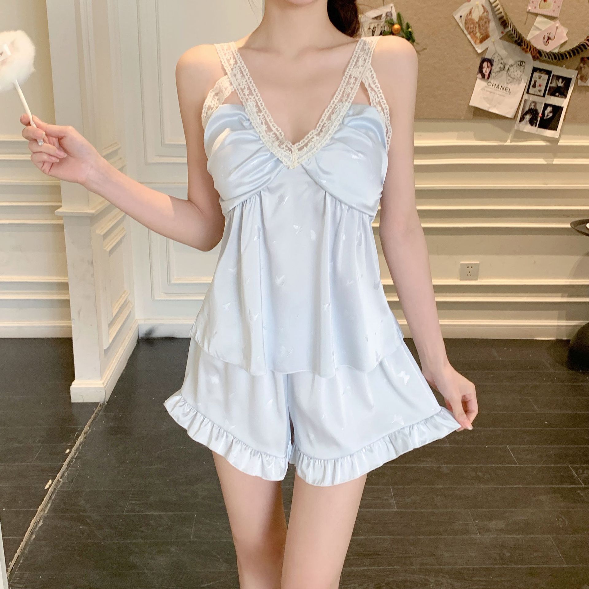 여름 섹시한 V 넥 슬링 반바지 파자마 3 종 세트 여성 스위트 아이스 실크 쿨 홈 의류 Ins 스타일스토어 가기
