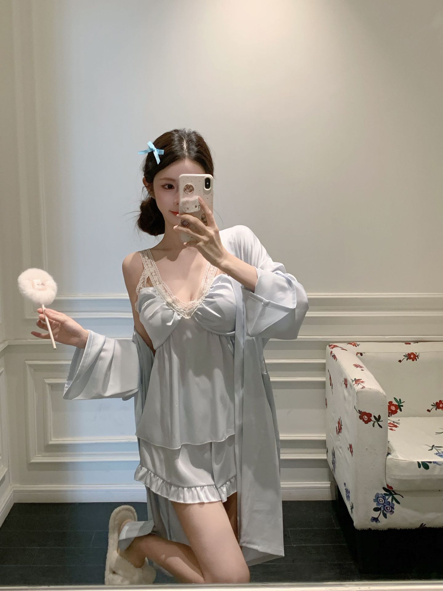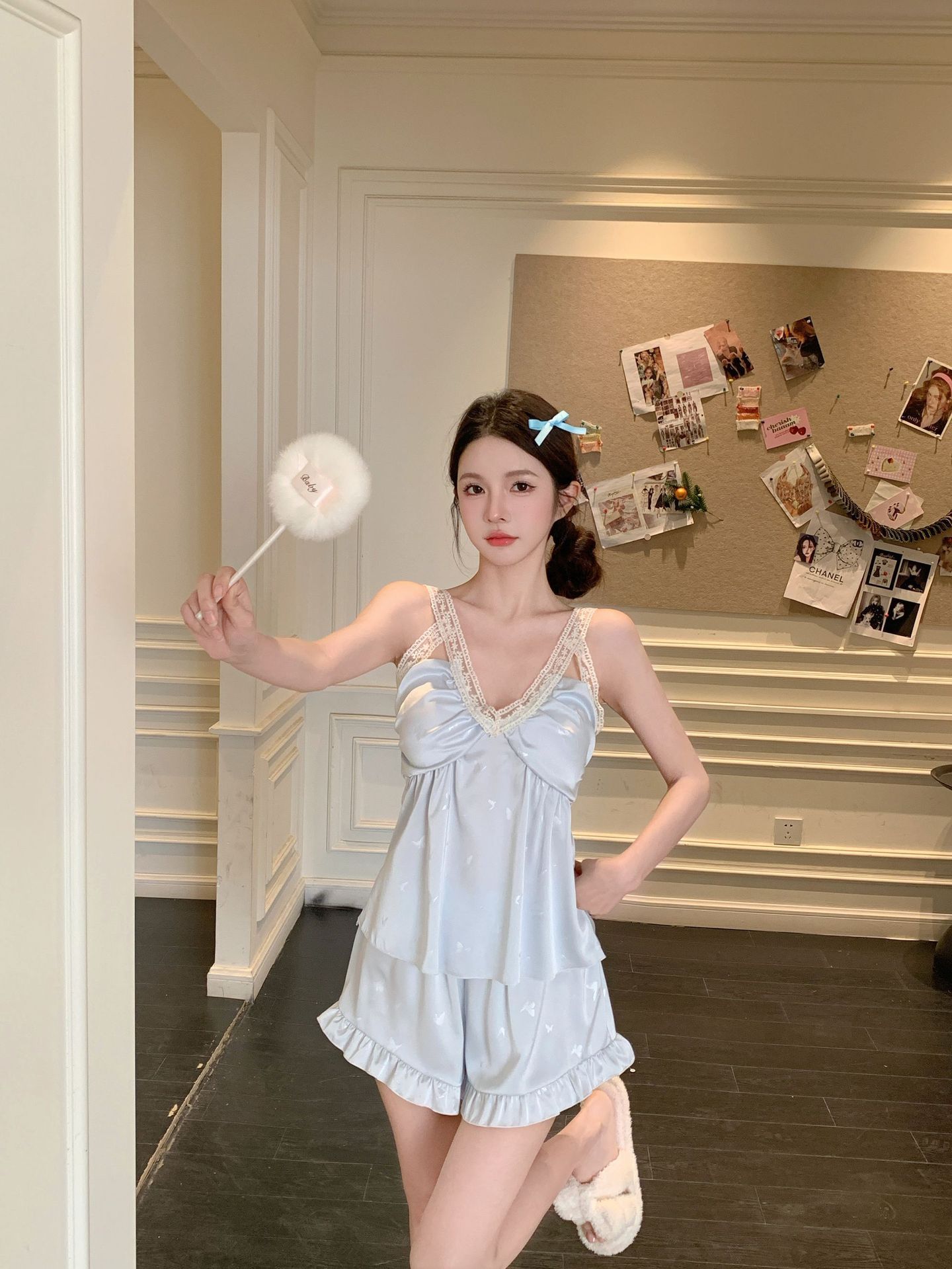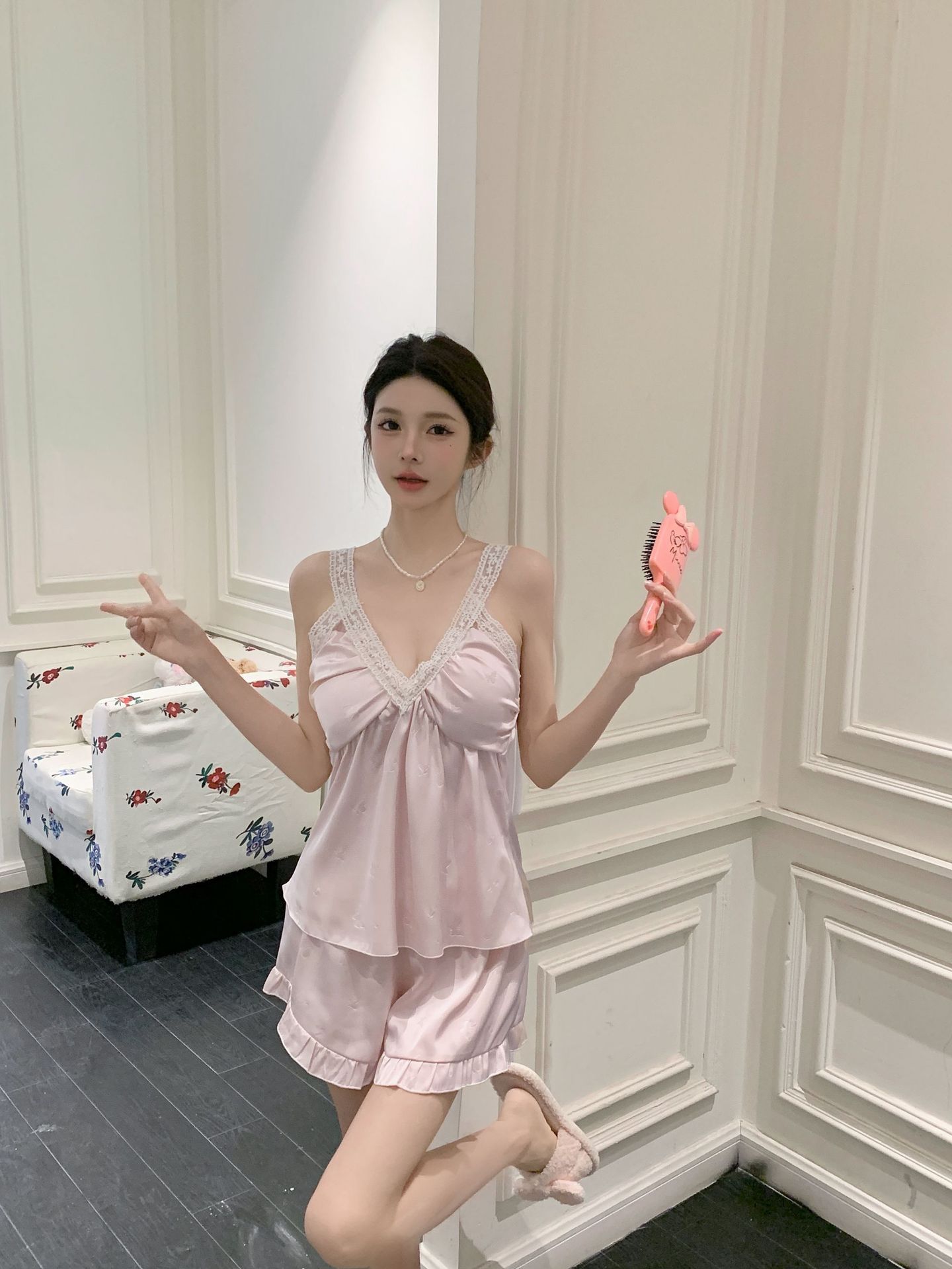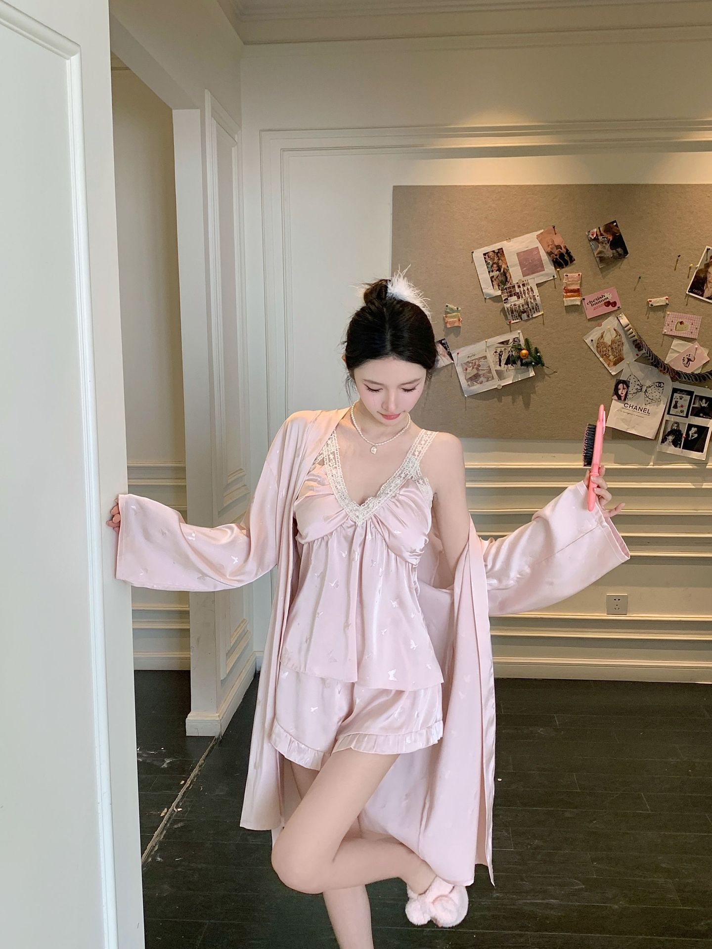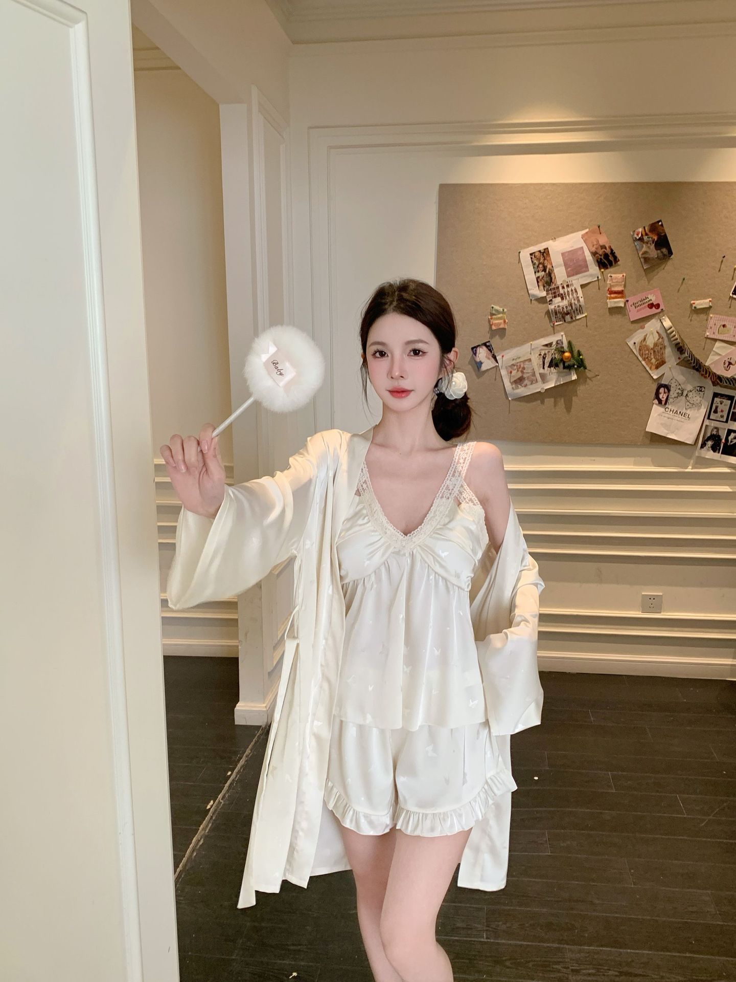 여름 섹시한 V 넥 슬링 반바지 파자마 3 종 세트 여성 스위트 아이스 실크 쿨 홈 의류 Ins 스타일스토어 가기