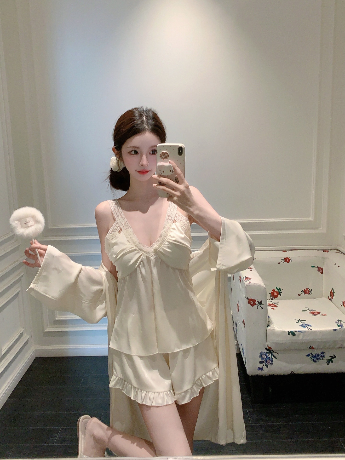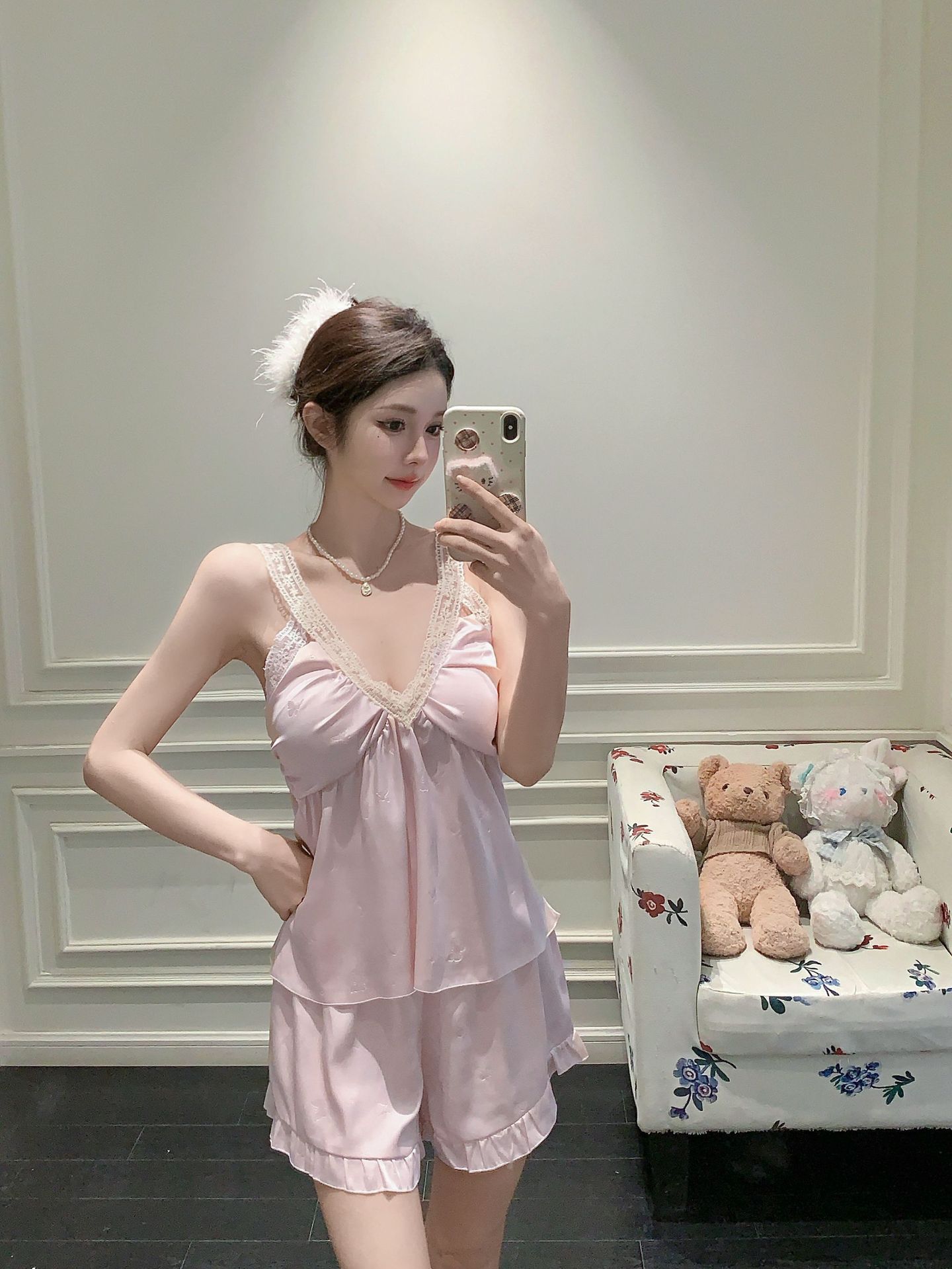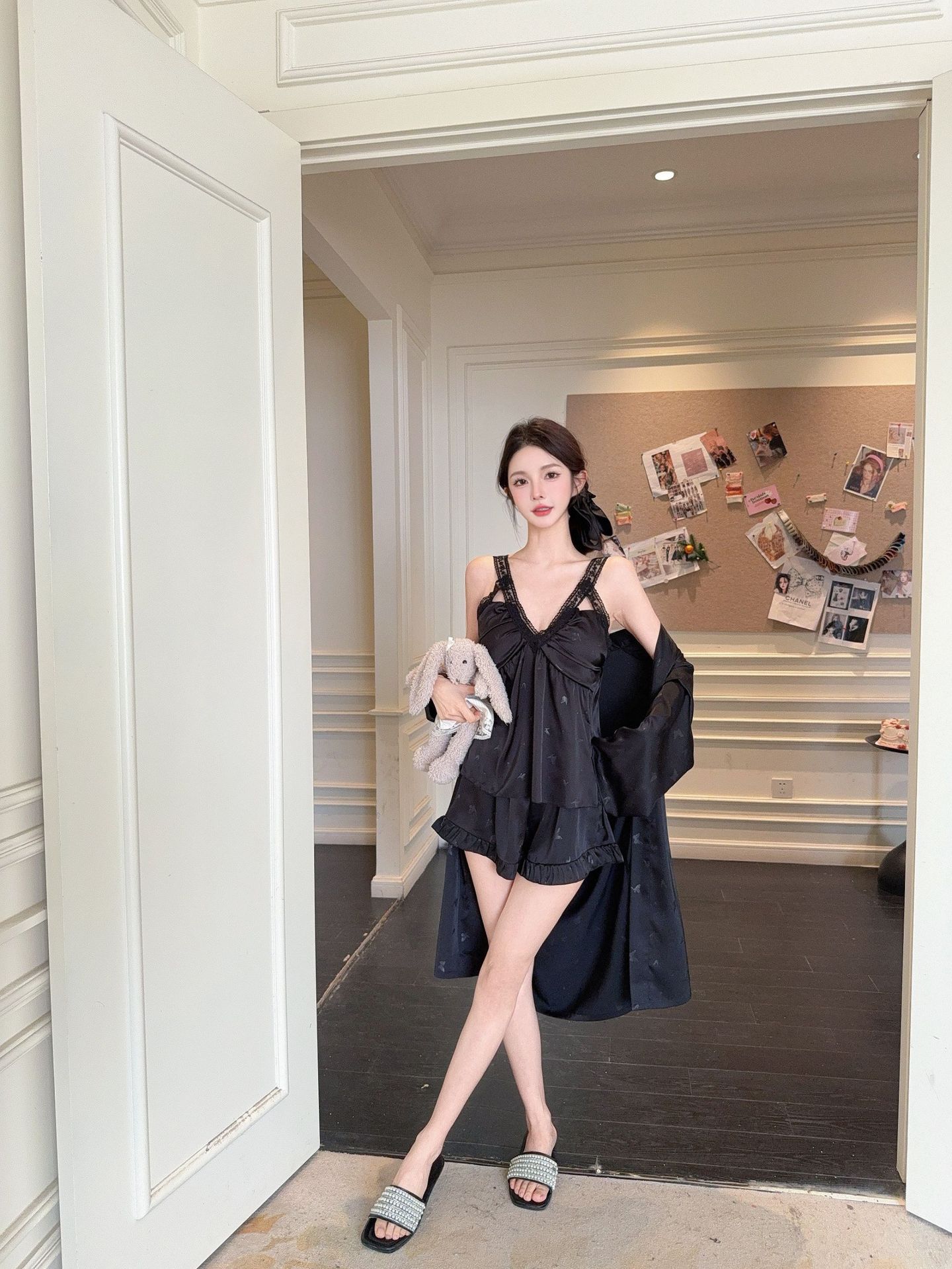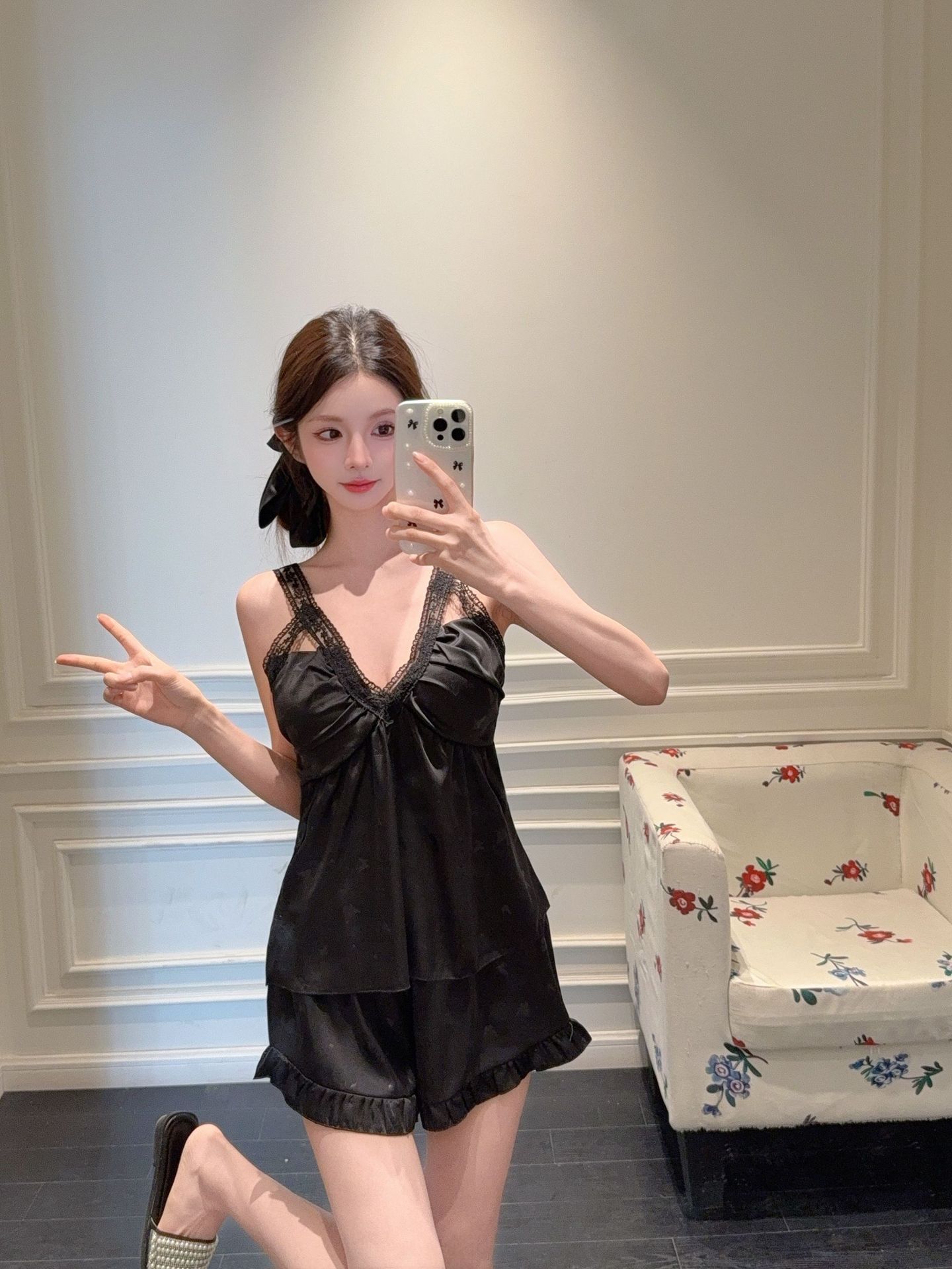 여름 섹시한 V 넥 슬링 반바지 파자마 3 종 세트 여성 스위트 아이스 실크 쿨 홈 의류 Ins 스타일스토어 가기