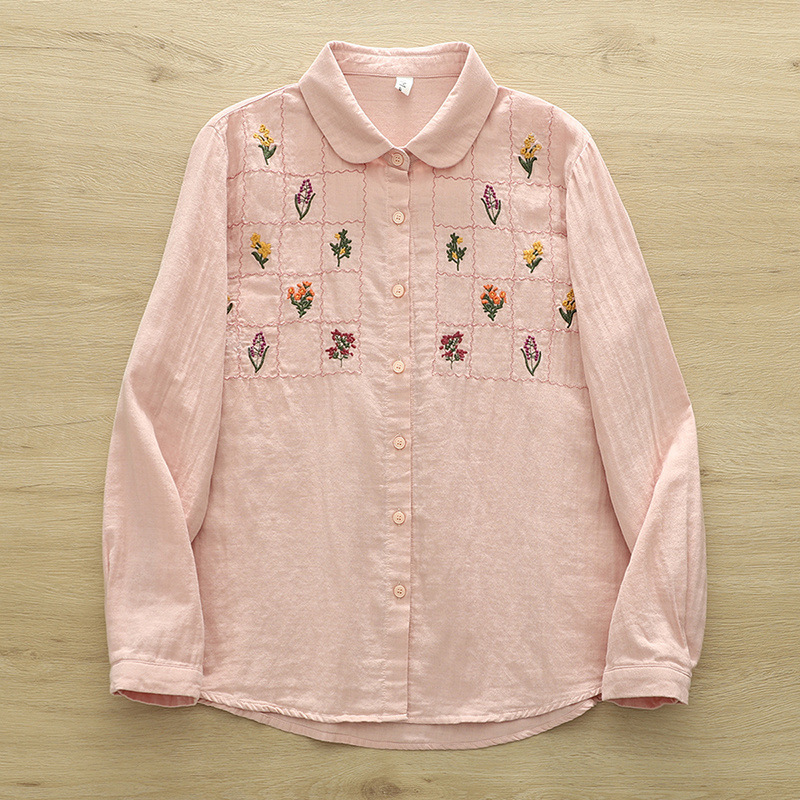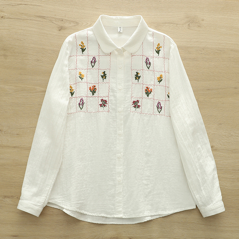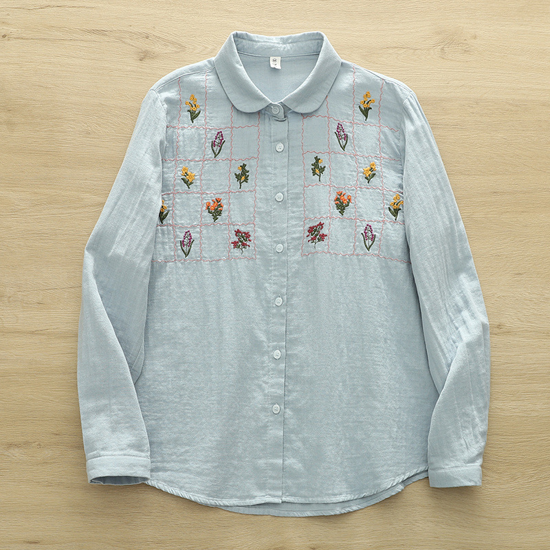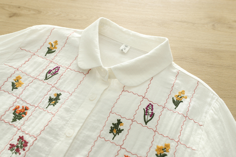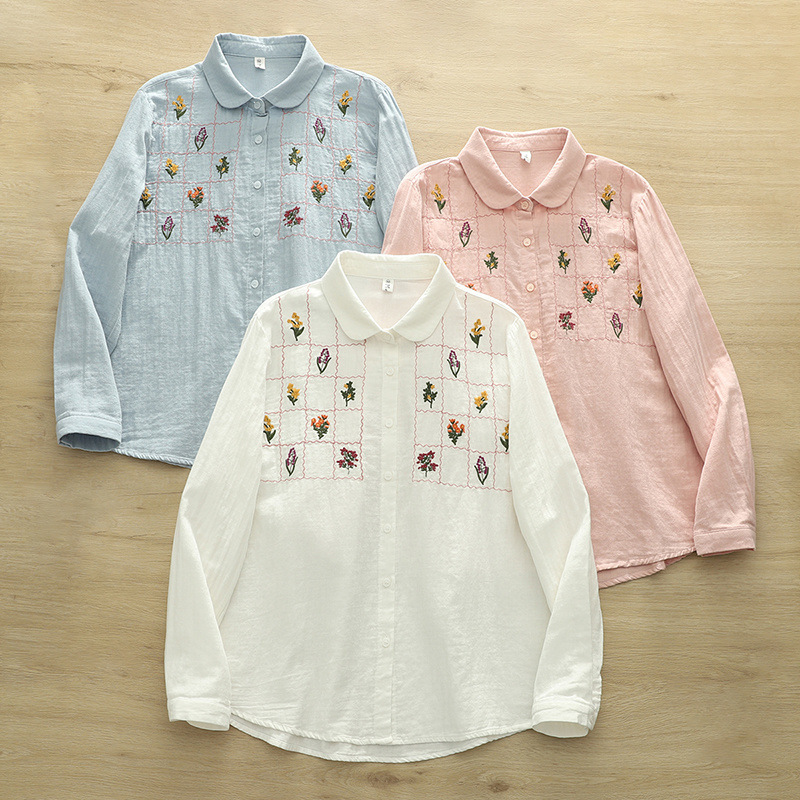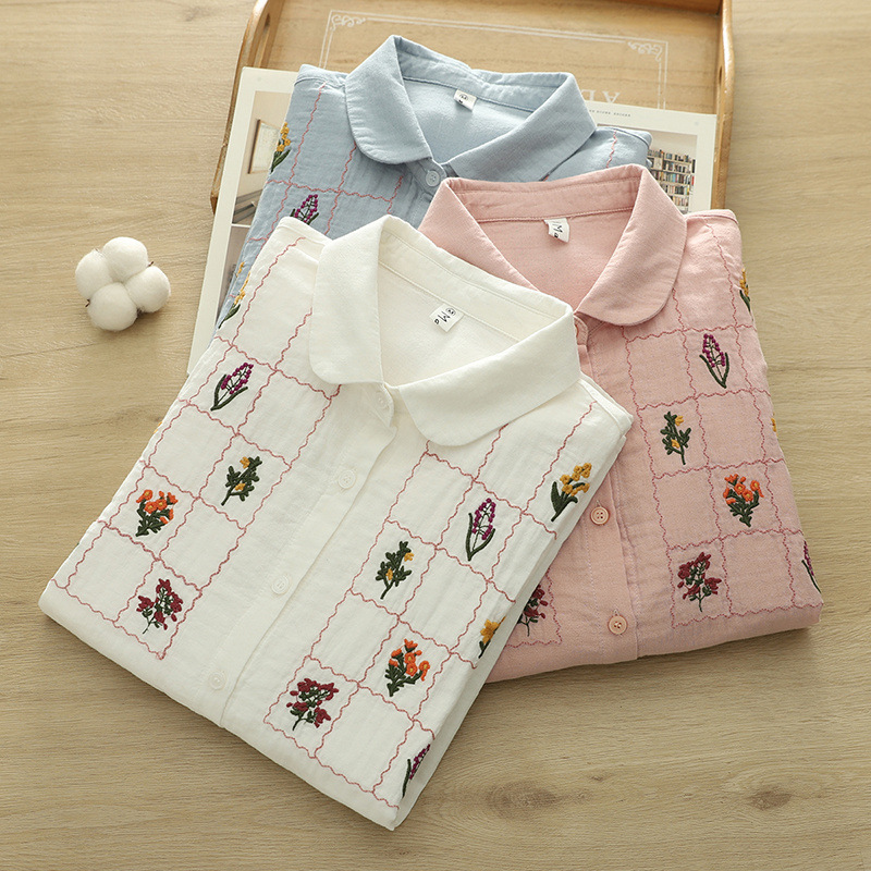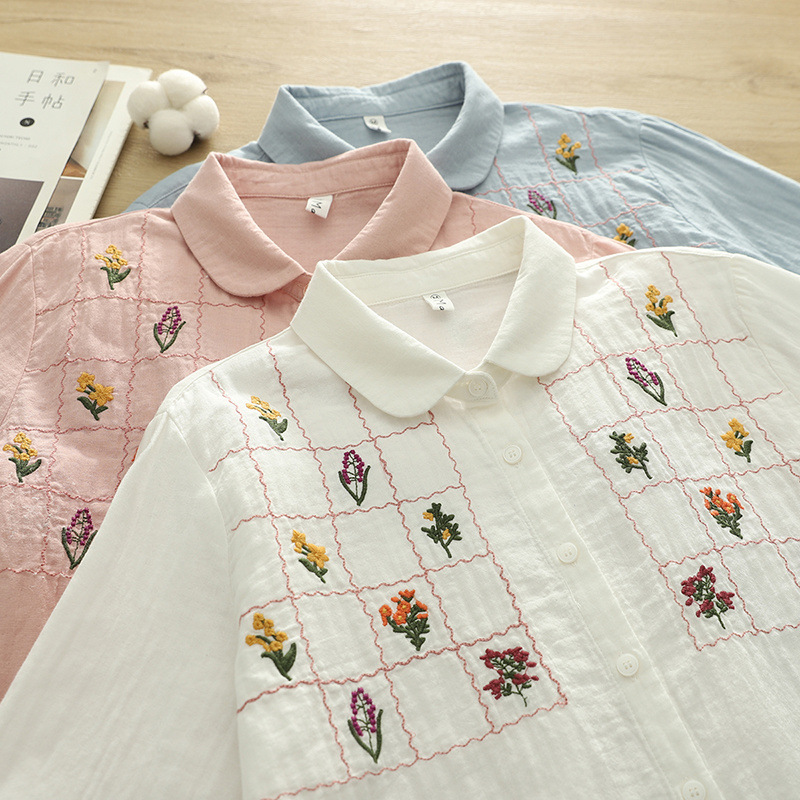 일본 스타일 신선한 스타일 격자 무늬 자수 꽃 여성 카디건 더블 원사 긴 소매 셔츠 도매 패션