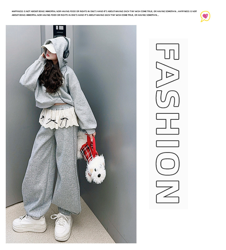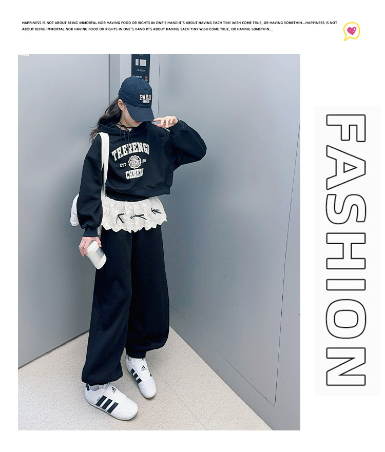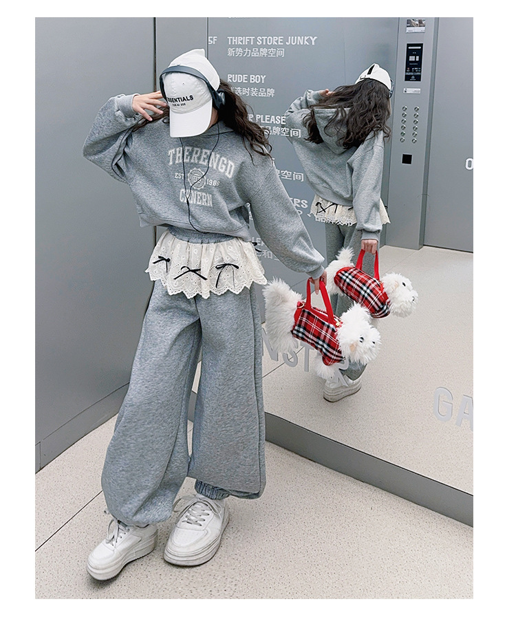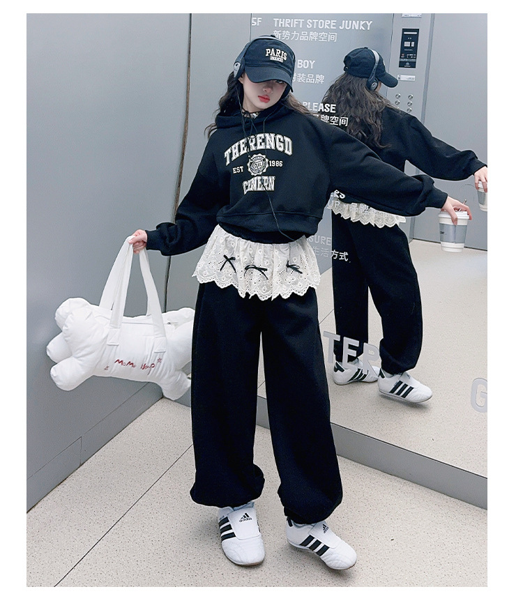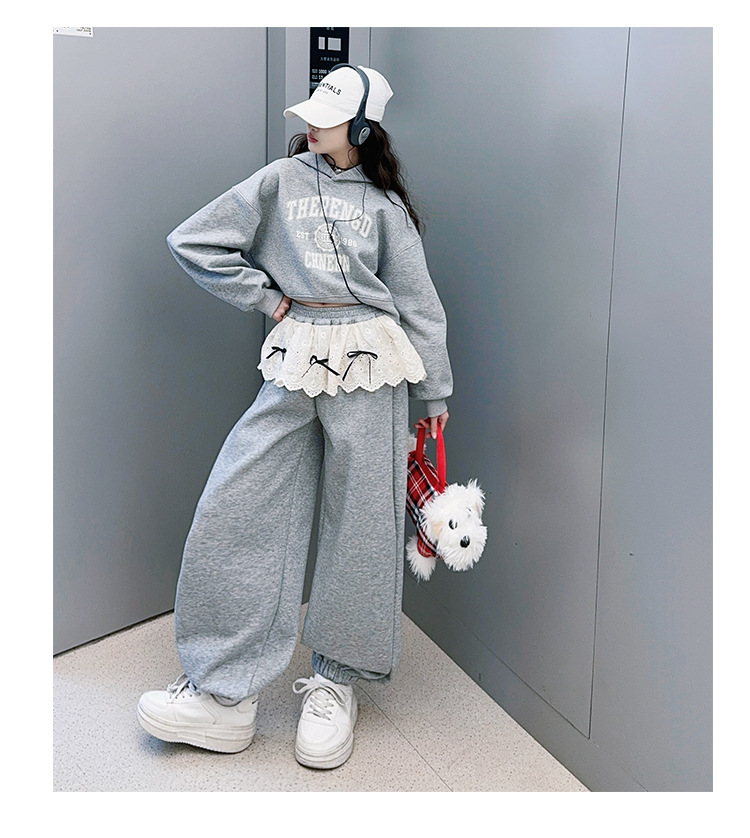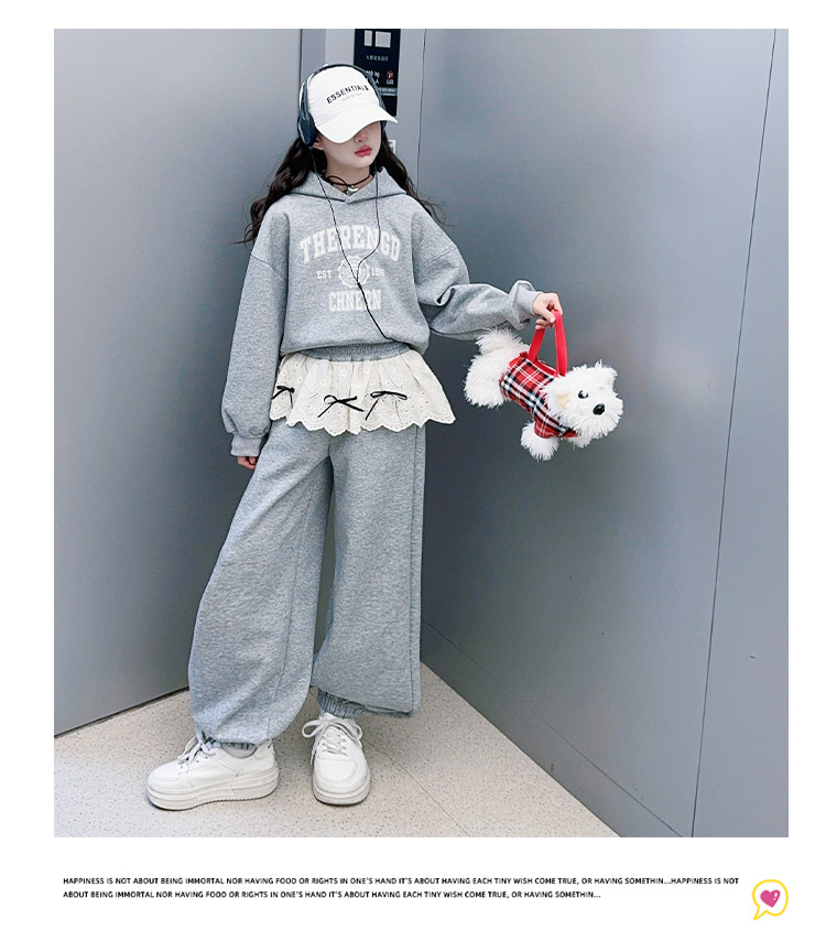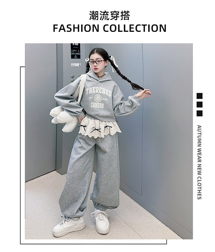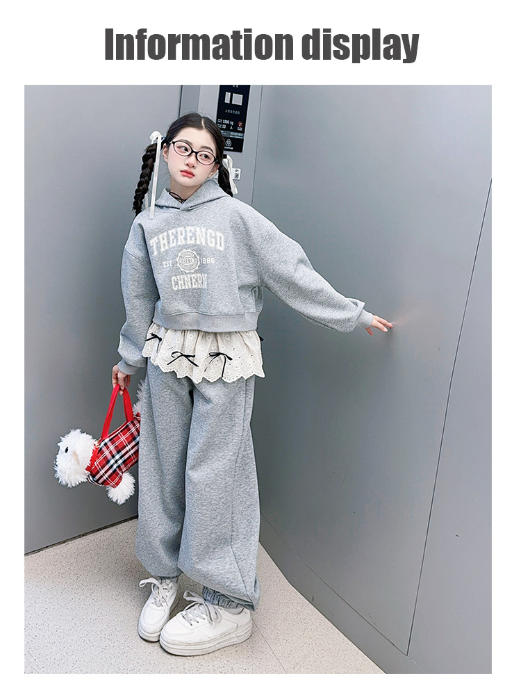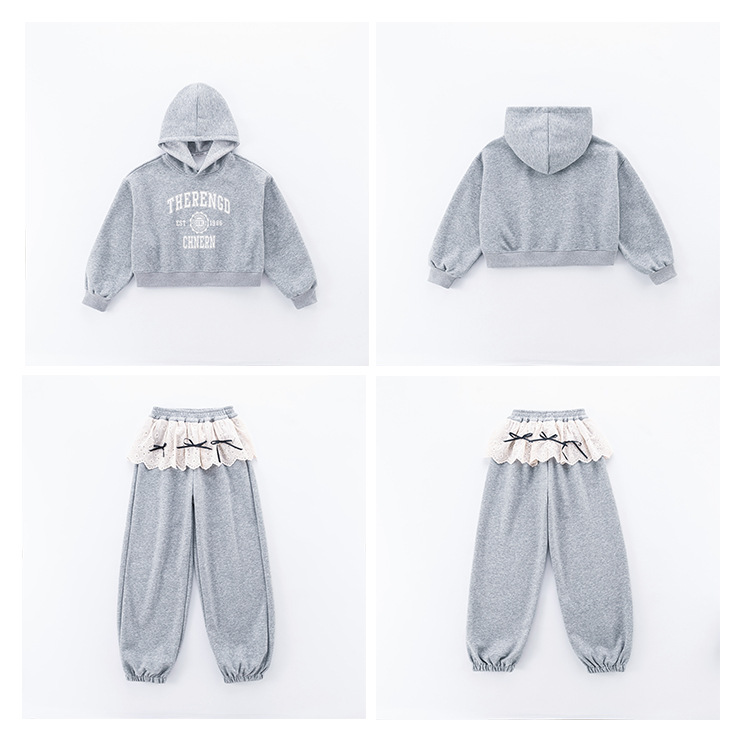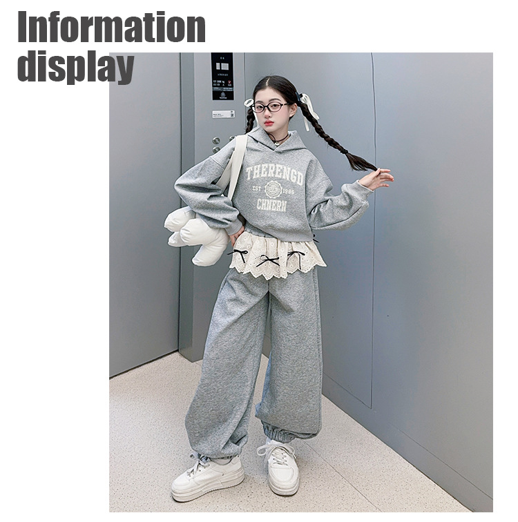 소녀의 봄과 가을 세트 큰 어린이 레이스 바느질 레이스 후디 소녀의 세련된 운동복 2 피스 세트스토어 가기