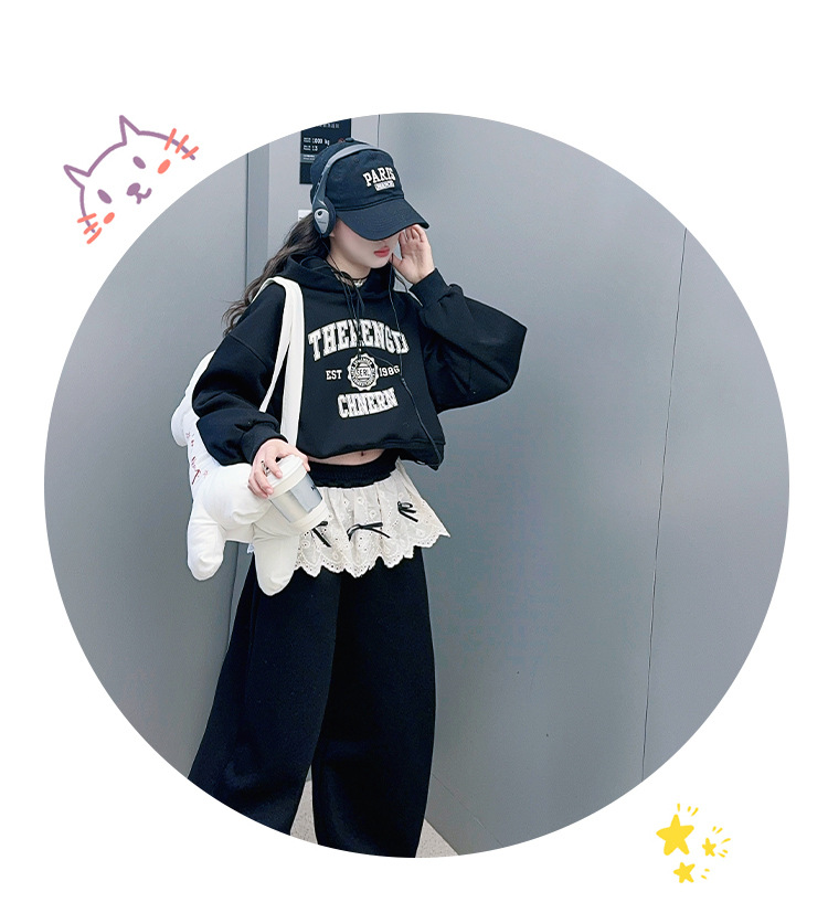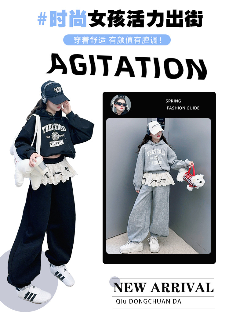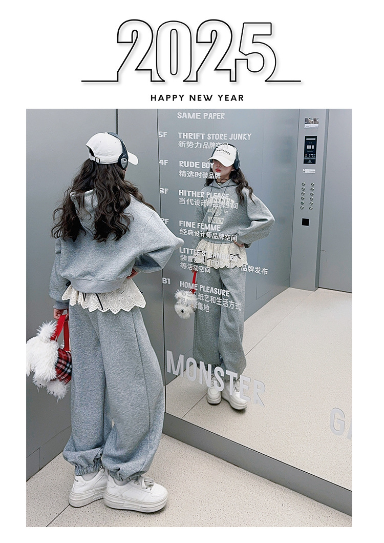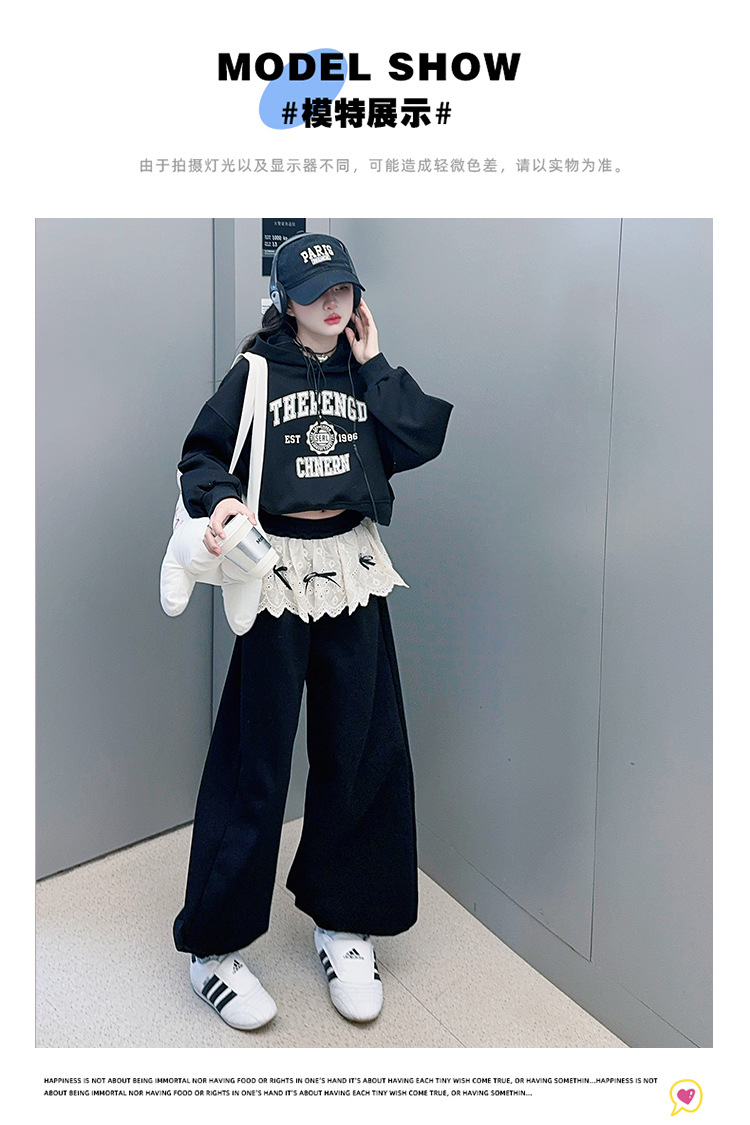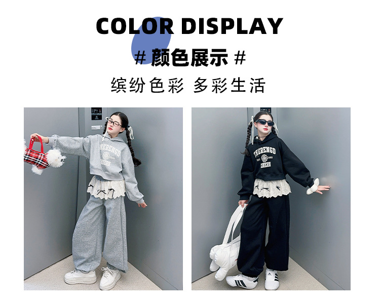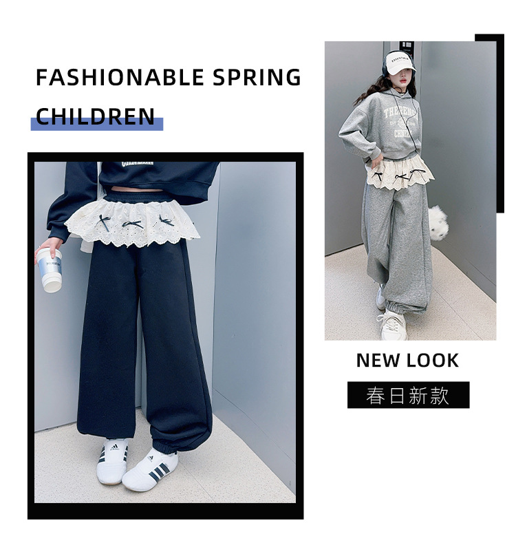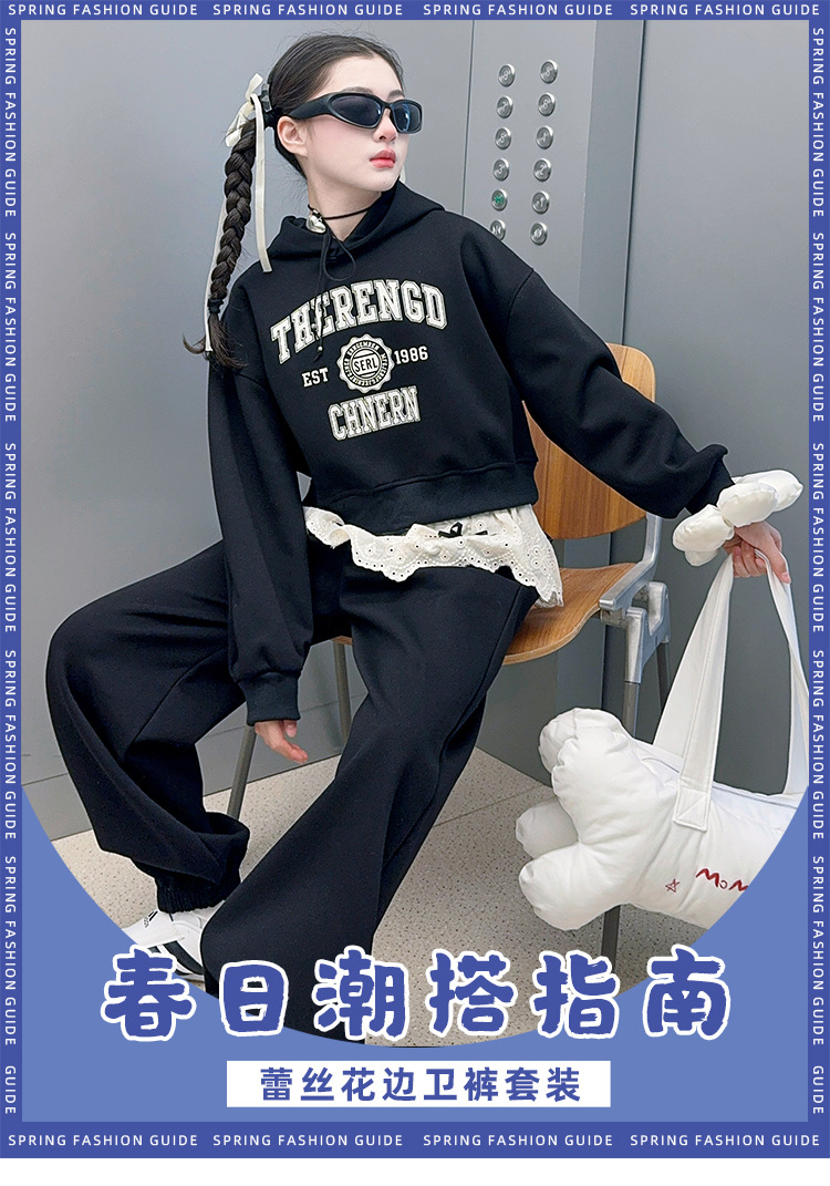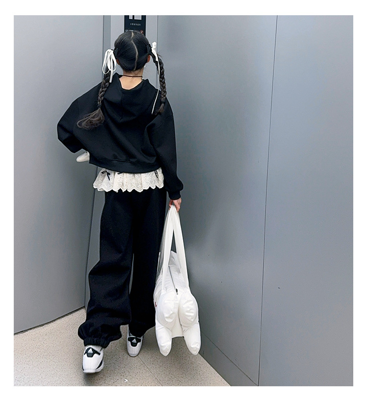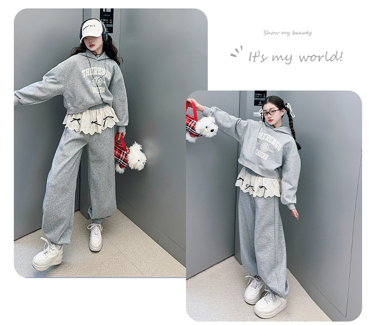 소녀의 봄과 가을 세트 큰 어린이 레이스 바느질 레이스 후디 소녀의 세련된 운동복 2 피스 세트스토어 가기