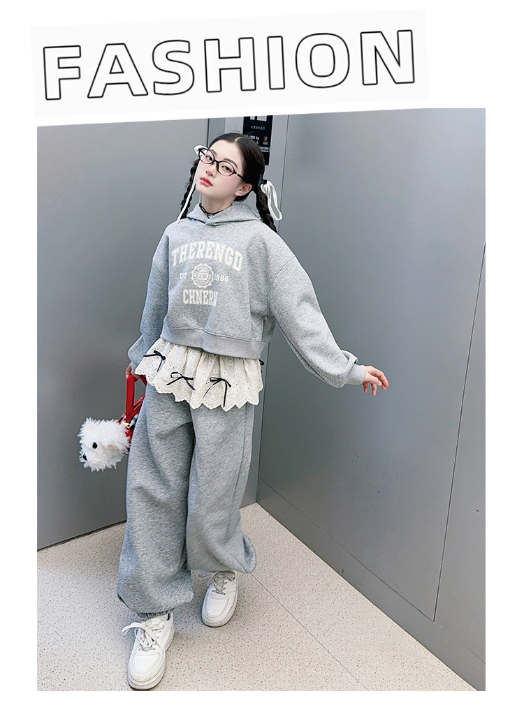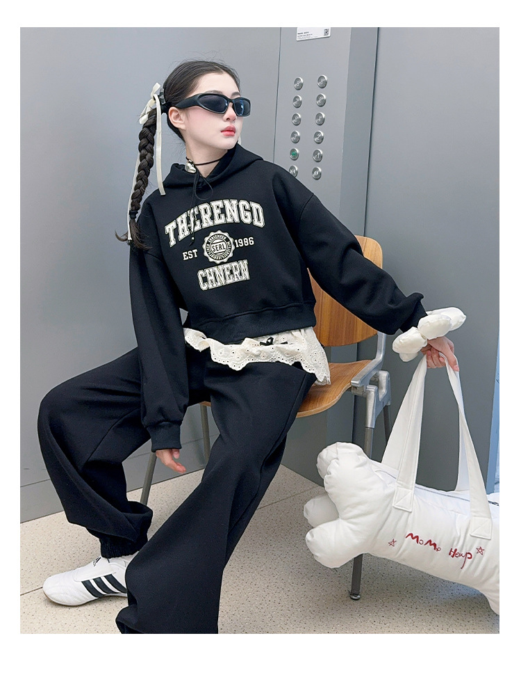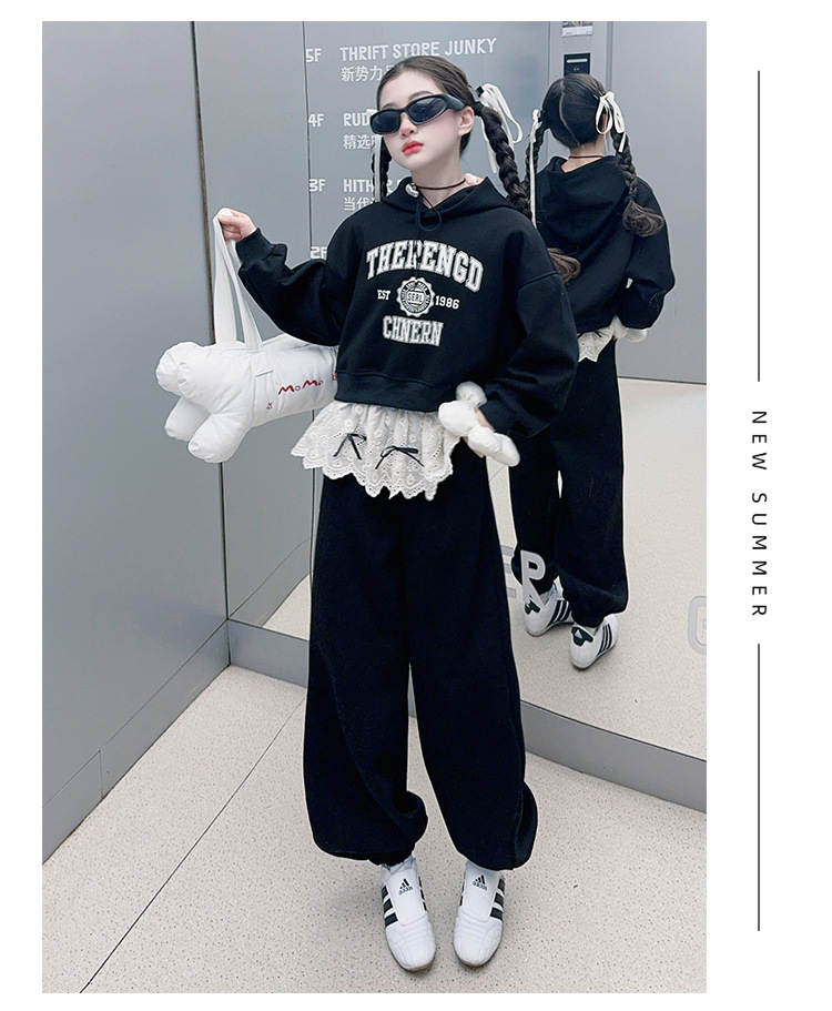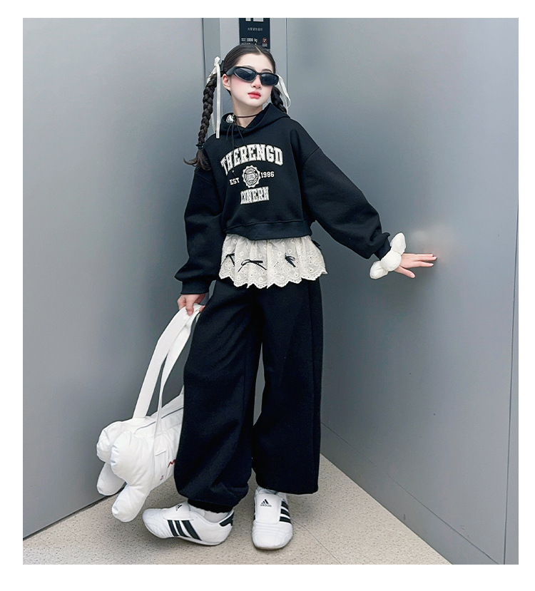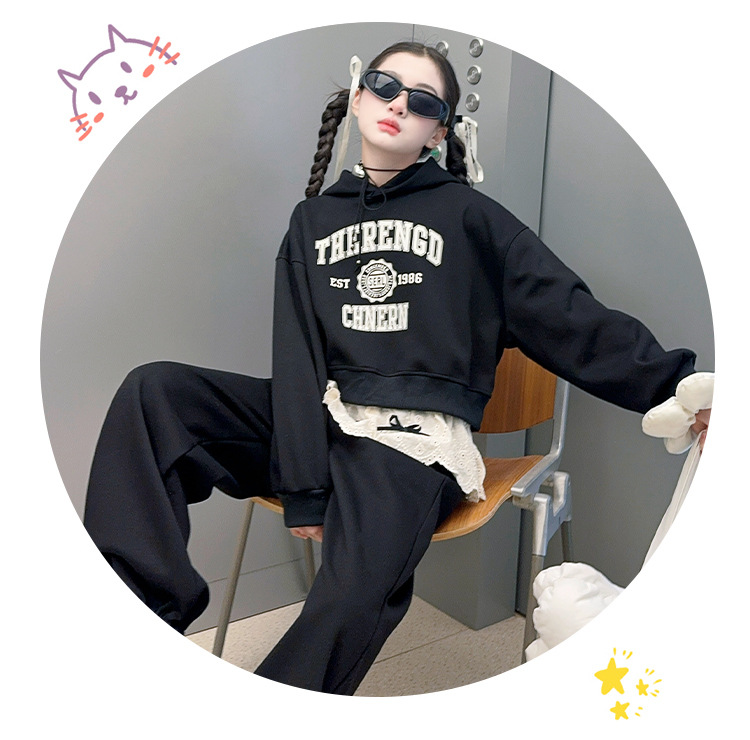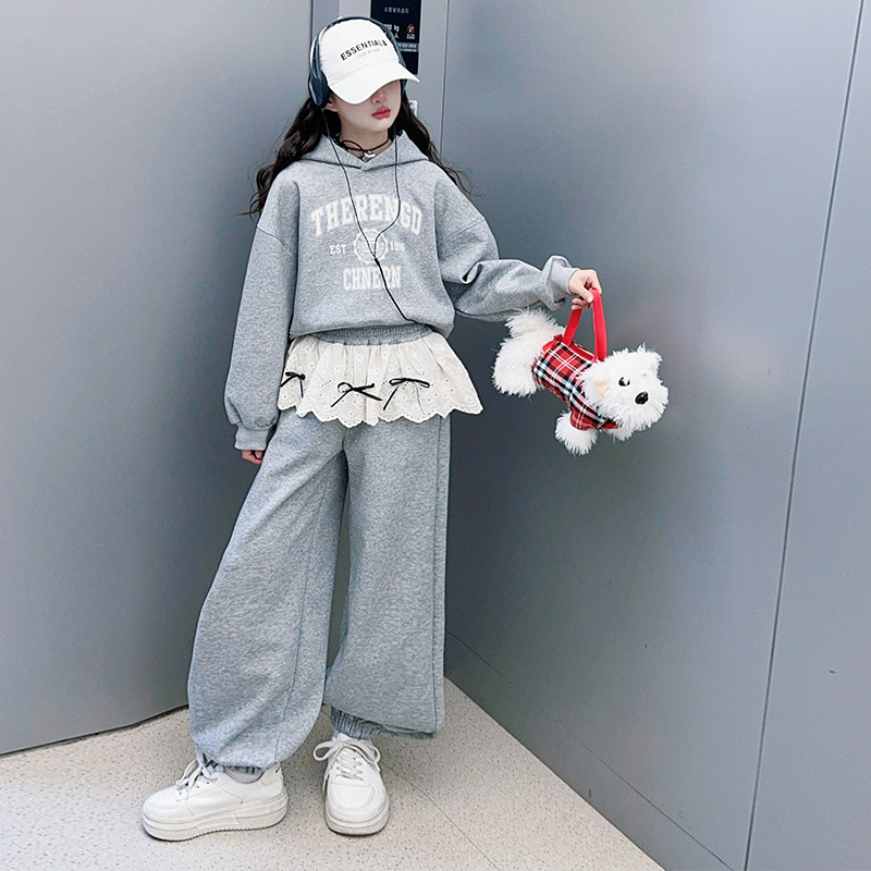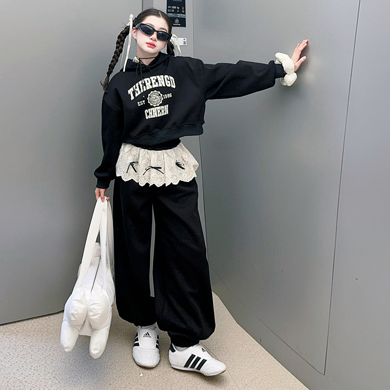 소녀의 봄과 가을 세트 큰 어린이 레이스 바느질 레이스 후디 소녀의 세련된 운동복 2 피스 세트