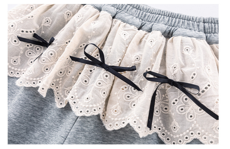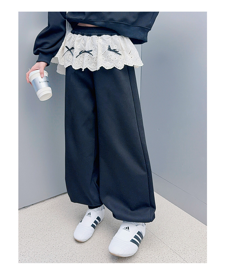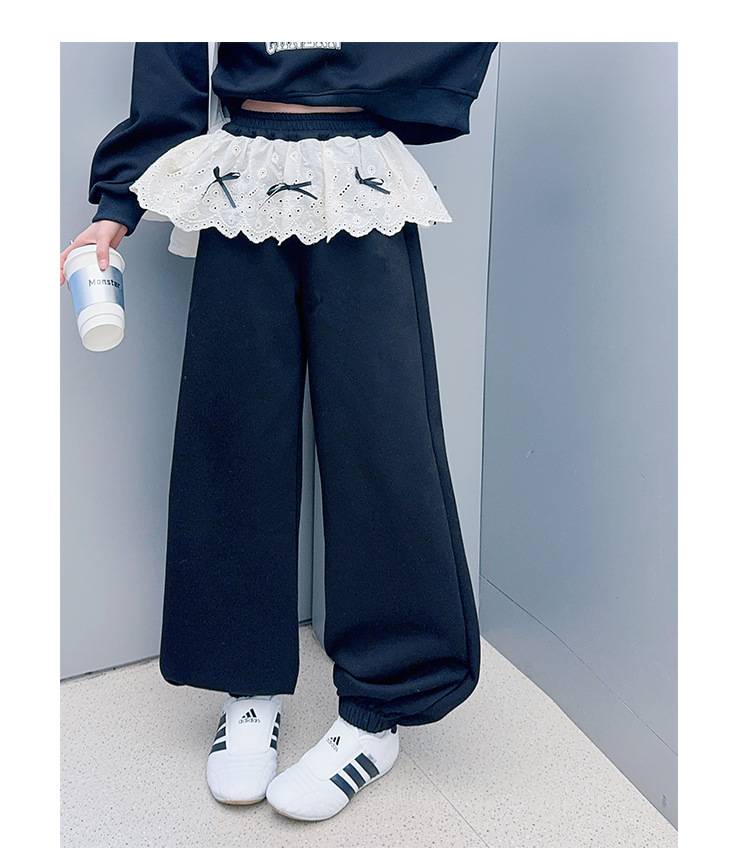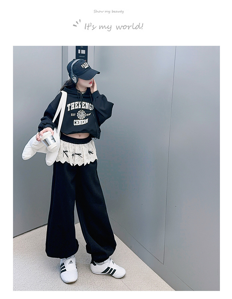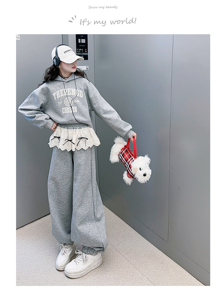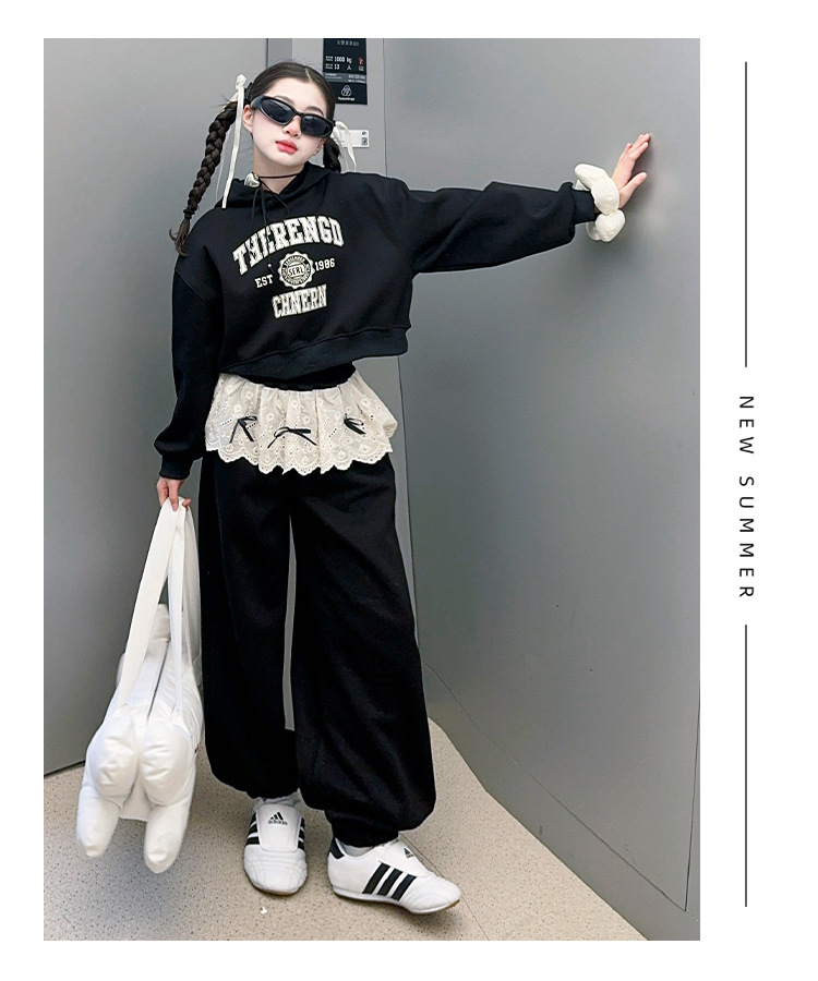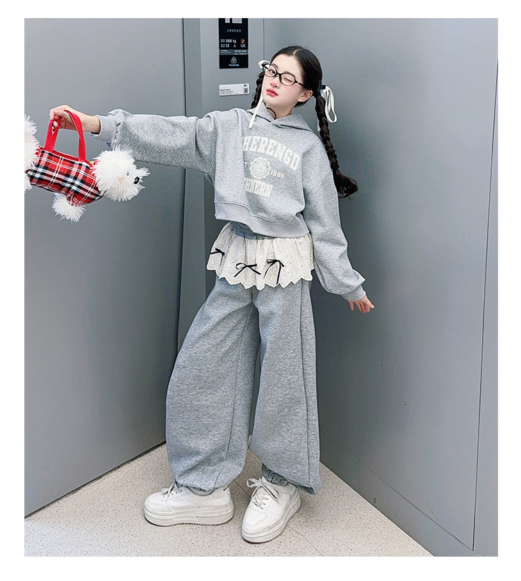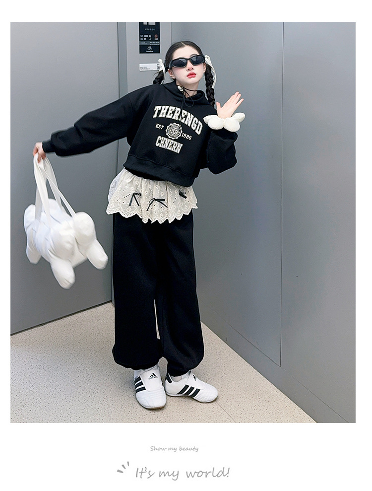 소녀의 봄과 가을 세트 큰 어린이 레이스 바느질 레이스 후디 소녀의 세련된 운동복 2 피스 세트