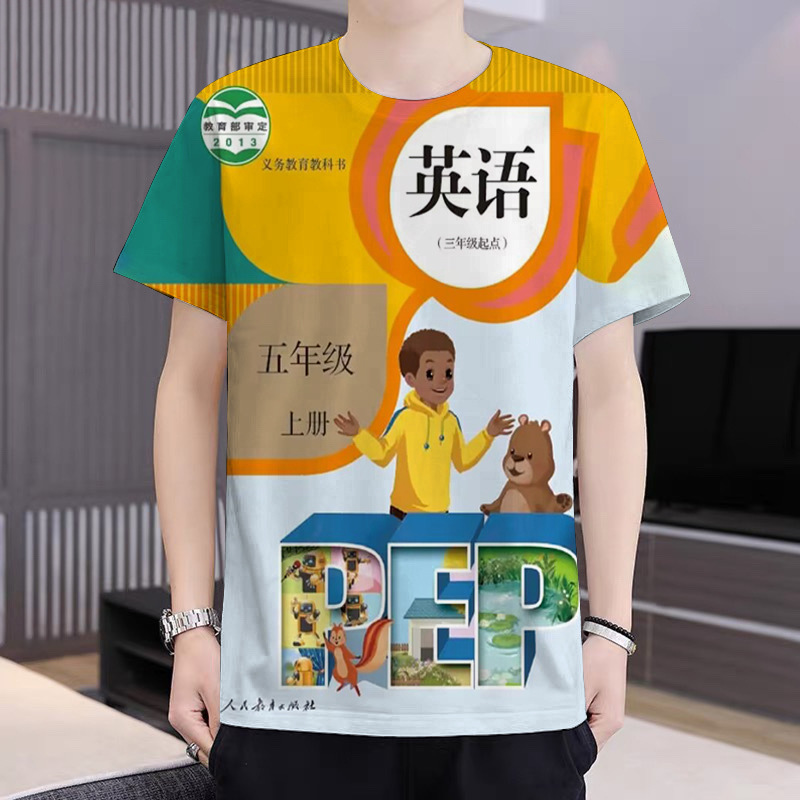 2024 새로운 여름 패션 느슨한 남성 인쇄 3D 캐주얼 크루 넥 트렌디 티셔츠 십대 초등학교 영어스토어 가기