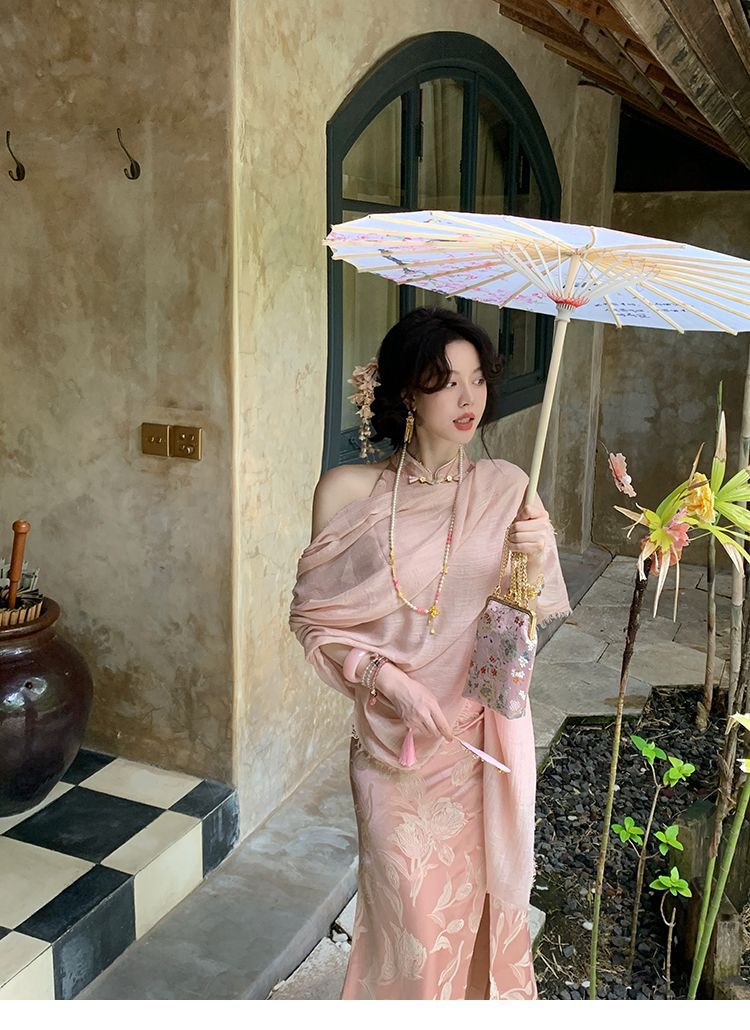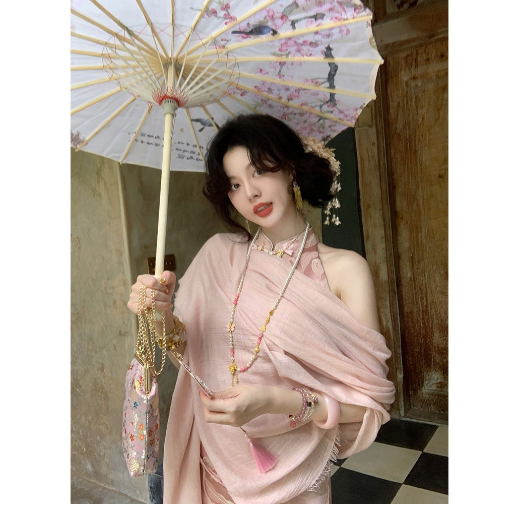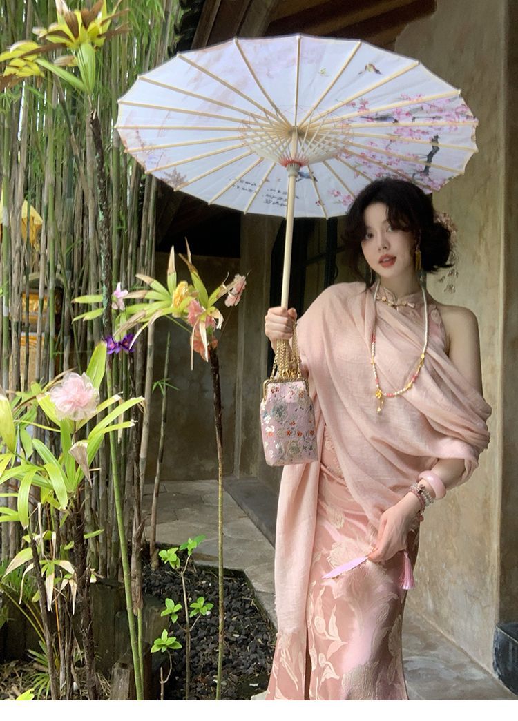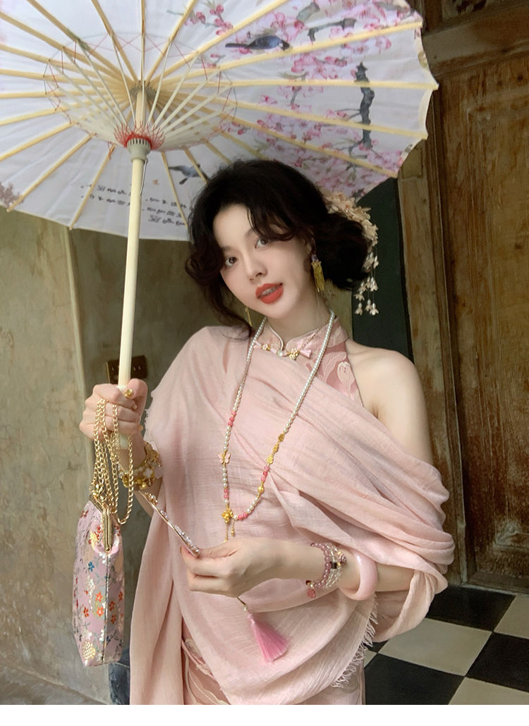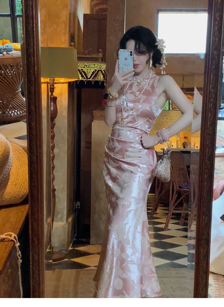 아름다운 강남 뷰티 2025 여름 새로운 중국 스타일 수정 원피스 섹시한 민소매 긴 청삼 원피스 세트
