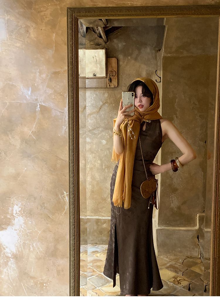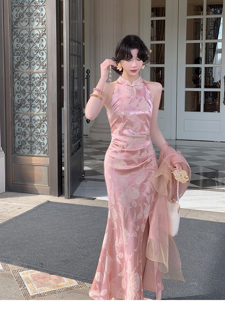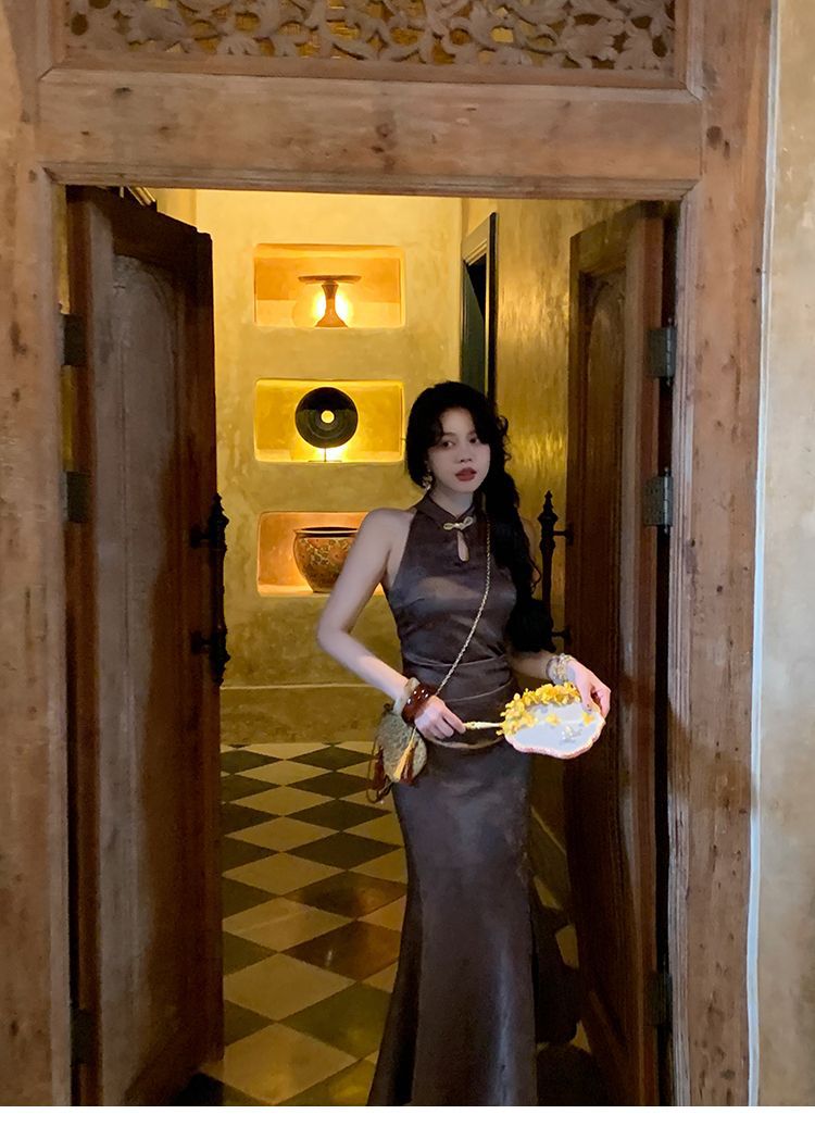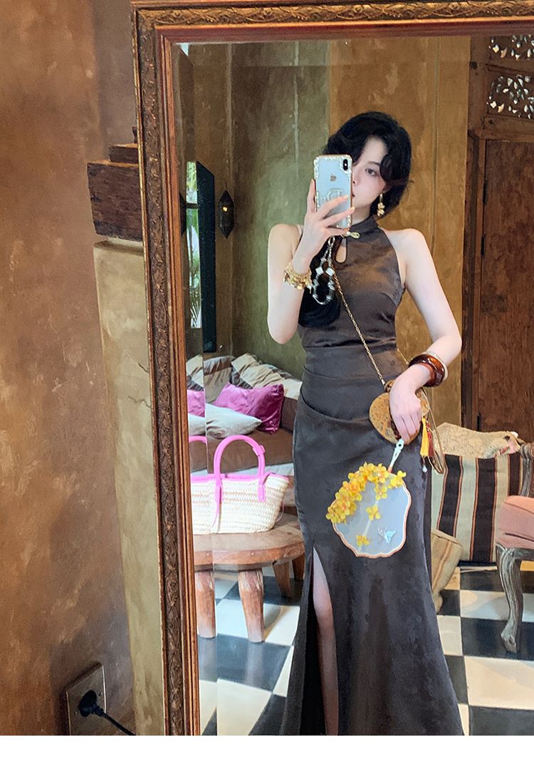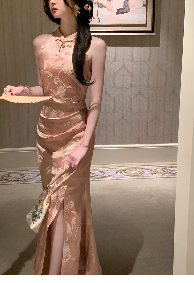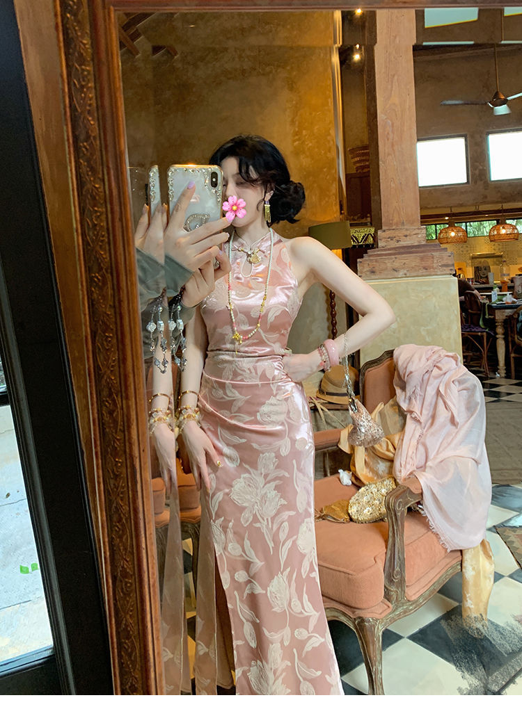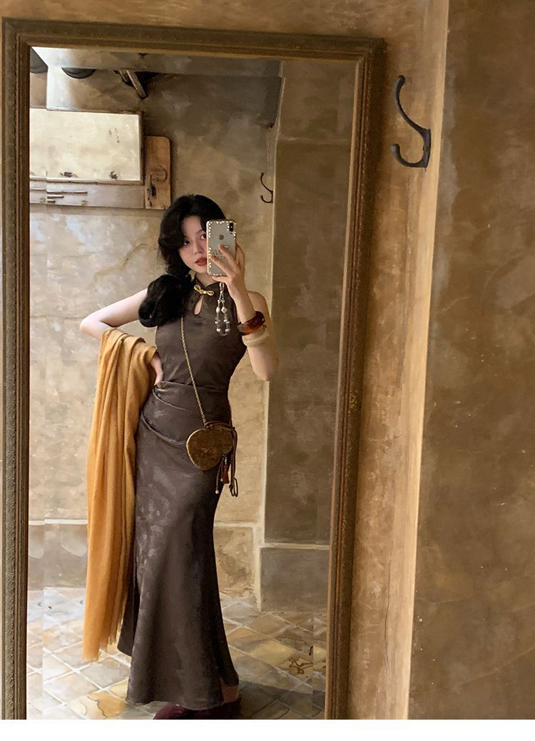 아름다운 강남 뷰티 2025 여름 새로운 중국 스타일 수정 원피스 섹시한 민소매 긴 청삼 원피스 세트스토어 가기