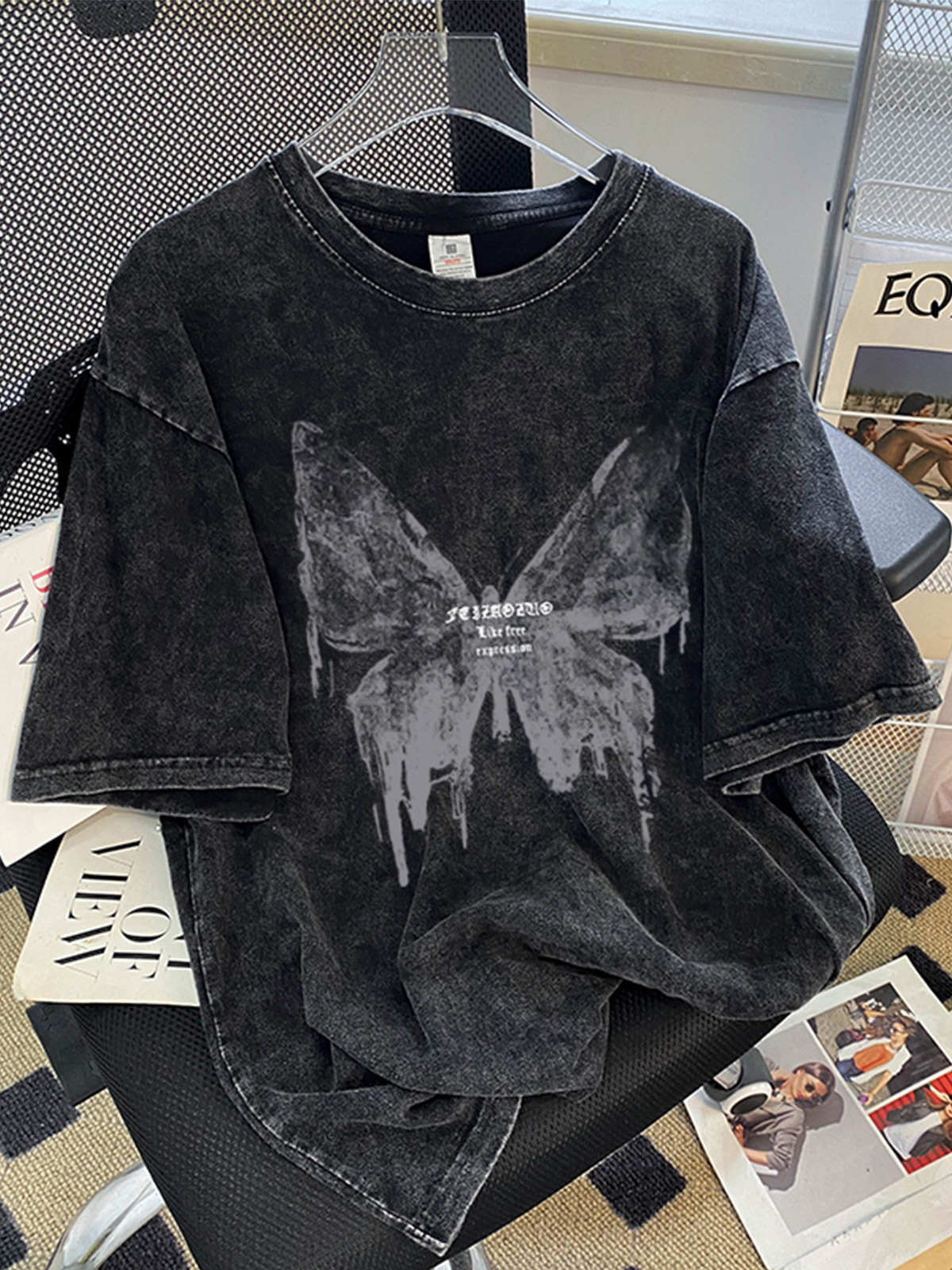 유럽과 미국 스타일의 힙합 패션 브랜드 고민 반팔 티셔츠 여성용 플러스 사이즈 느슨한 오버 사이즈 세탁 블랙 프린트 탑 옷스토어 가기