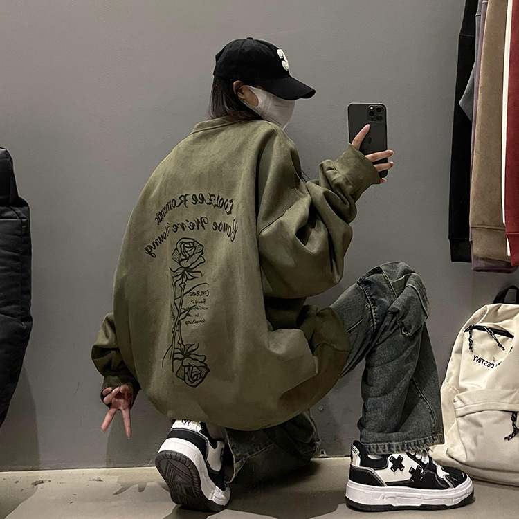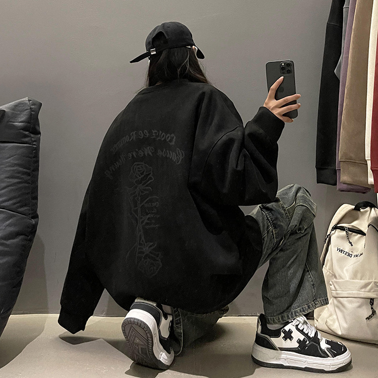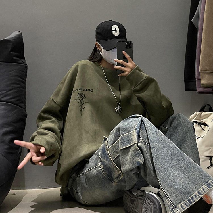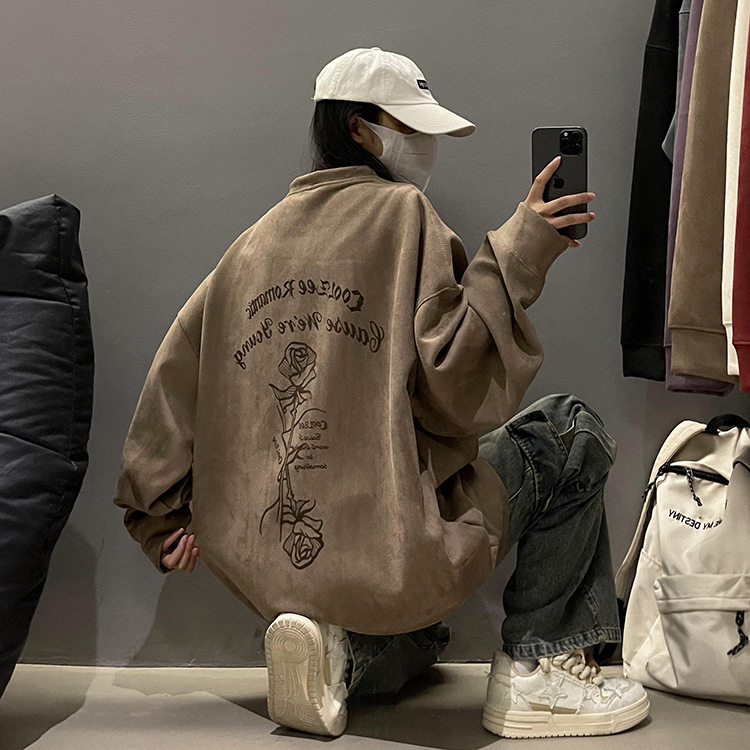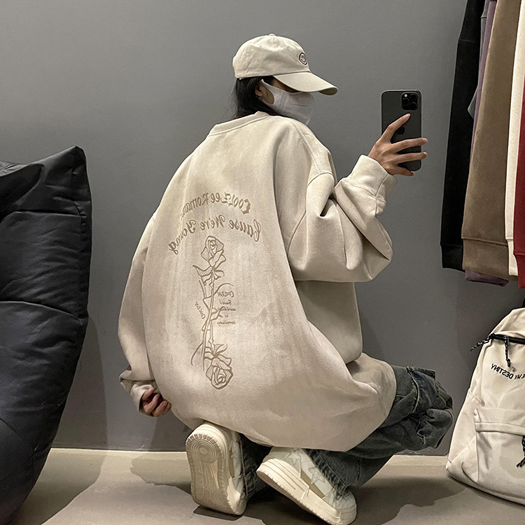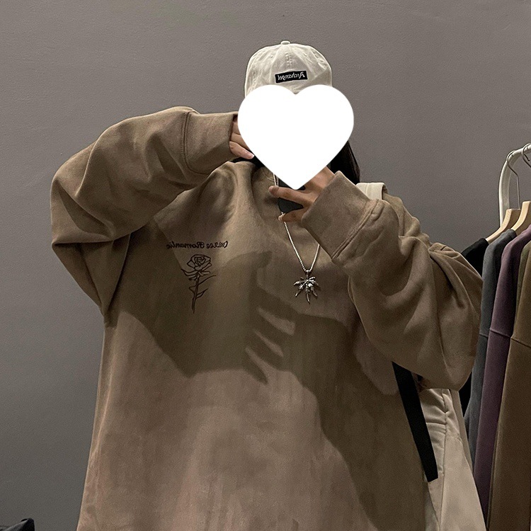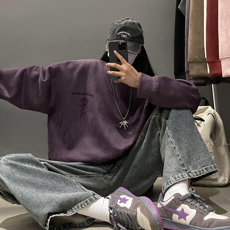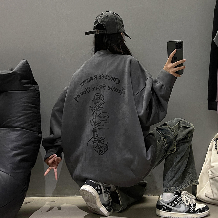 새로운 폭발 로즈 스웨이드 미국 패션 브랜드 모자없는 크루 넥 스웨트 셔츠 남자의 봄과 가을 새로운 2024 빈티지 상위 세대 헤어스토어 가기