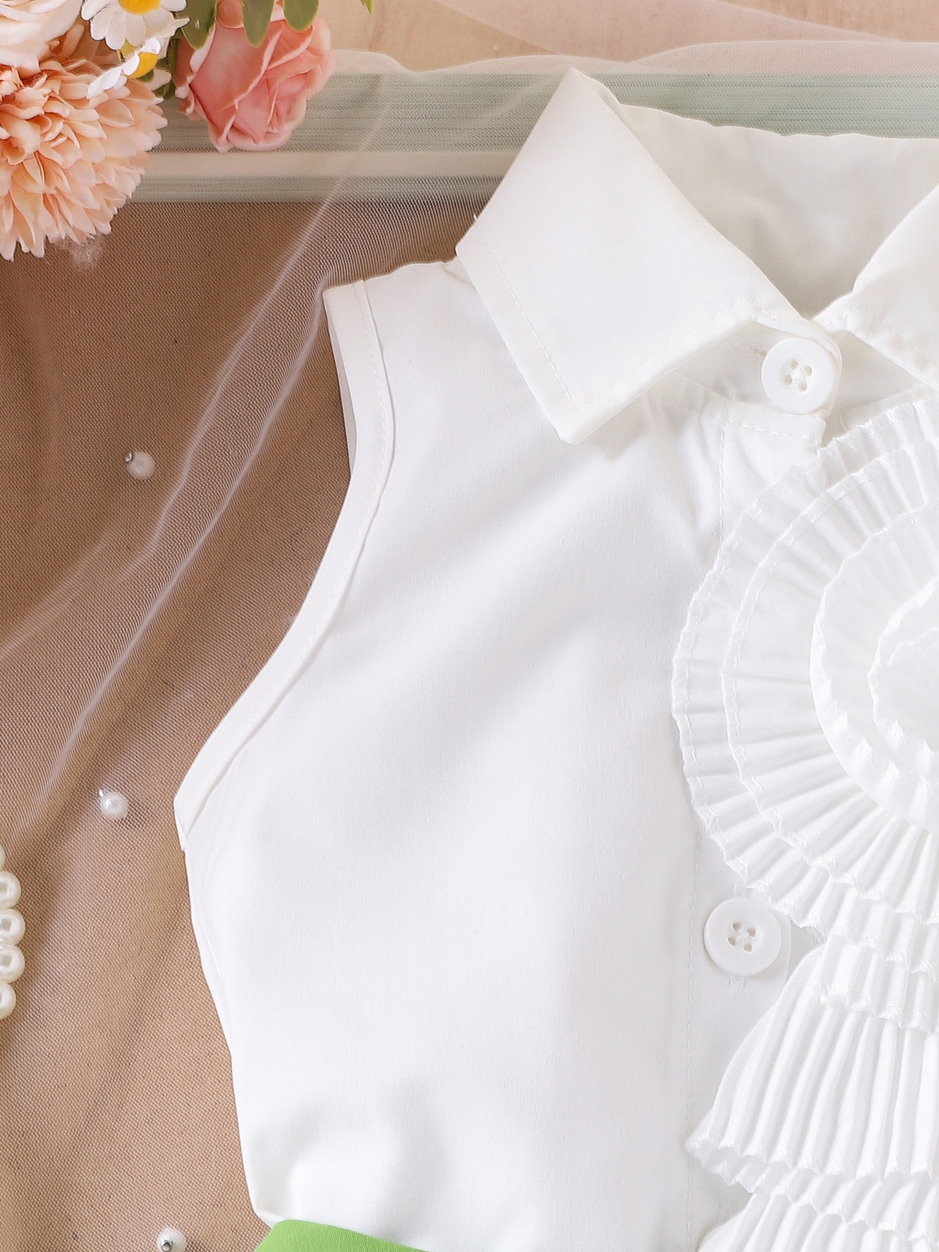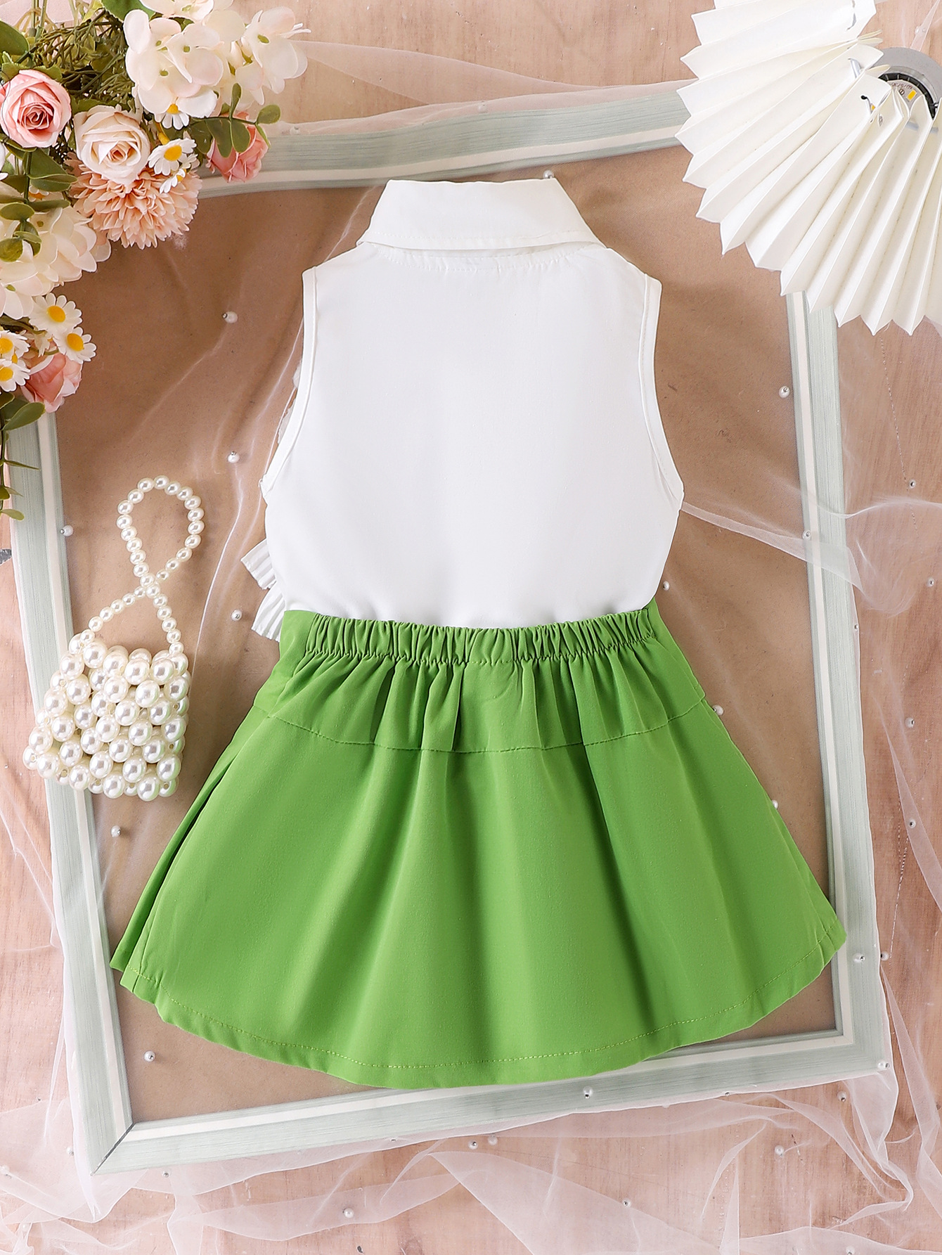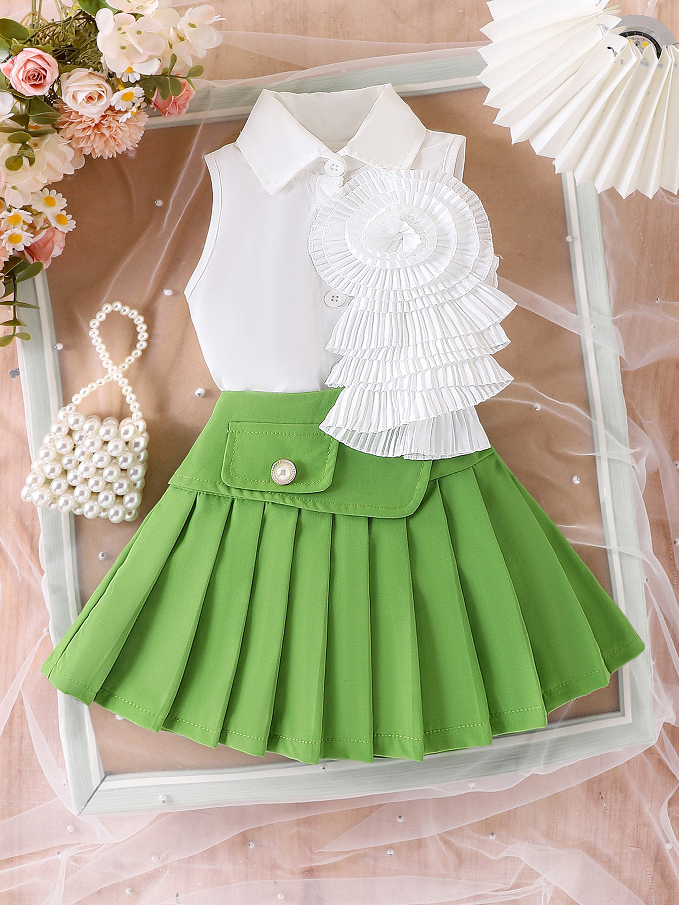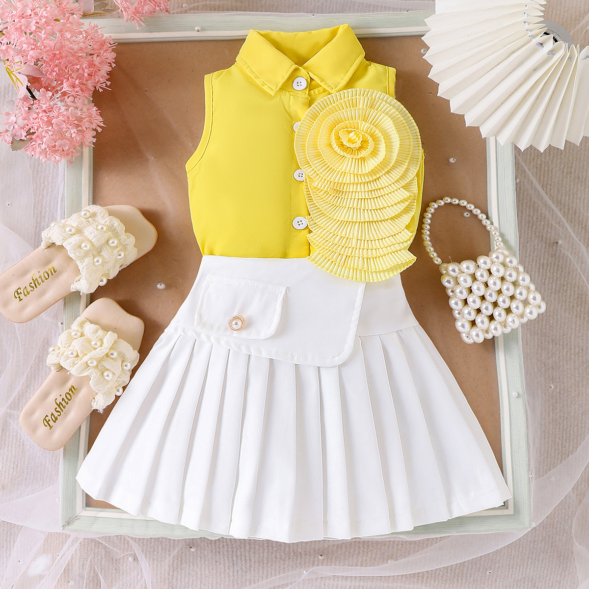 2025 아마존 유럽과 미국 여름 어린이 옷깃 민소매 셔츠 장미 빨간 주름 치마를 세트 새로운 소녀