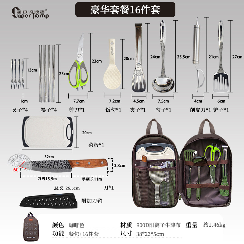야외 주방용품 휴대용 세트 스테인레스 스틸 16 조각 세트 캠핑 및 캠핑 행 용품 보관 가방 바베큐 조리기구