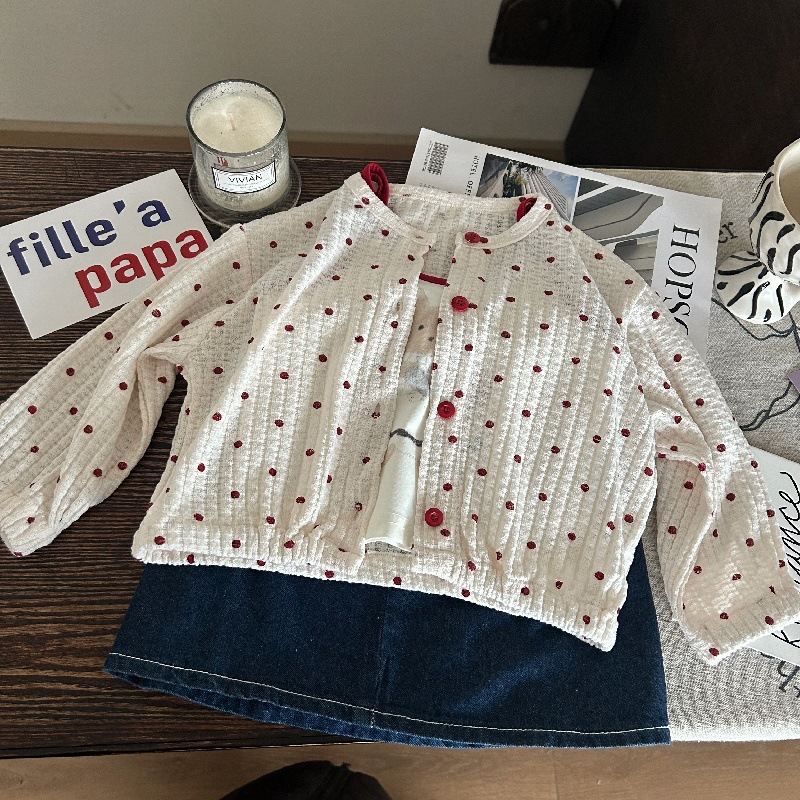 어린이 의류의 한국어 버전 2025 새로운 봄 소녀 웨이브 포인트 니트 카디건 어린이 외국 스타일 데님 스커트 3 피스 패션스토어 가기