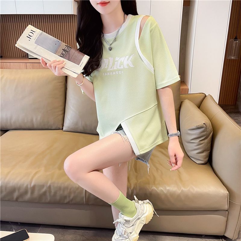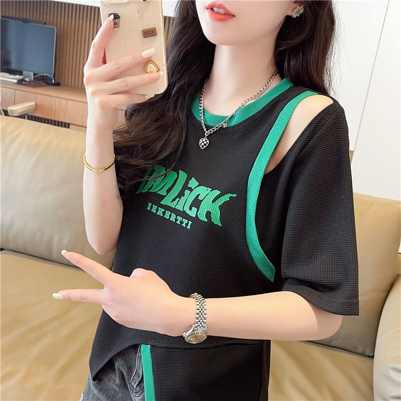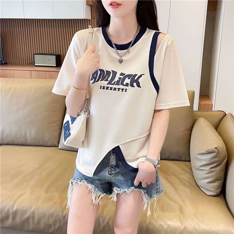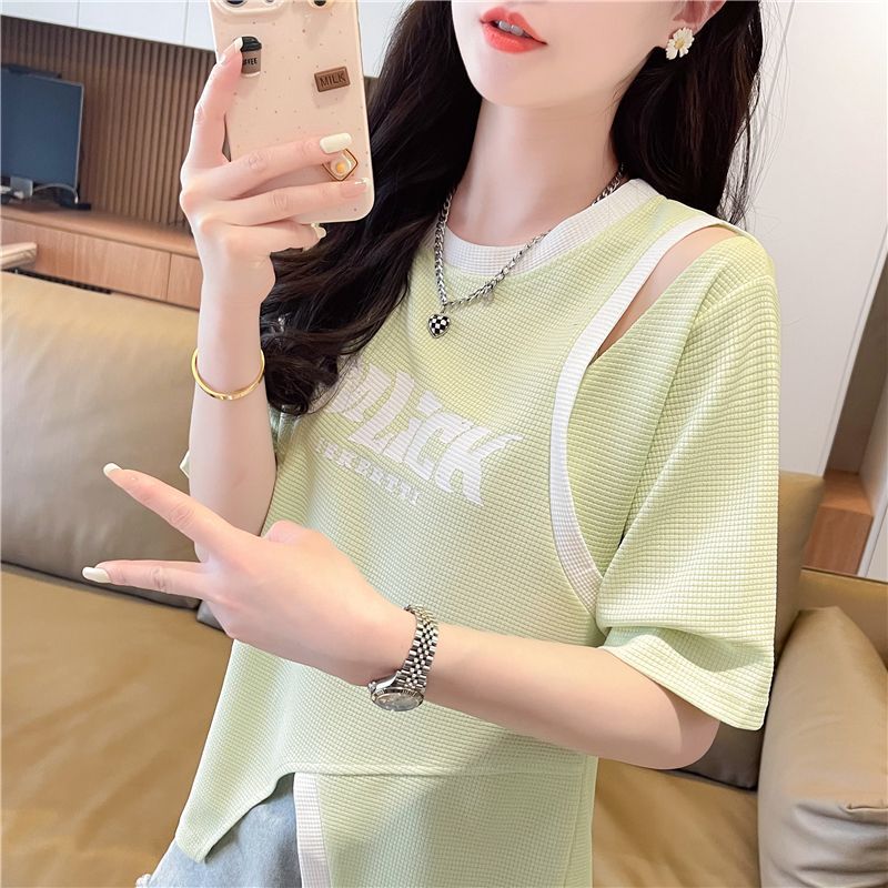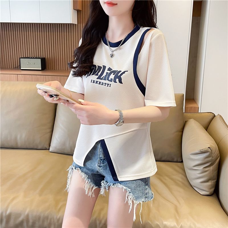 2025 여름 새로운 와플 가짜 투피스 반팔 여성용 티셔츠 디자인 틈새 독특한 세련된 어깨 탑스토어 가기