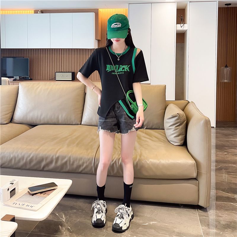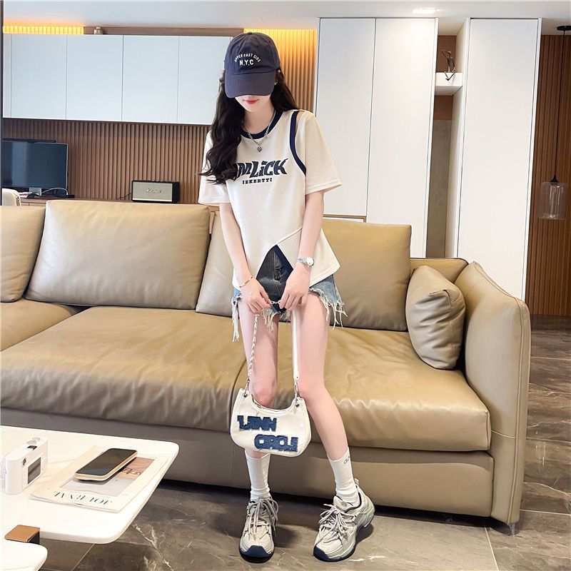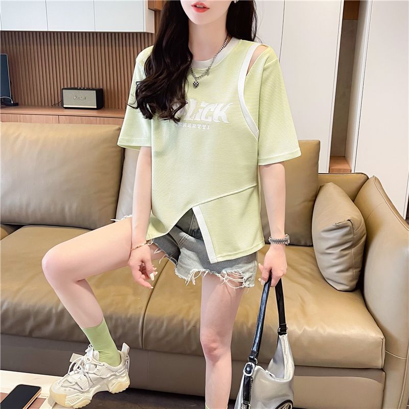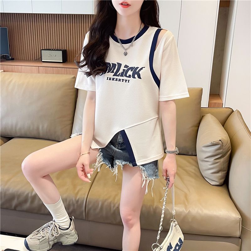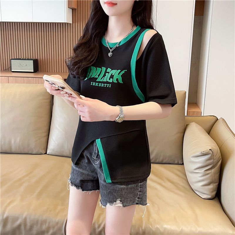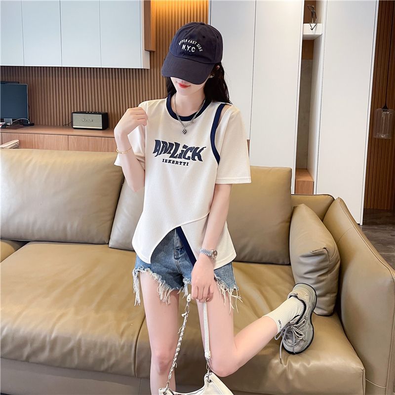 2025 여름 새로운 와플 가짜 투피스 반팔 여성용 티셔츠 디자인 틈새 독특한 세련된 어깨 탑스토어 가기