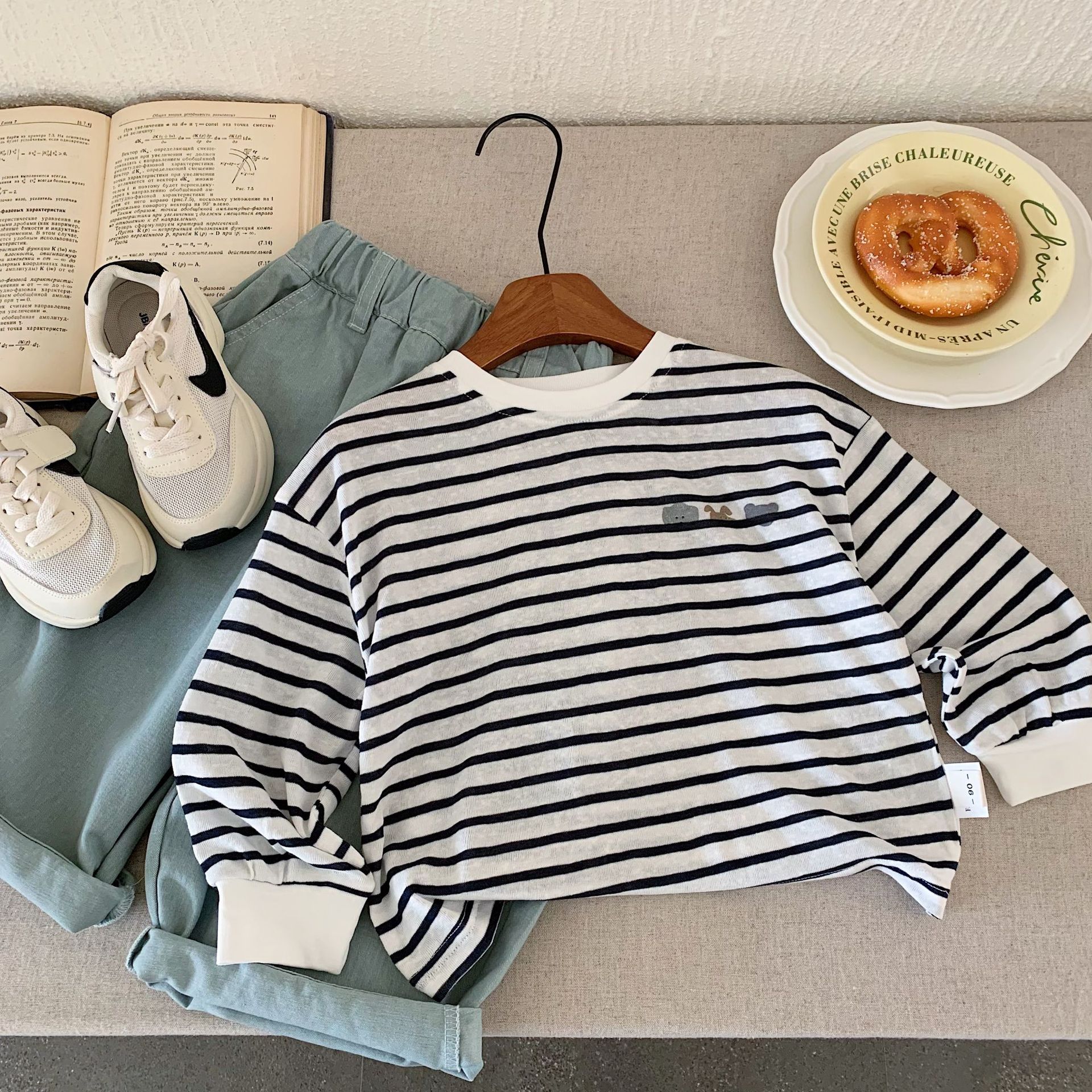어린이 티셔츠 방청 2025 봄 새로운 올 매치 탑 강아지 스트라이프 루즈 라운드 넥 롱 슬리브 티셔츠 H0051