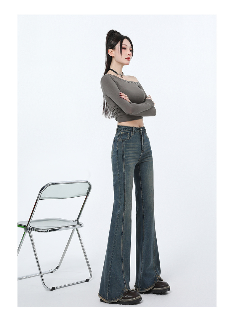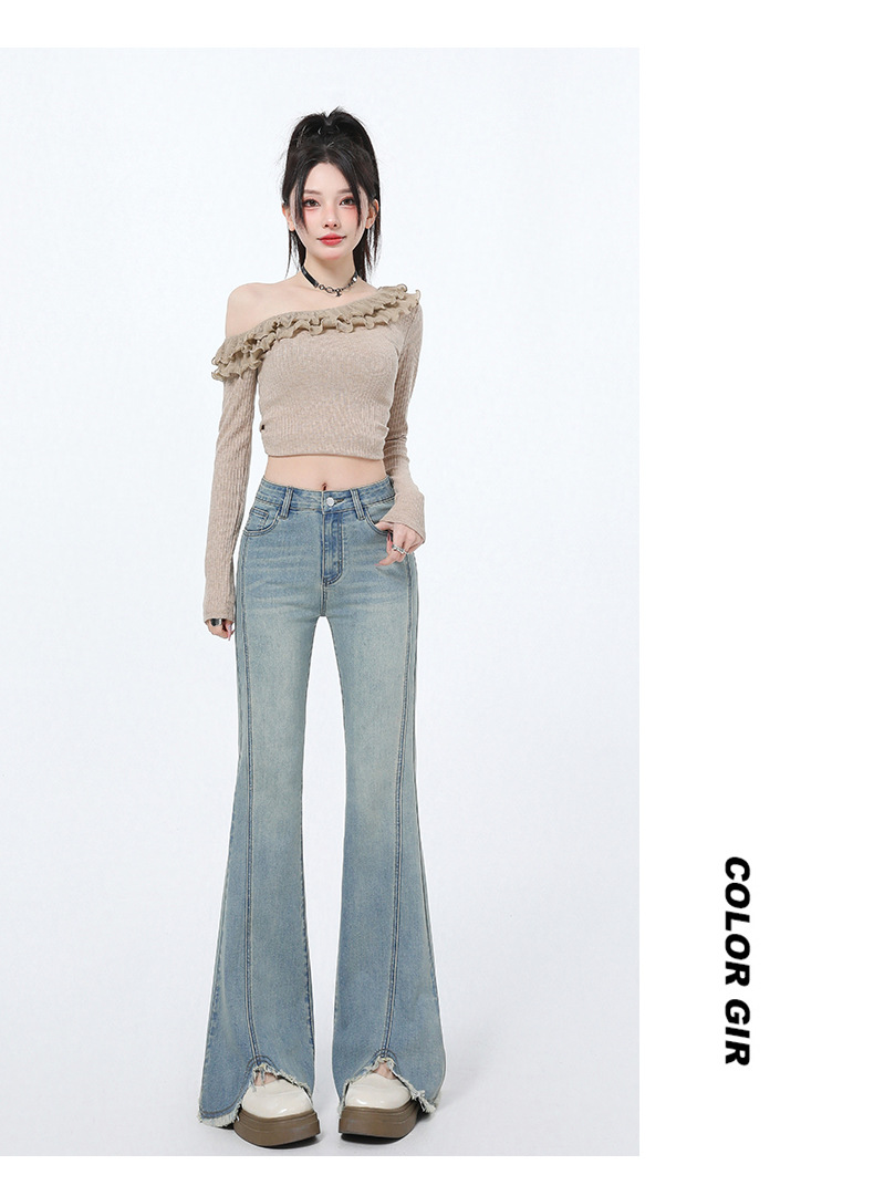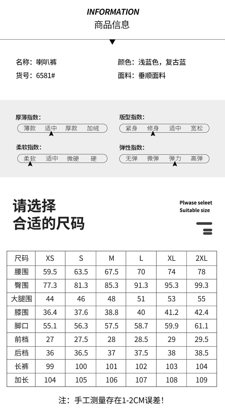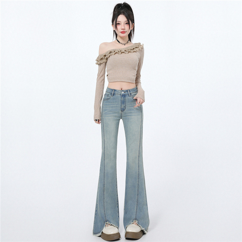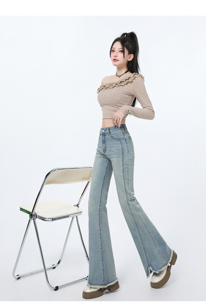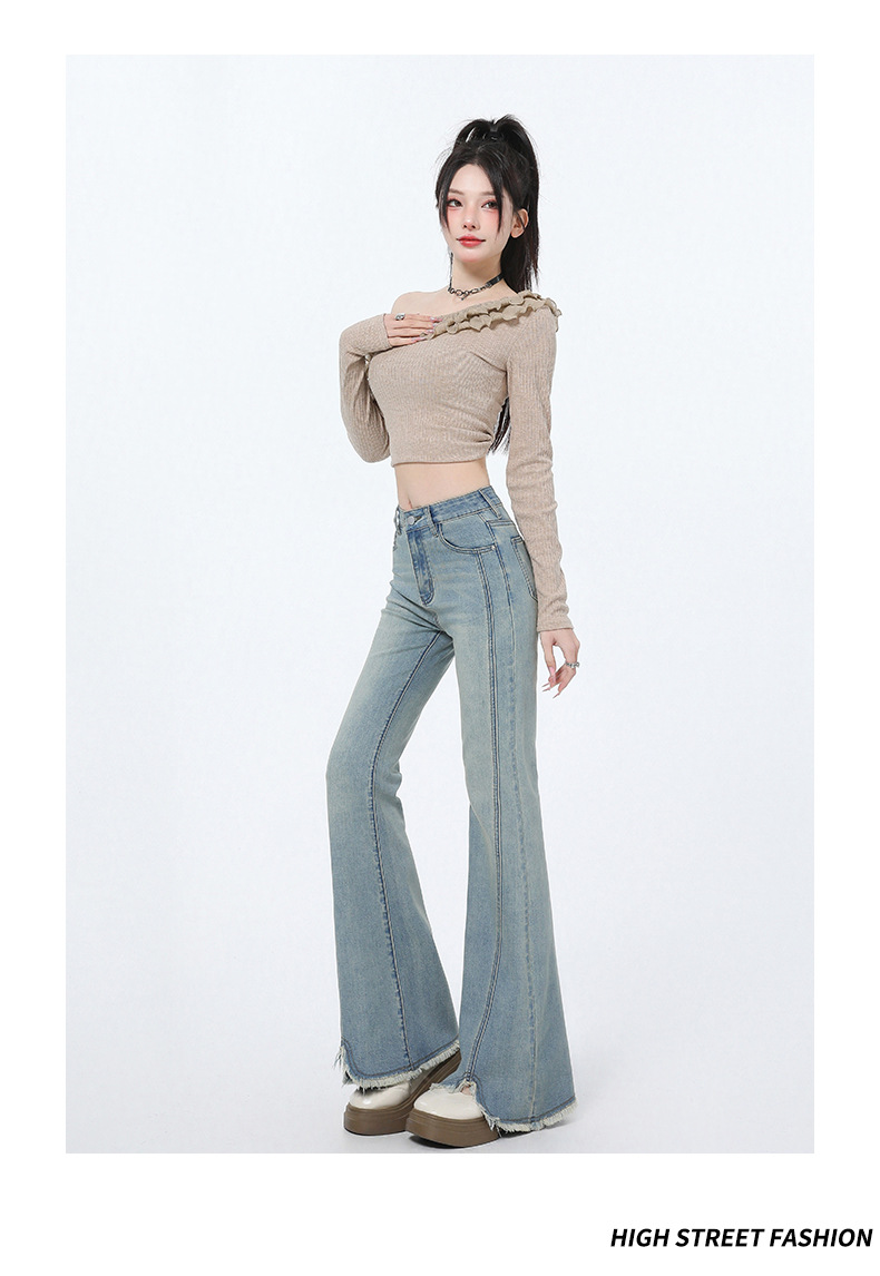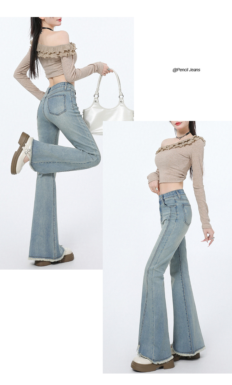 미국 라이트 블루 마이크로 플레어 청바지 여성의 2025 년 봄 새로운 하이 웨이스트 슬림 핏 슬림 핏 디자인 말굽 바지스토어 가기