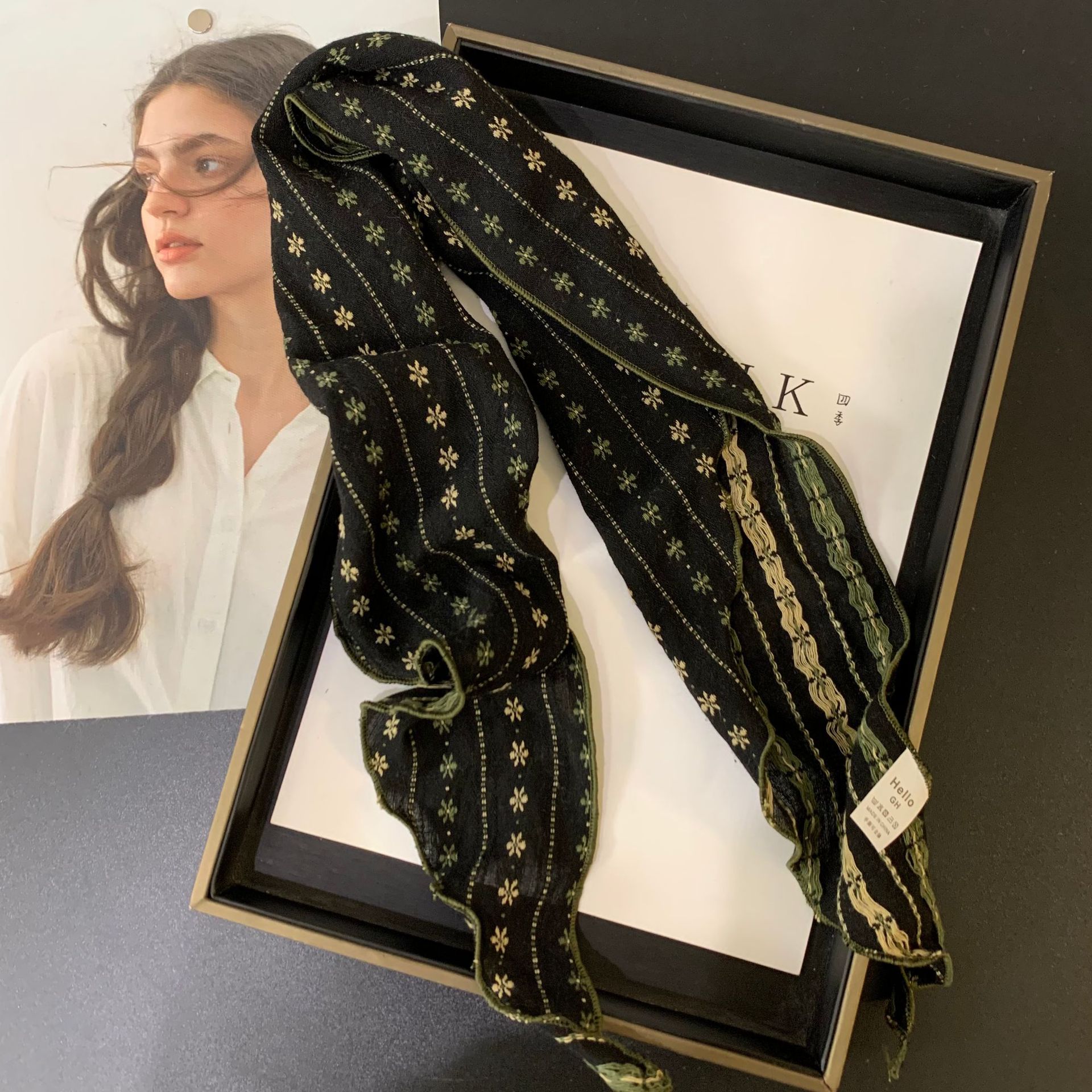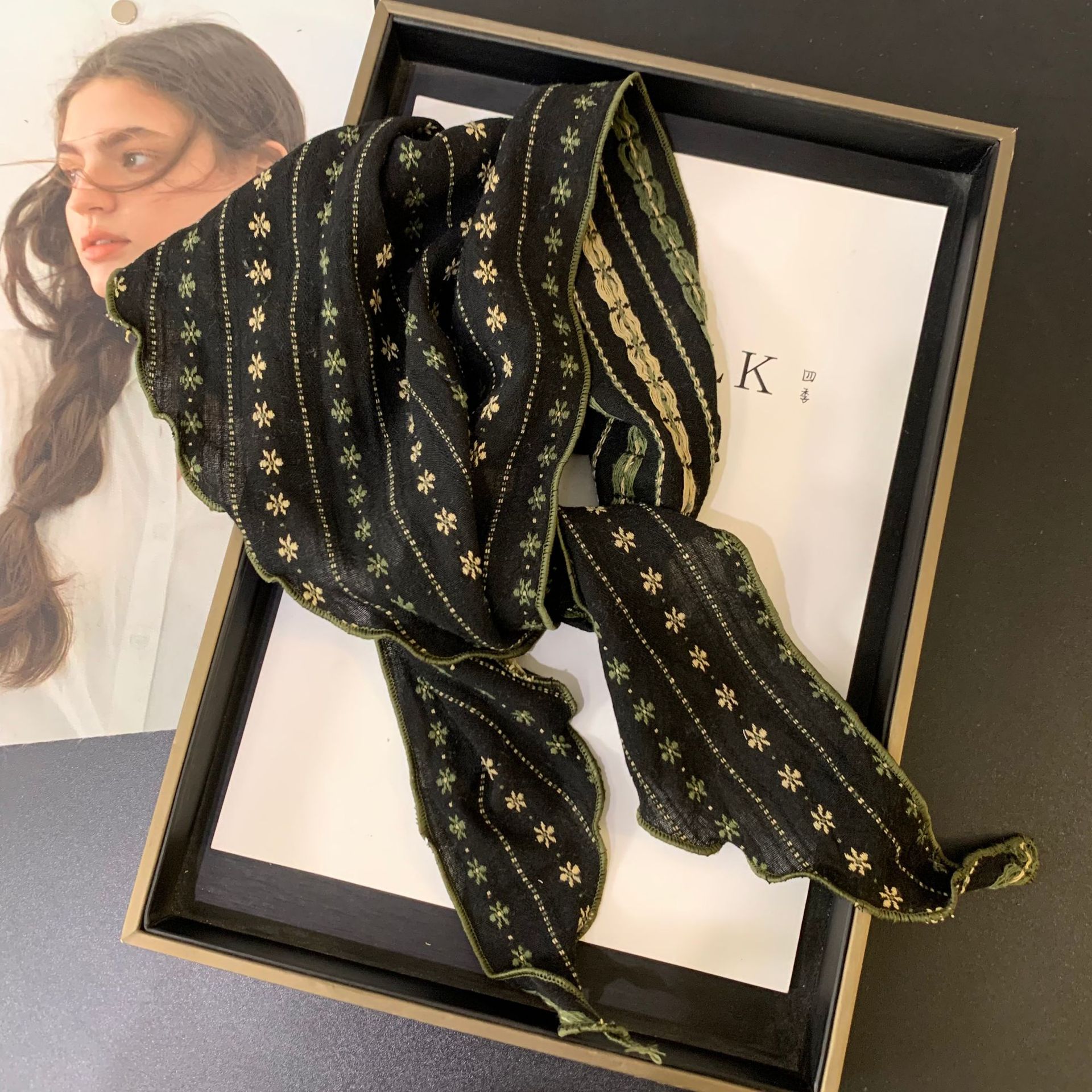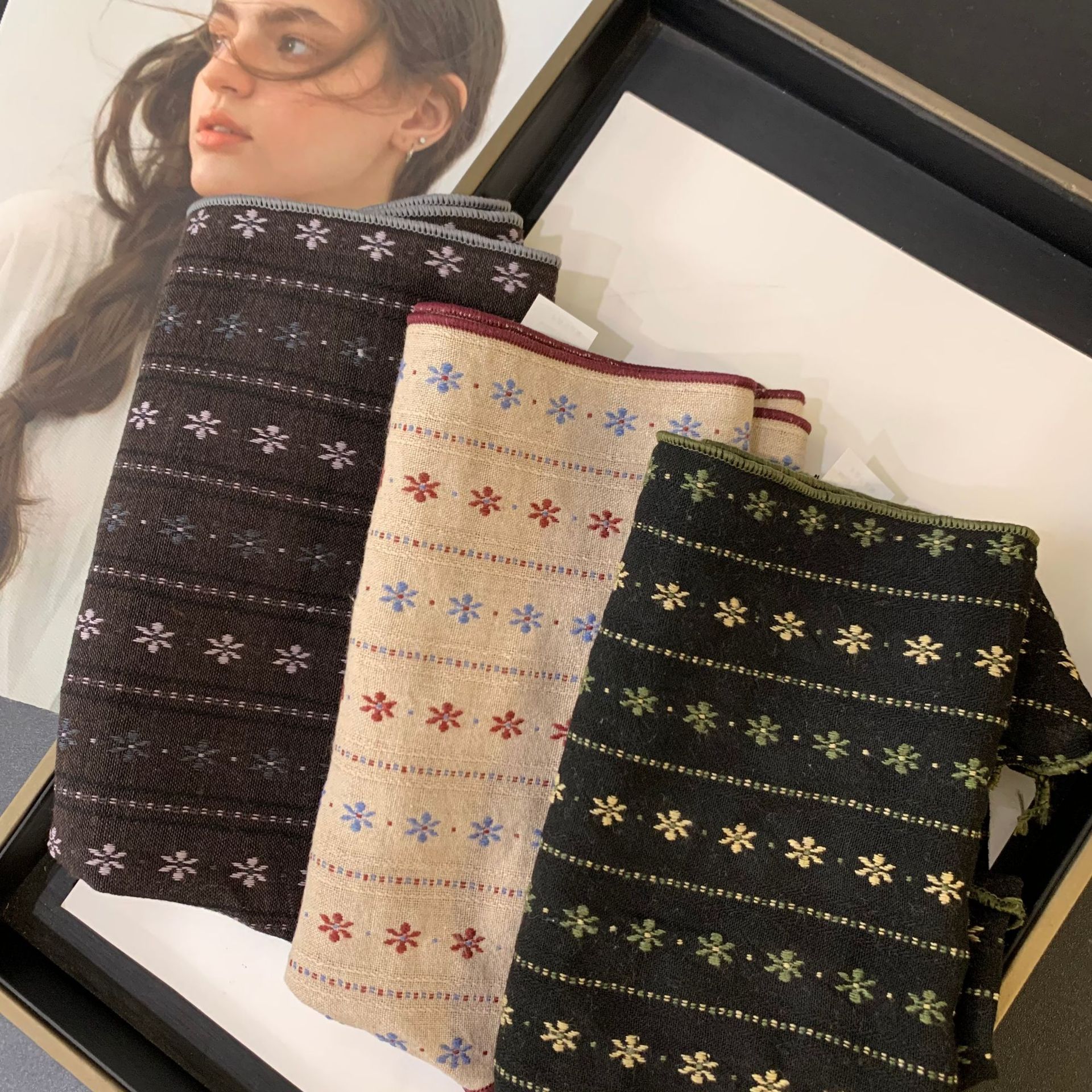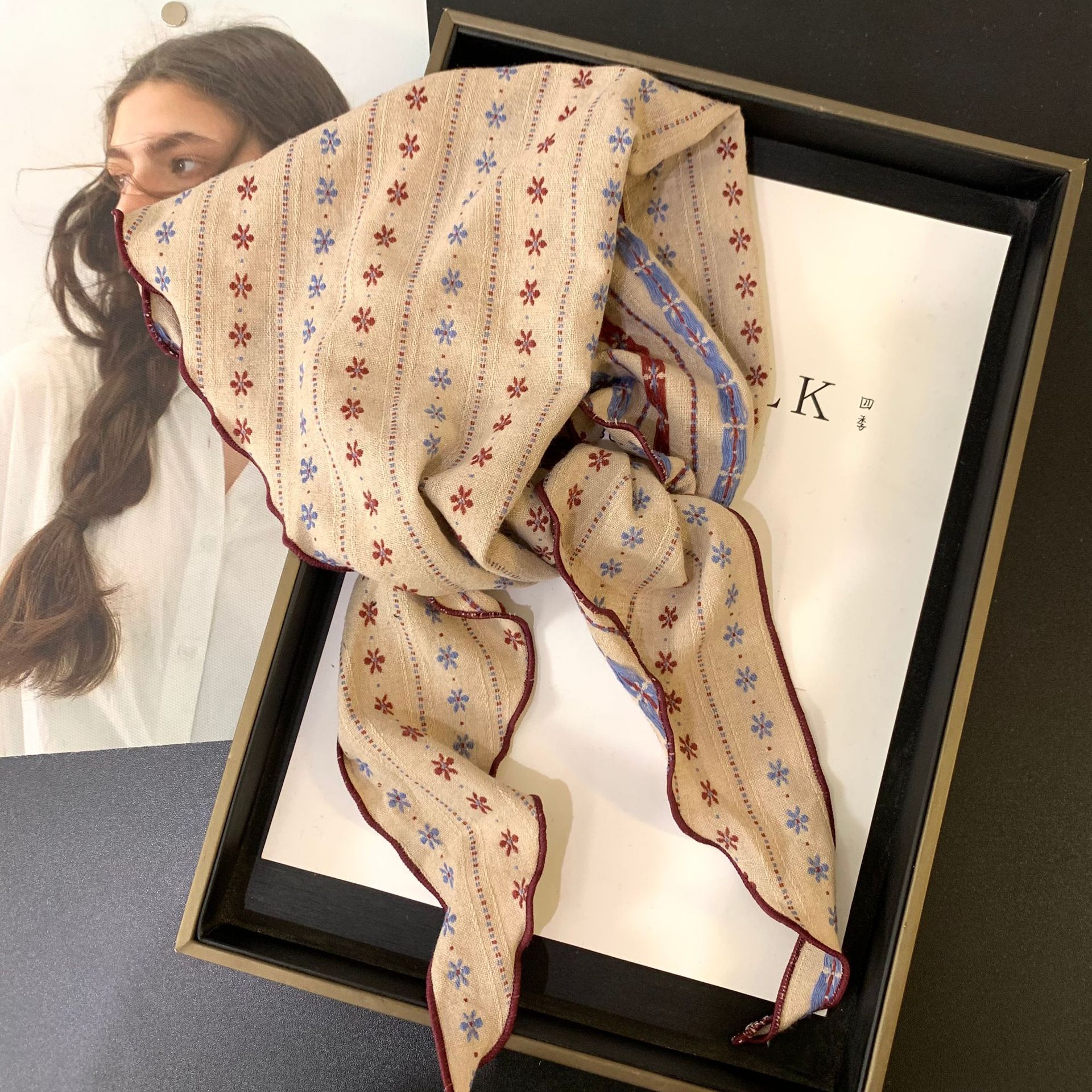 절묘한 눈송이 자수 면 및 린넨 삼각형 스카프 일본과 한국의 복고풍 패션 남성과 여성의 봄과 가을 작은 스카프 목 보호대와 스카프스토어 가기