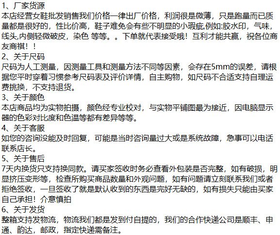[关于售后]鞋子出现任何问题均需第一时间联系客服,说明情况,签收超过48小时不反馈质量问题视为验收无问题。因为我们是工厂,产品会随着客户的反馈合货物批次做微调,如果收到货发现与图片中有轻微的不符,如扣带款式,鞋底LOGO烫金等一些细微处的材质更换等不影响质量的替换升级,属于正常情况。不属于与实物不符的范畴(此条会用作纠纷举证)
