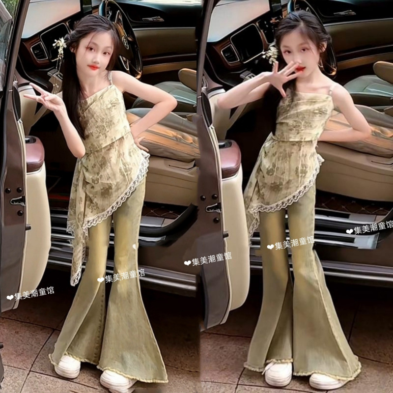 소녀 여름 세트 2024 새로운 한국 스타일 유행 소녀의 세련된 꽃 스커트 데님 플라 바지 2 조각 세트 트렌디스토어 가기