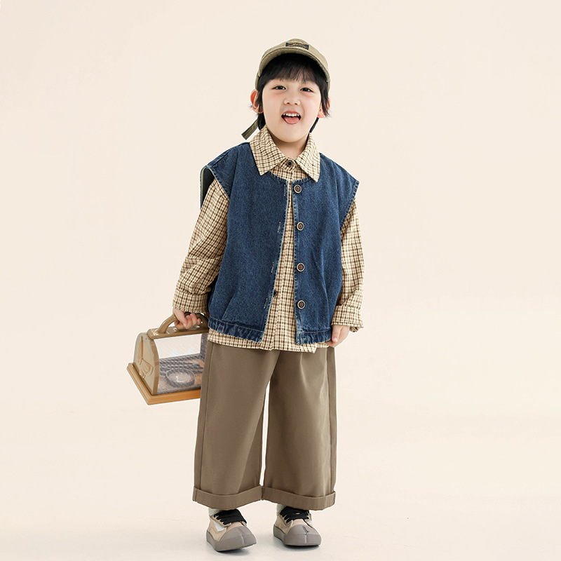 창궈 의류 남아 데님 조끼 아동용 한국 스타일 루즈핏 와이드 탑 중소형 아동용 아우터 조끼 봄 스타일