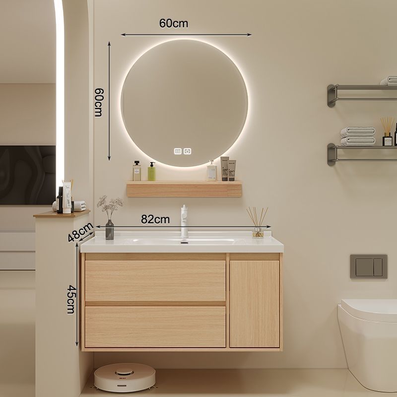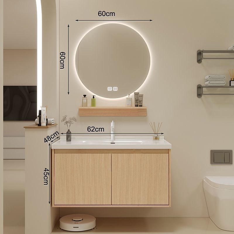 • 우드 컬러 - 스마트 원형 거울 모델 - 60CM 세라믹 일체형 세면대 + 무료 흰색 인출식 수도꼭지