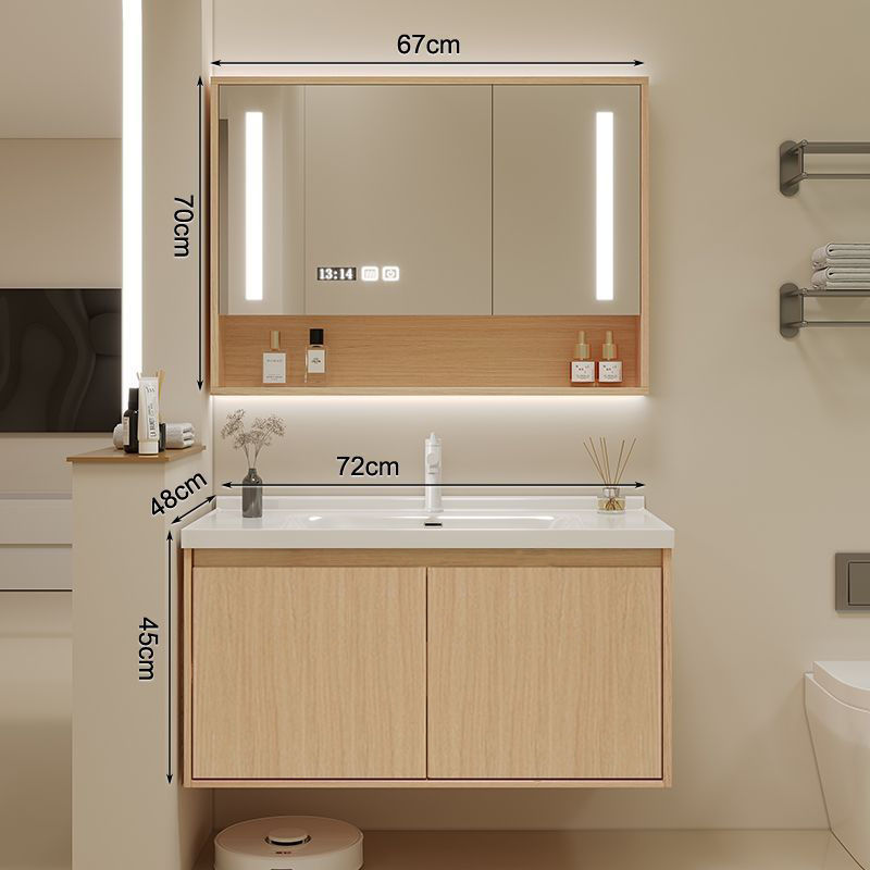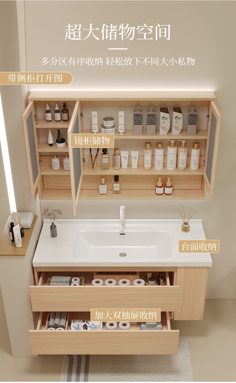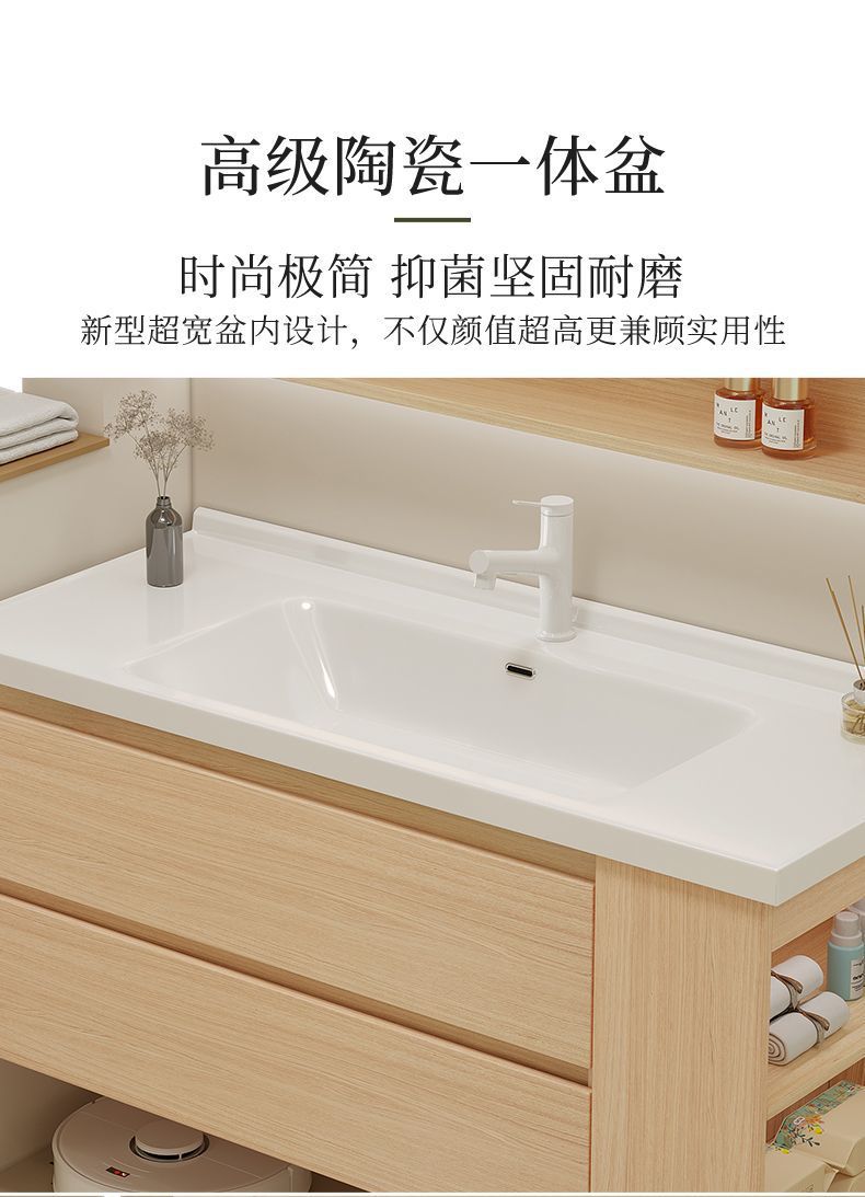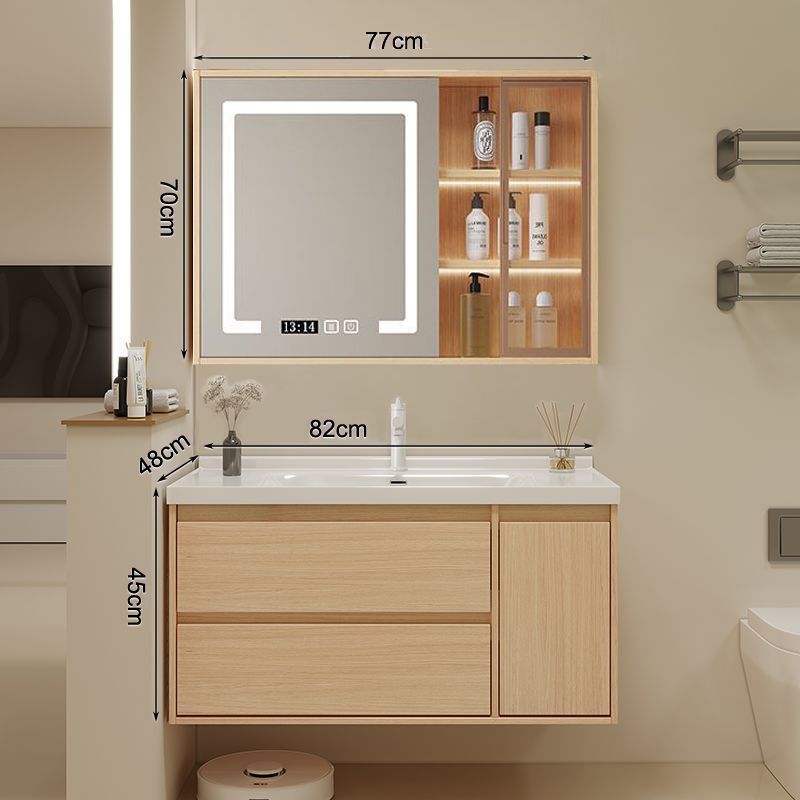 • 우드 컬러 - 고급스러운 스마트 유리 도어 모델 [수납 가능] - 80CM 세라믹 일체형 세면대 + 무료 흰색 인출식 수도꼭지