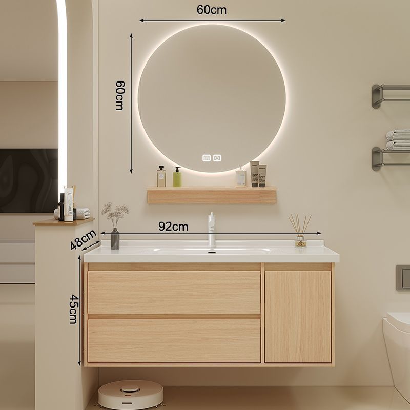 • 우드 컬러 - 스마트 원형 거울 모델 - 90CM 세라믹 일체형 세면대 + 무료 흰색 인출식 수도꼭지