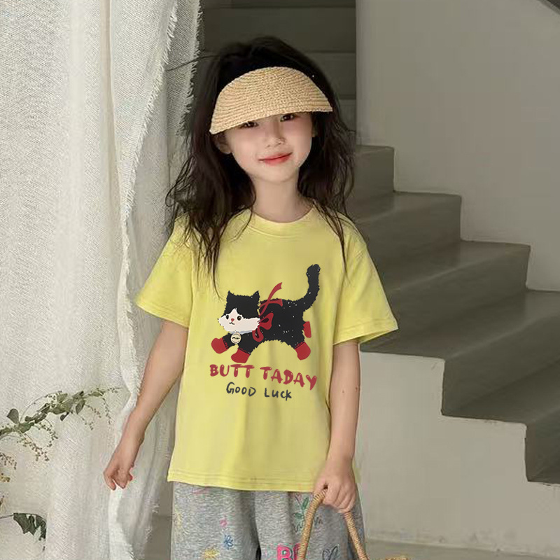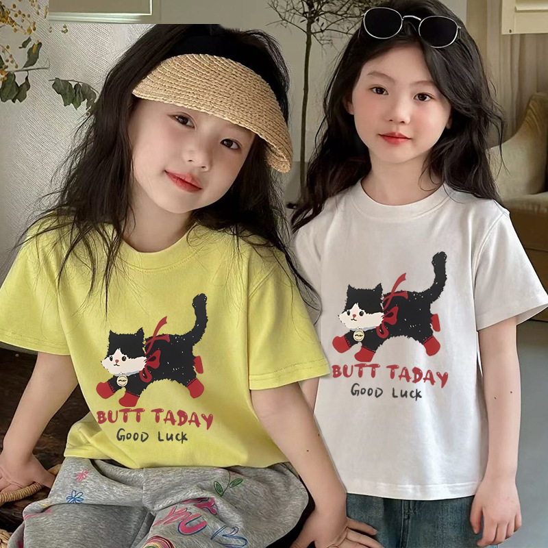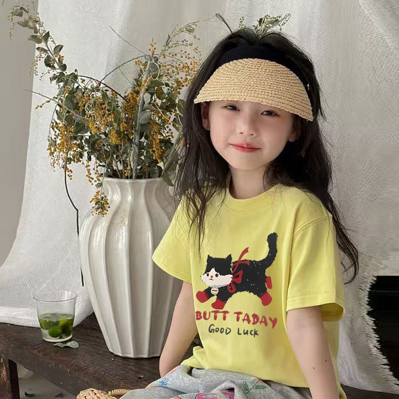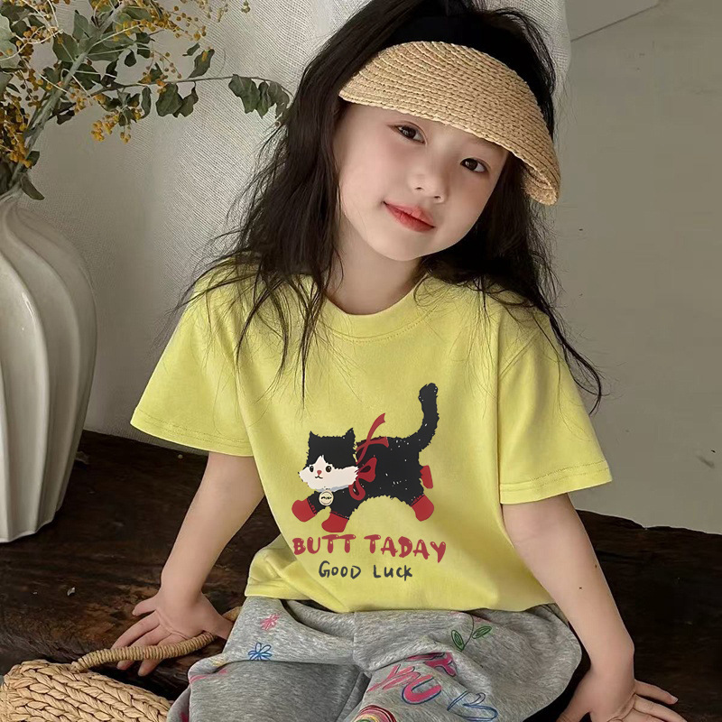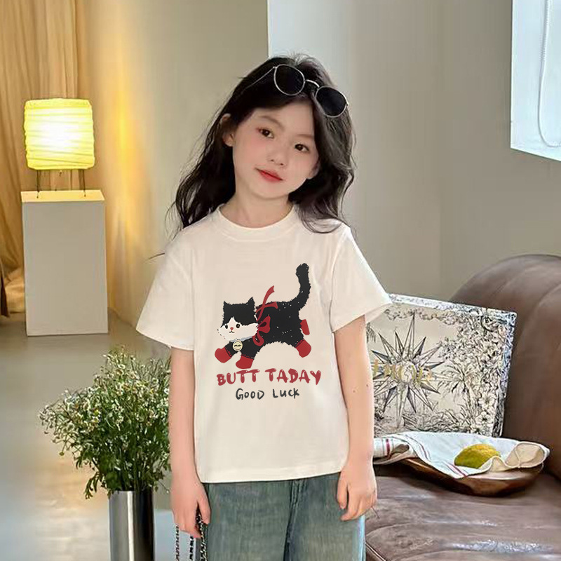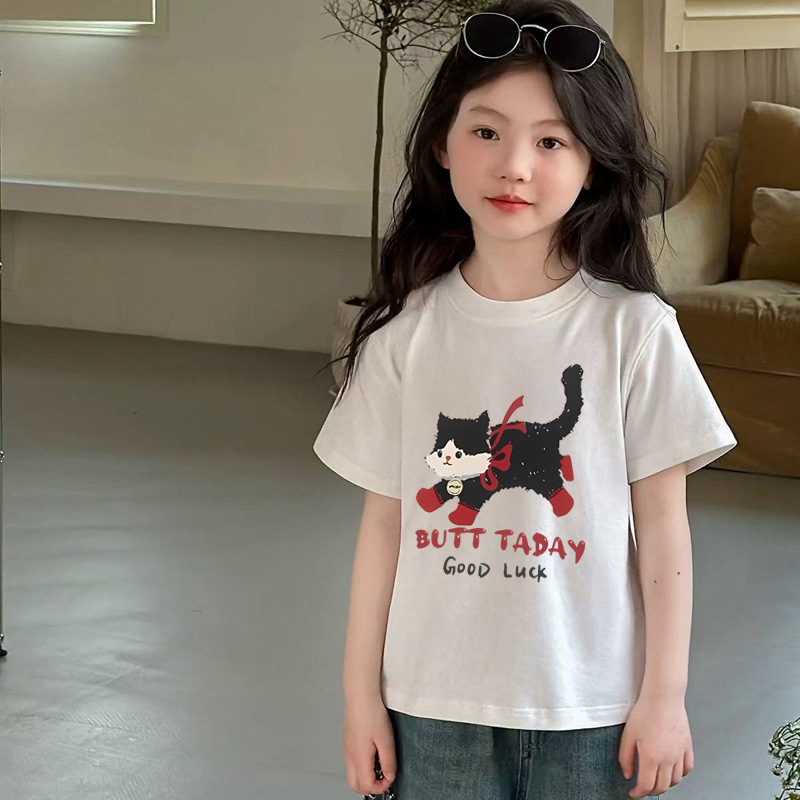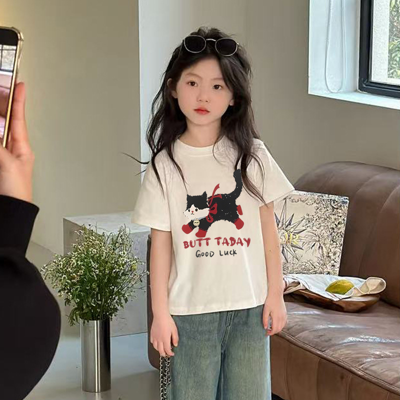 소녀 코튼 만화 짧은 소매 티셔츠 느슨한 2025 새로운 여름 어린이 소녀 화이트 크루 넥 탑 하프 슬리브스토어 가기