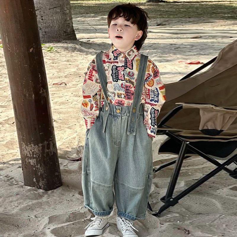 남학생의 봄 데님 스트래피 꽃 셔츠 세트 2024 남학생과 여자를위한 새로운 한국식 캐주얼 셔츠스토어 가기