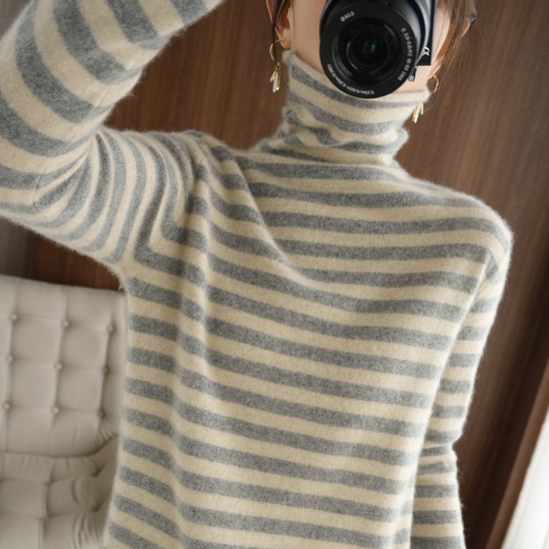 프랑스 스타일의 세련된 가을과 겨울 폭발 더미 스트라이프 따뜻한 내부 니트 베이스 셔츠 터틀넥 여성용 서양식 스웨터스토어 가기