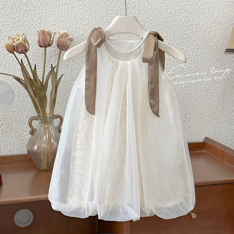 소녀 원피스 2025 여름 새로운 세련된 슬립 스커트 우아한 소녀 아기 아기 꽃 버드 스퀸 메쉬 스커트 트렌디