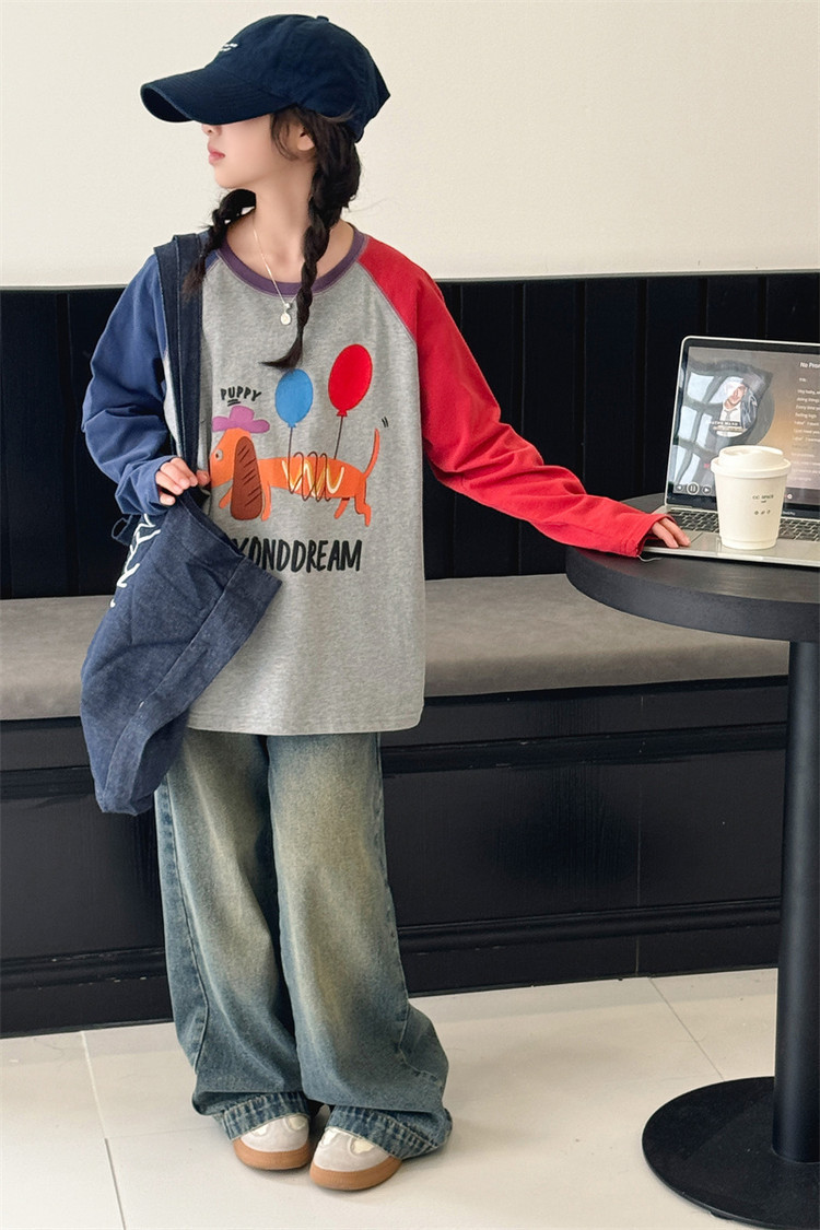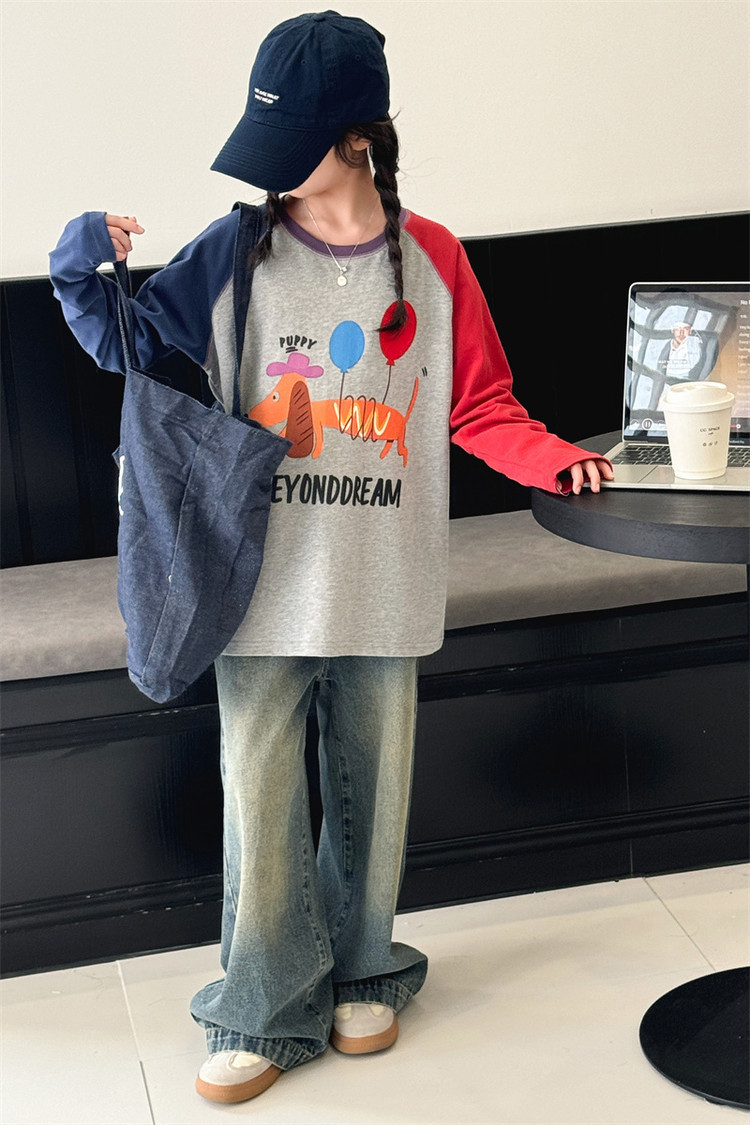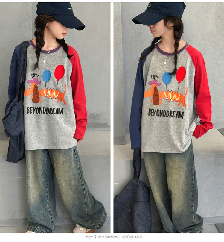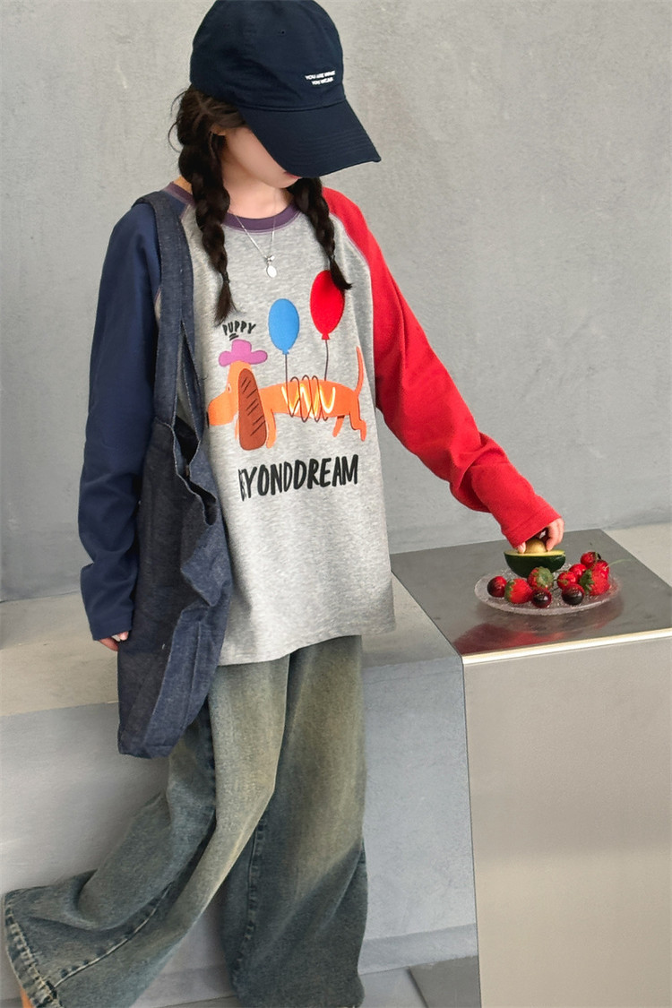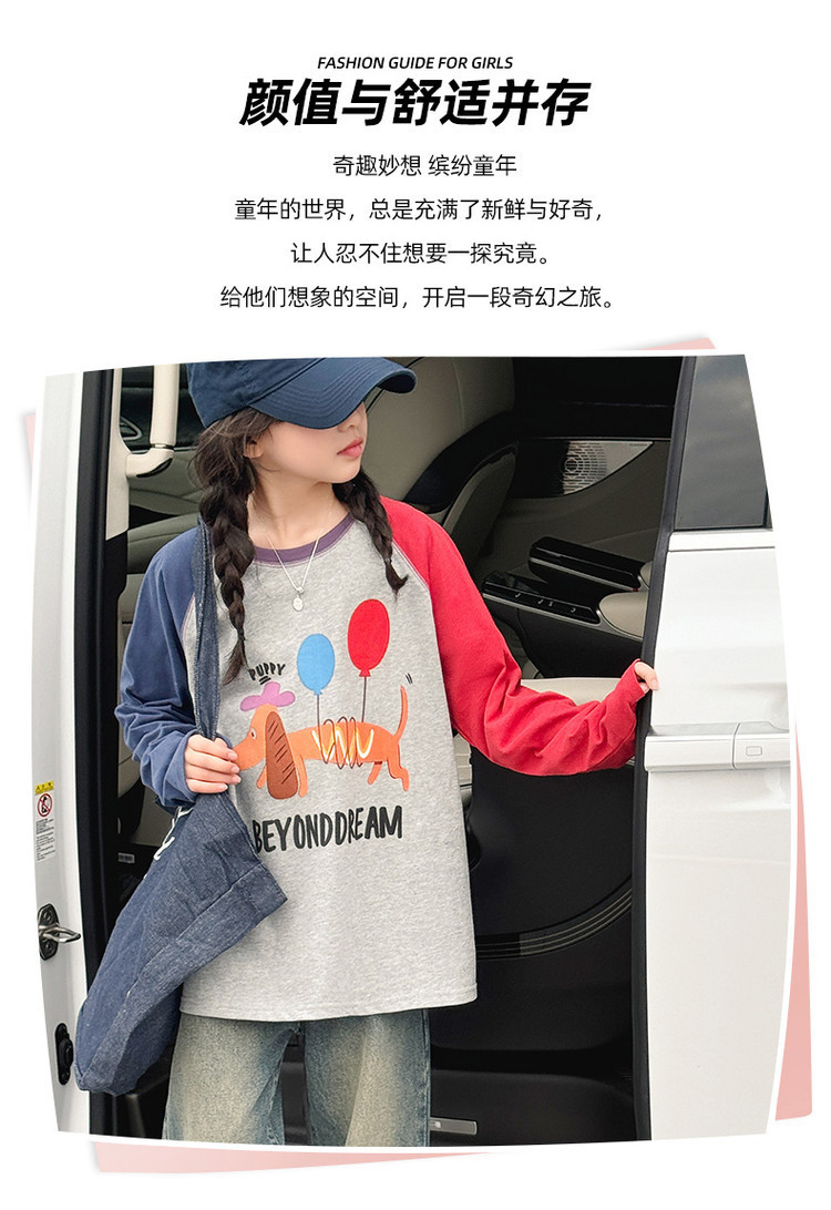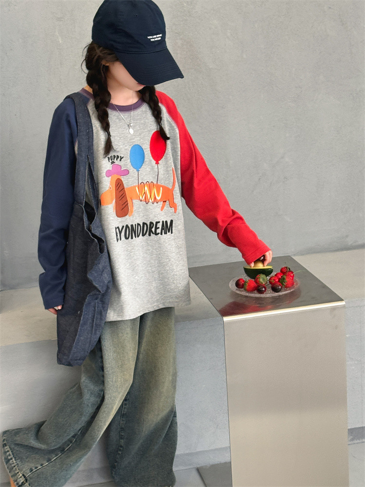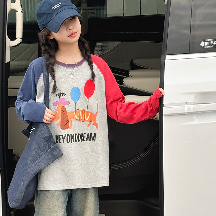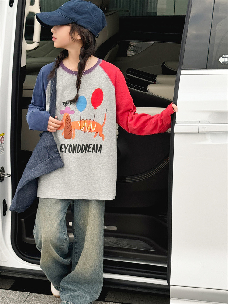 소녀 한국식 컬러 블록 긴팔 티셔츠 2025 새로운 봄 소녀의 서양식 느슨한 캐주얼 인쇄 트렌디 탑스토어 가기
