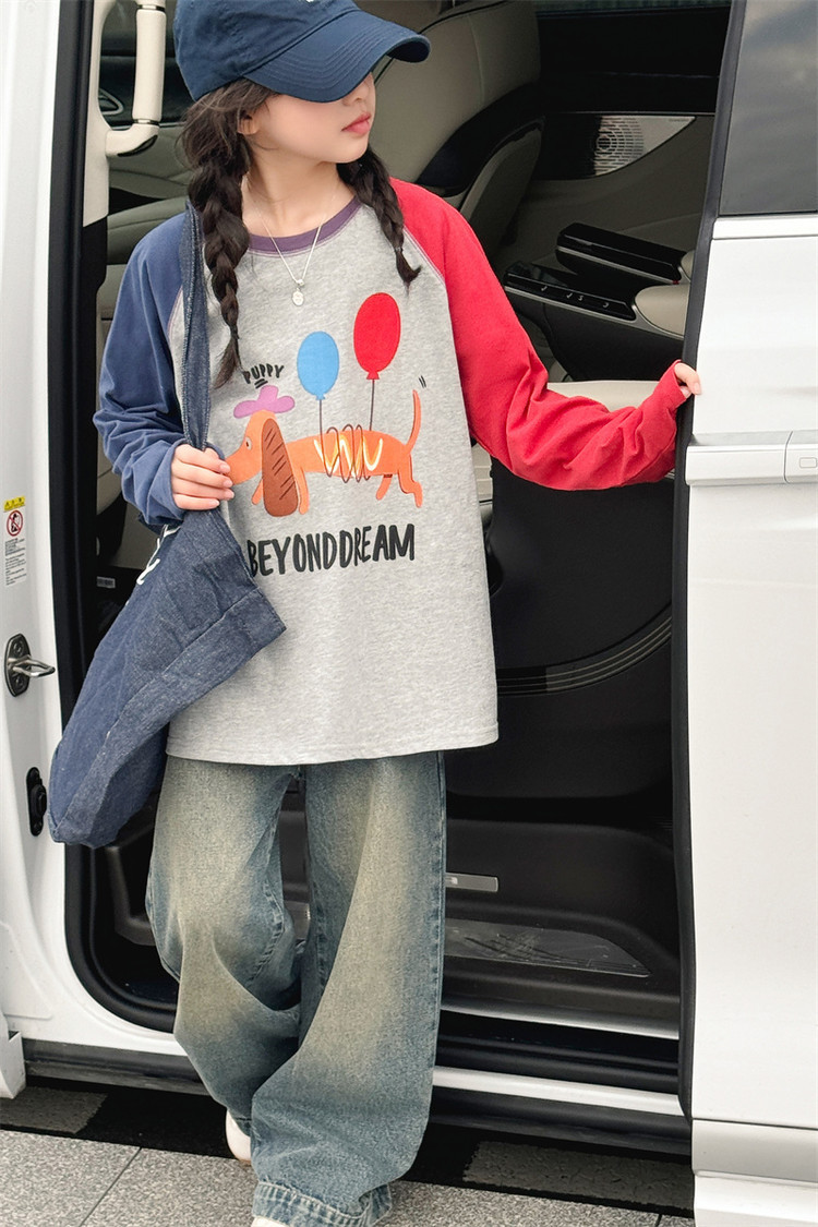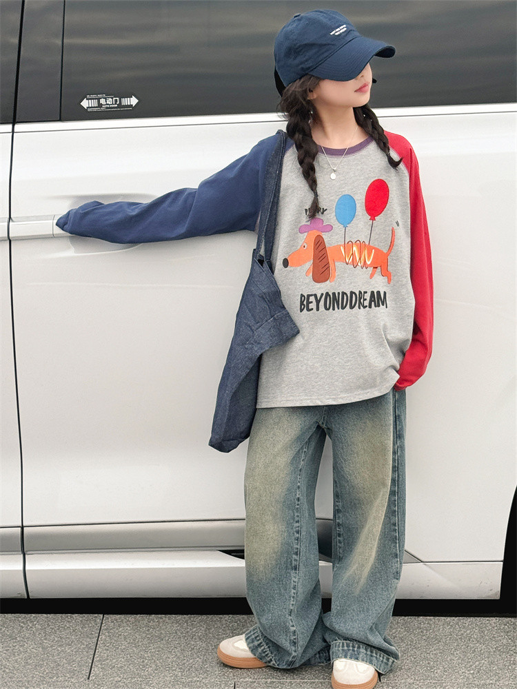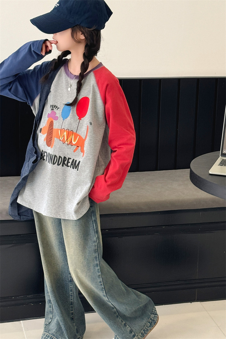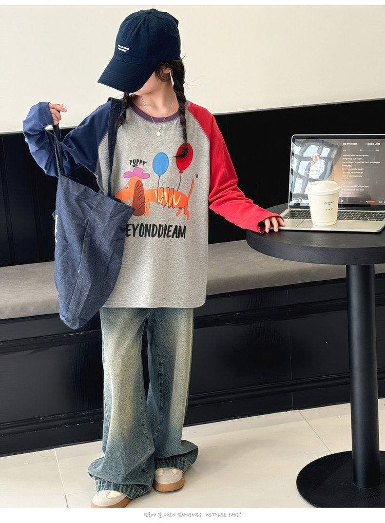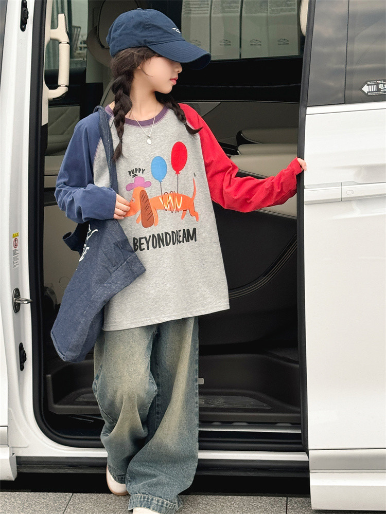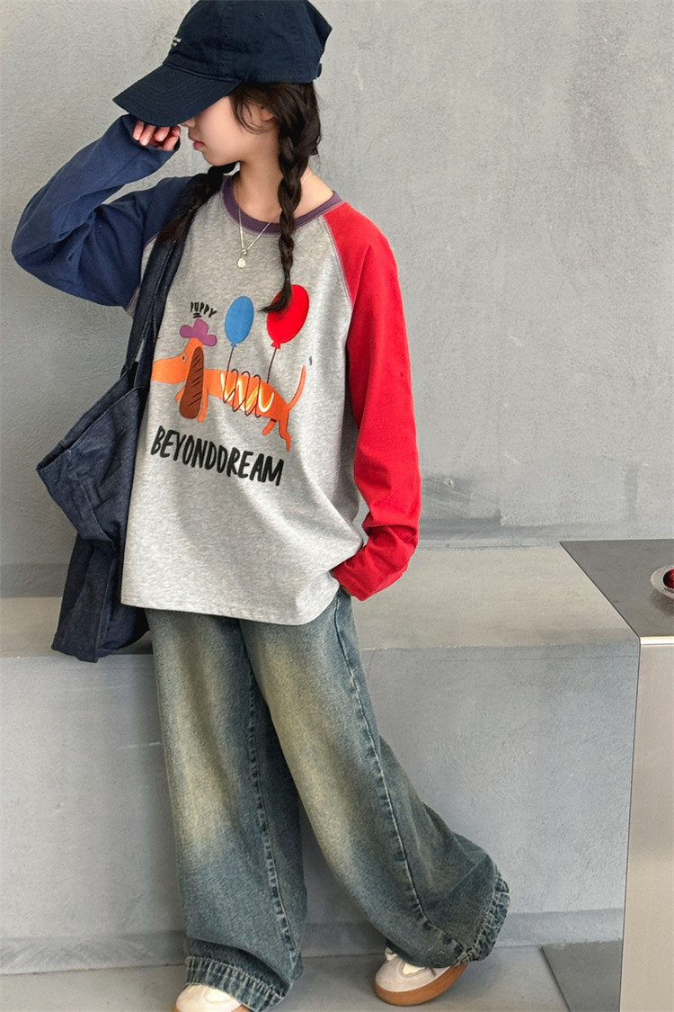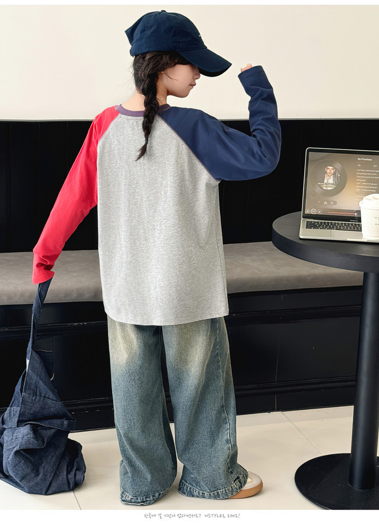 소녀 한국식 컬러 블록 긴팔 티셔츠 2025 새로운 봄 소녀의 서양식 느슨한 캐주얼 인쇄 트렌디 탑스토어 가기