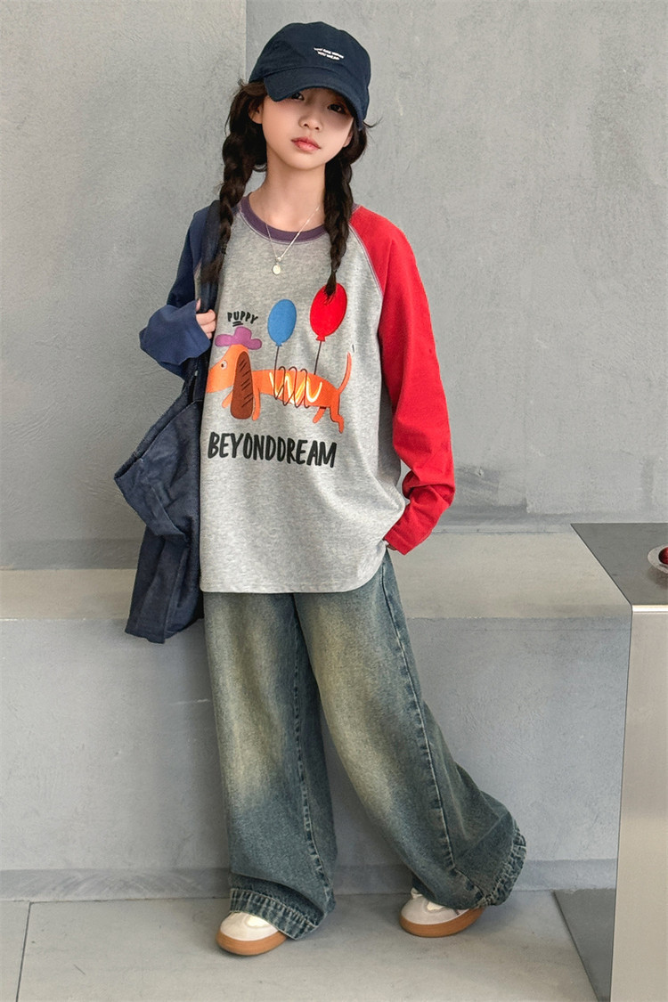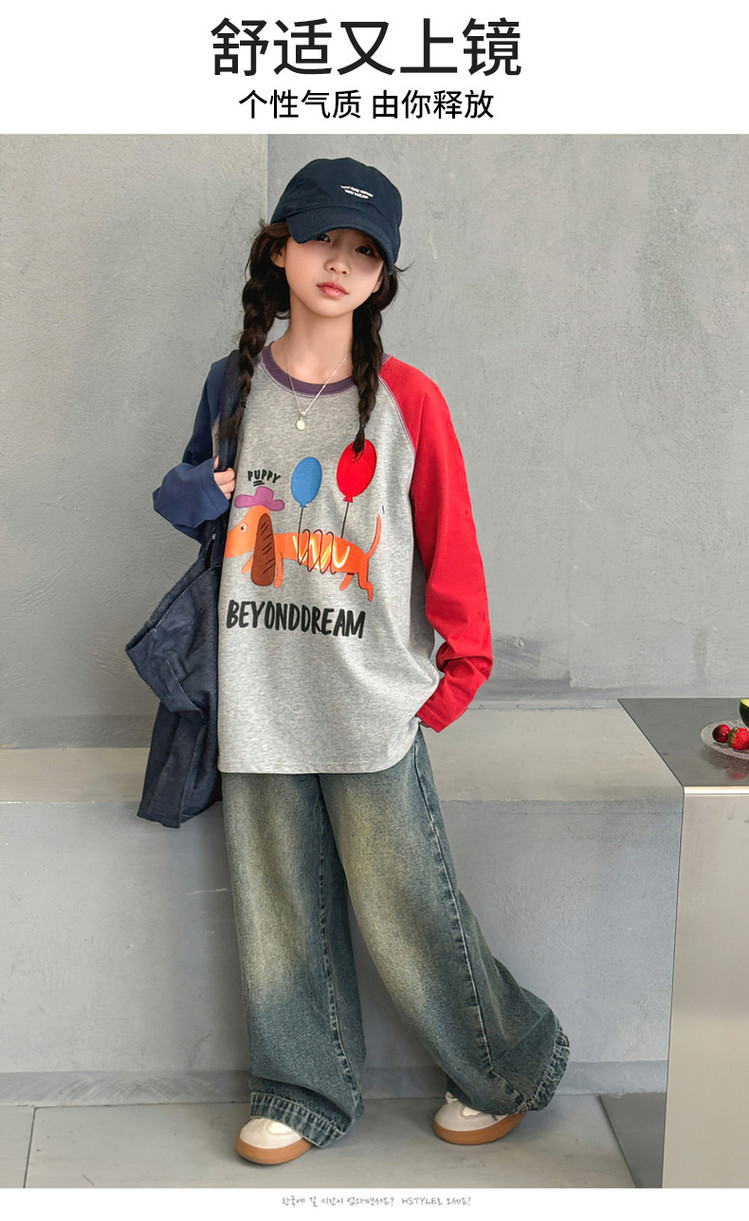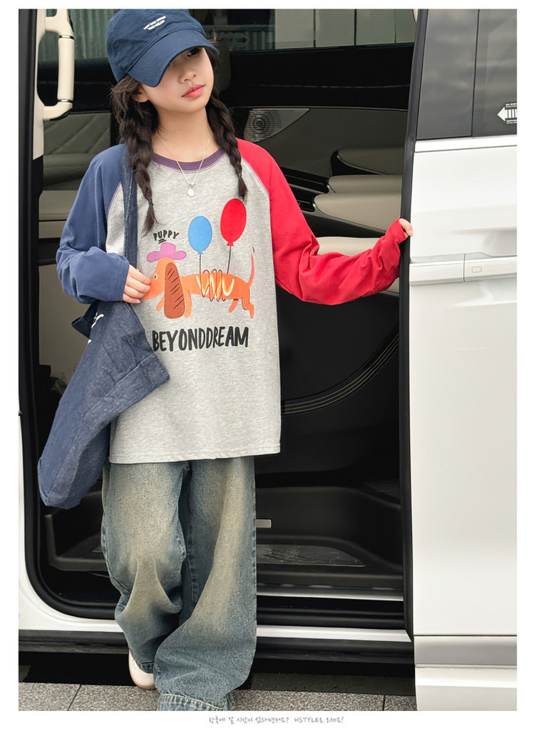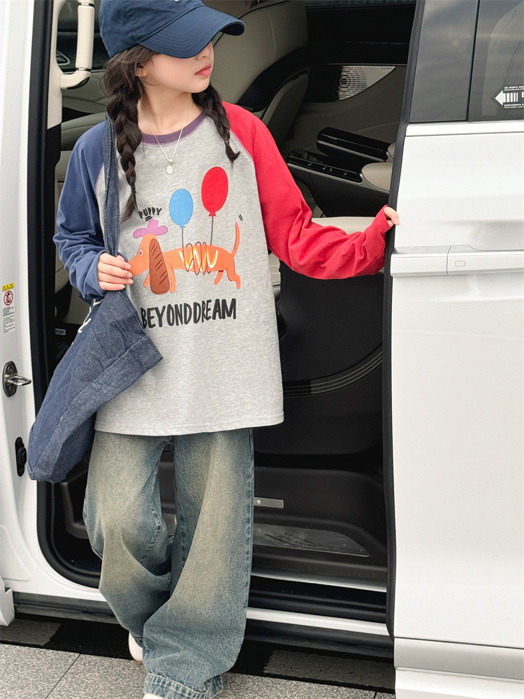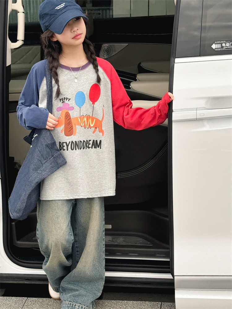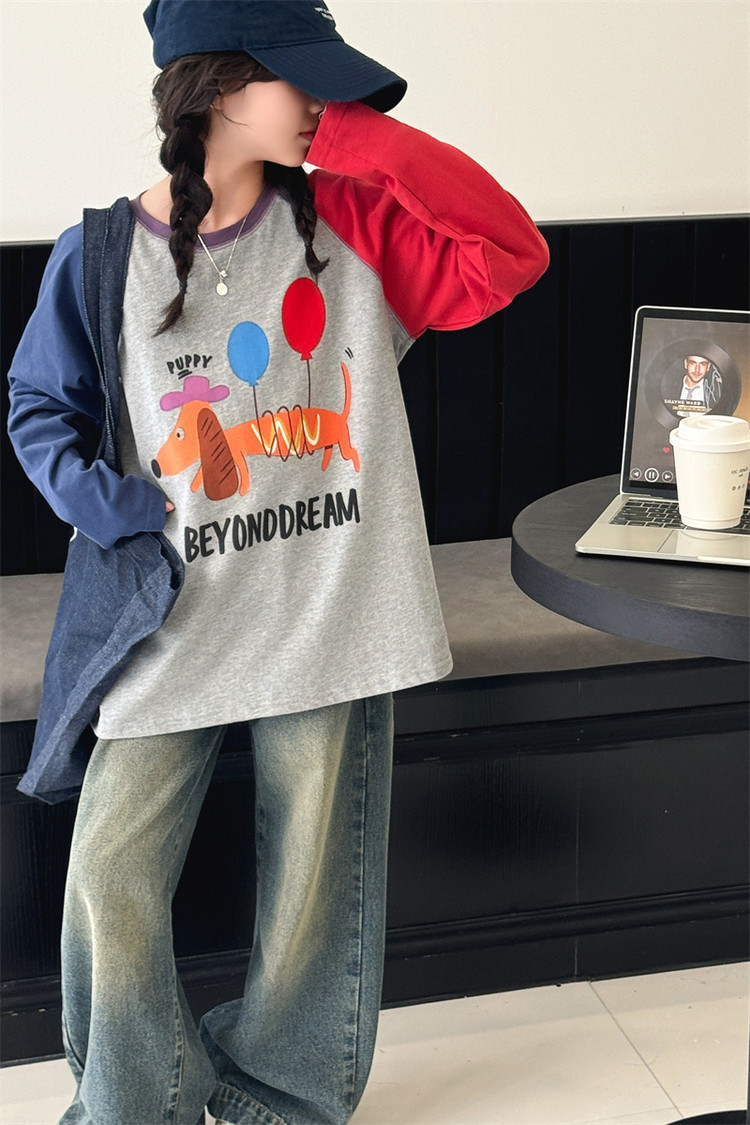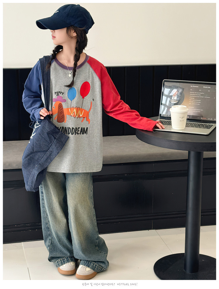소녀 한국식 컬러 블록 긴팔 티셔츠 2025 새로운 봄 소녀의 서양식 느슨한 캐주얼 인쇄 트렌디 탑스토어 가기