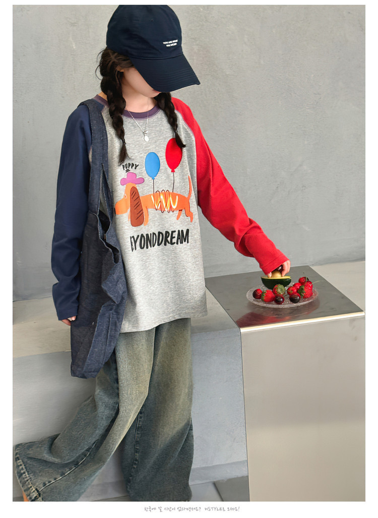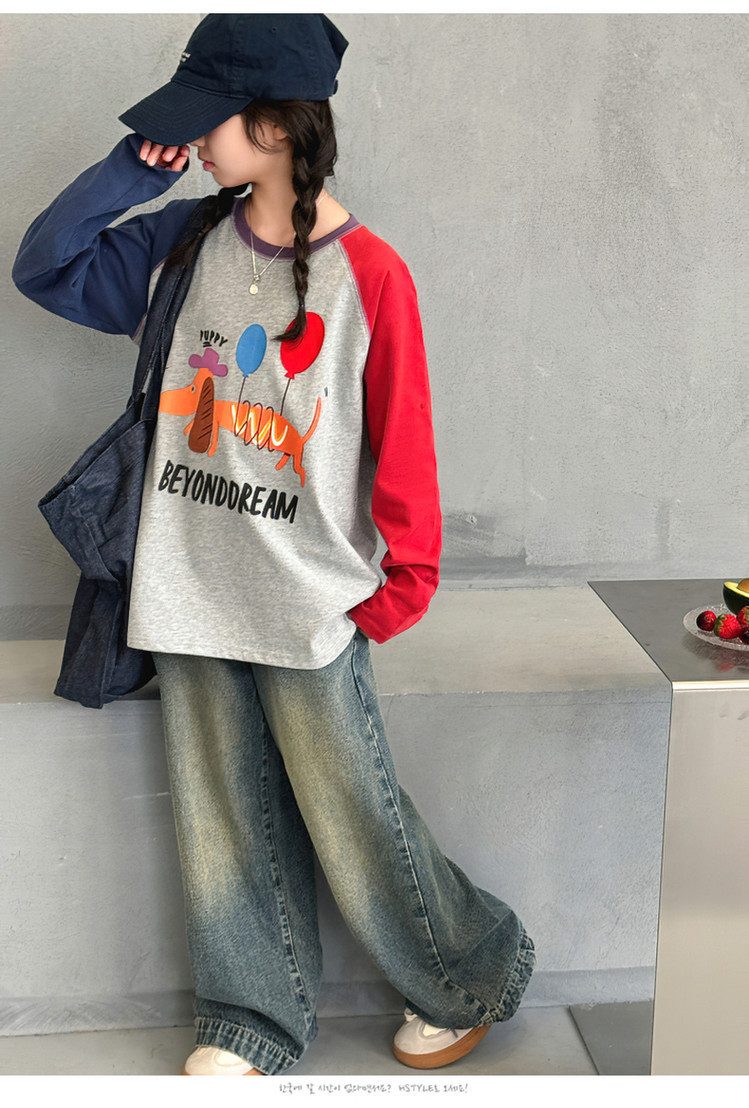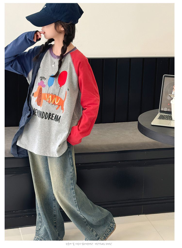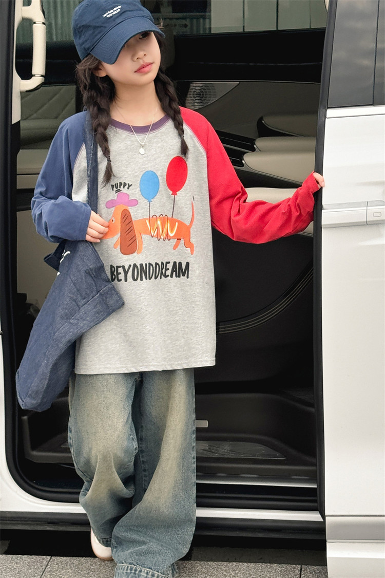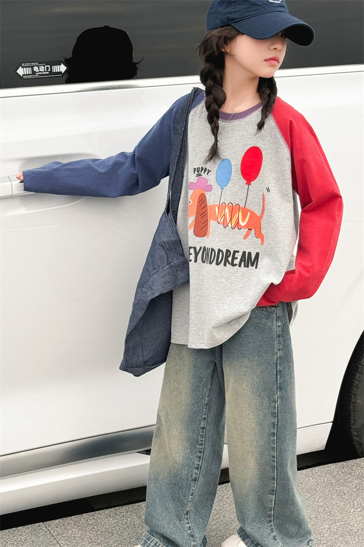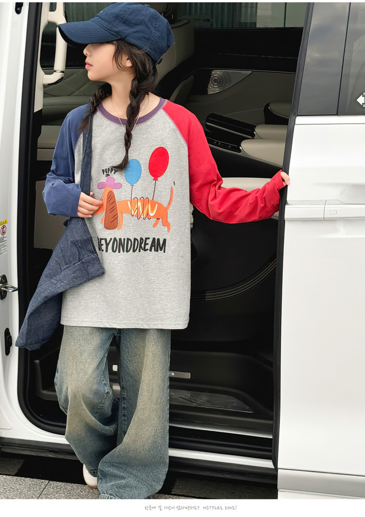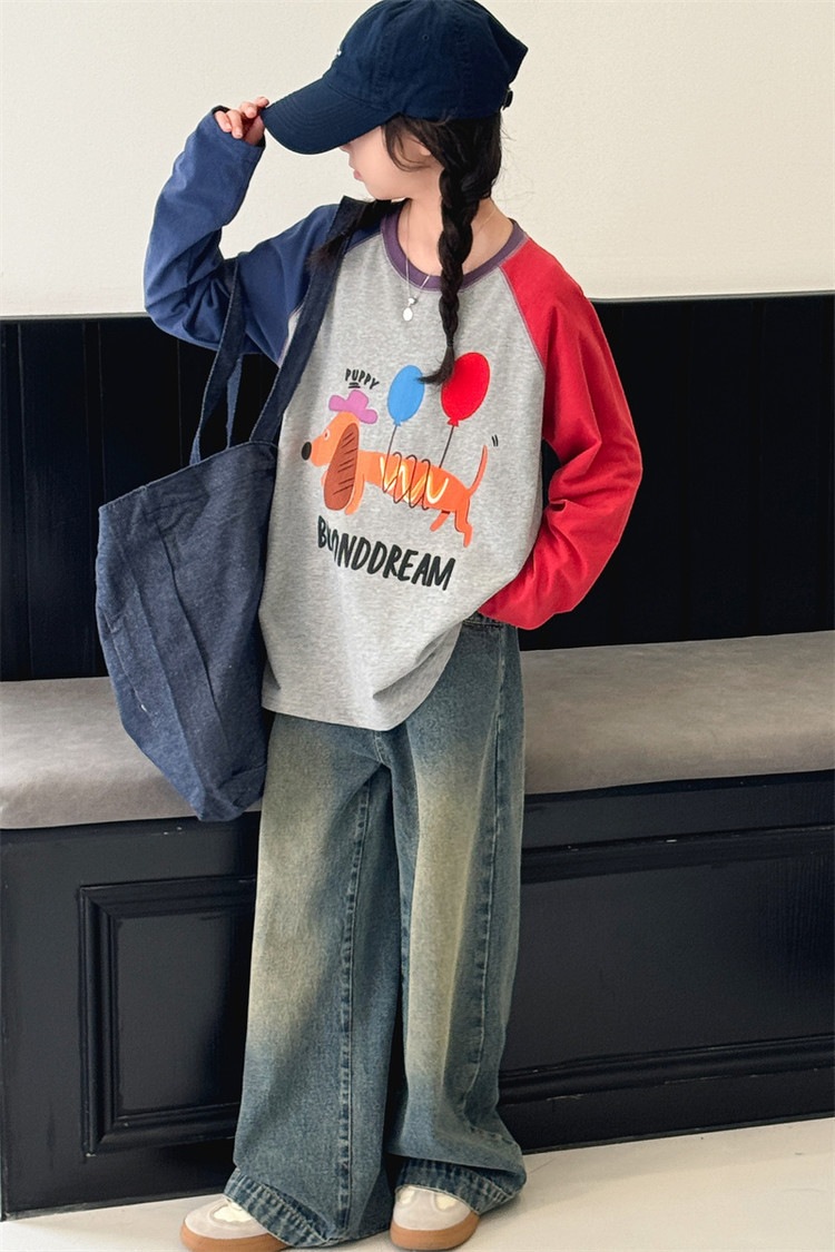 소녀 한국식 컬러 블록 긴팔 티셔츠 2025 새로운 봄 소녀의 서양식 느슨한 캐주얼 인쇄 트렌디 탑스토어 가기