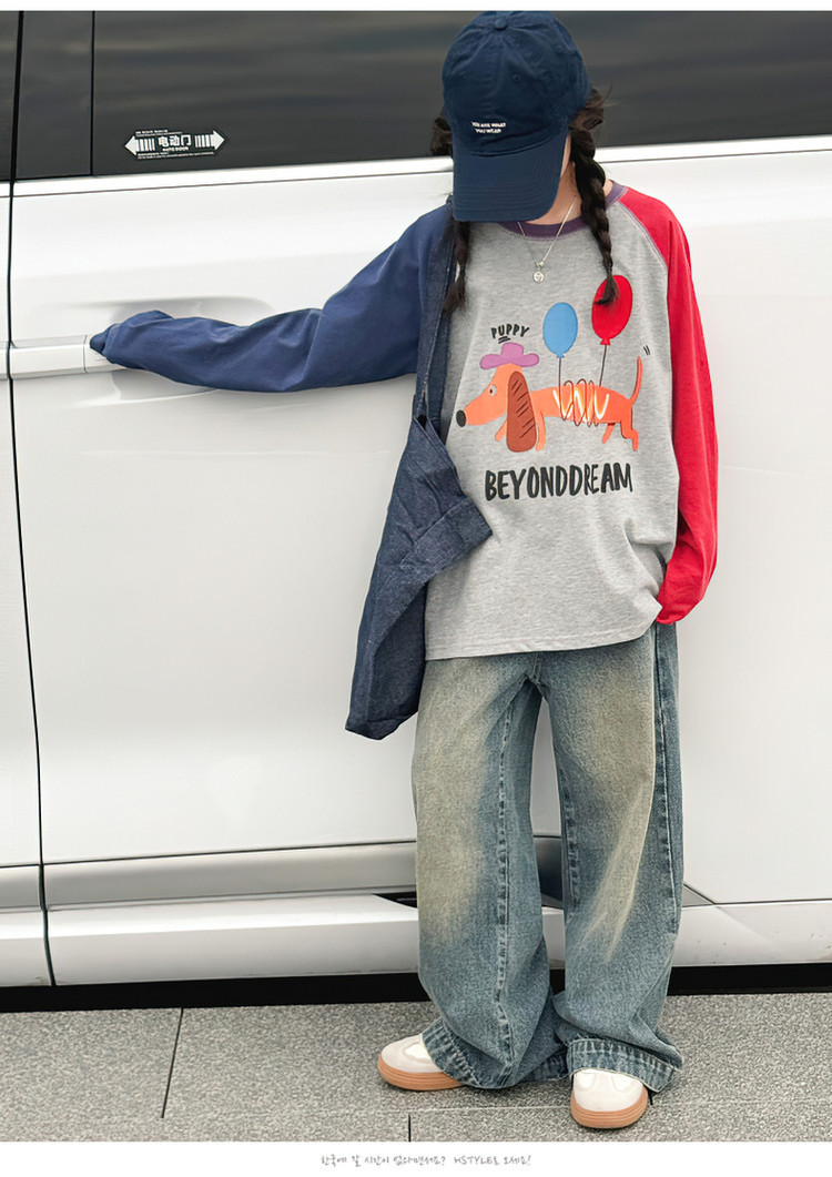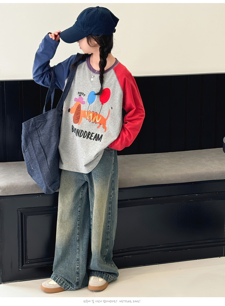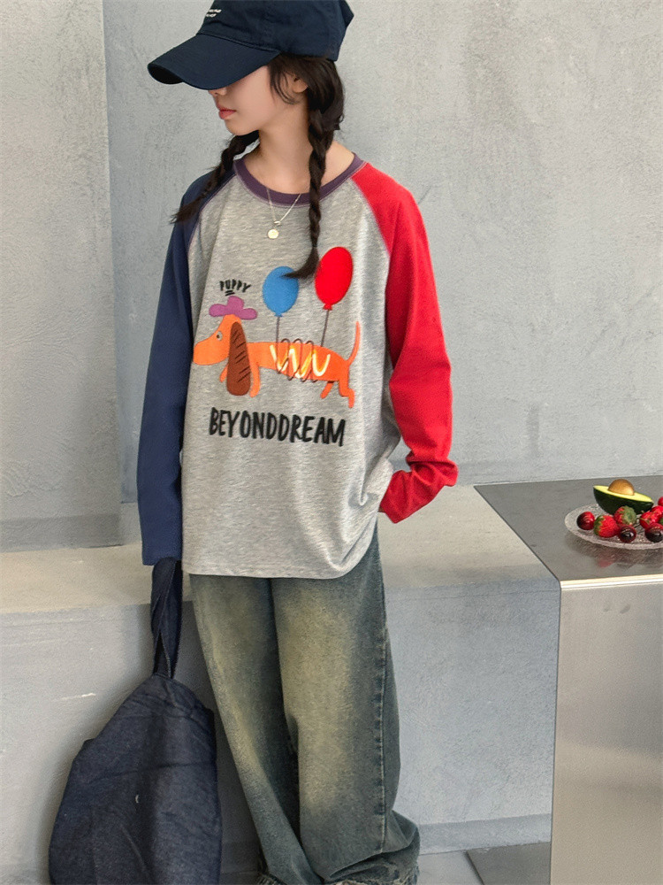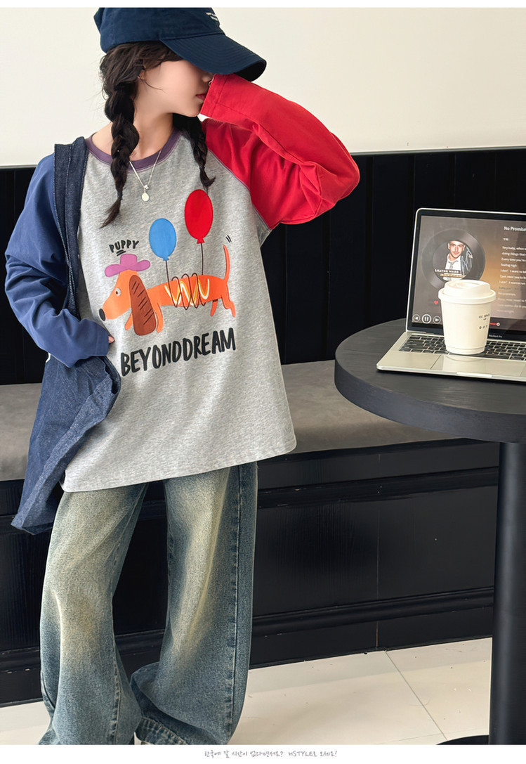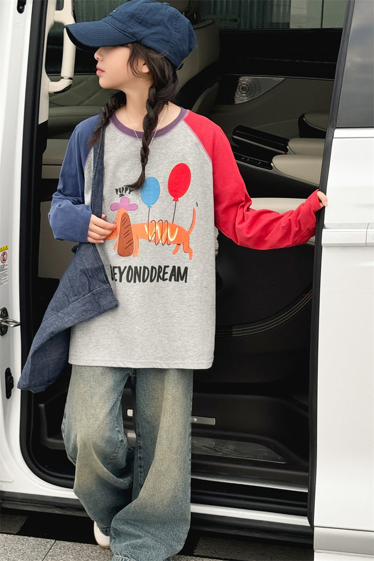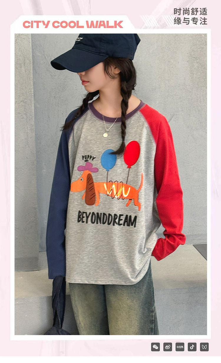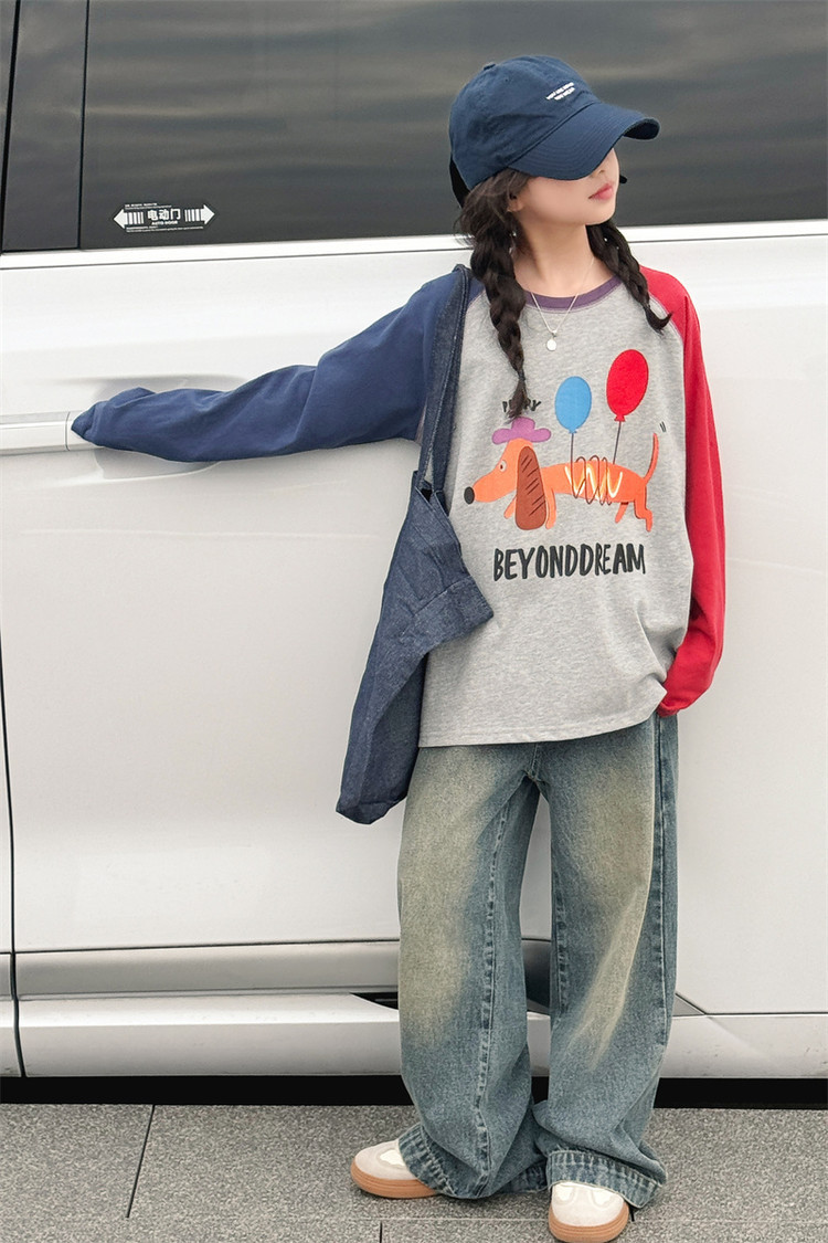 소녀 한국식 컬러 블록 긴팔 티셔츠 2025 새로운 봄 소녀의 서양식 느슨한 캐주얼 인쇄 트렌디 탑스토어 가기