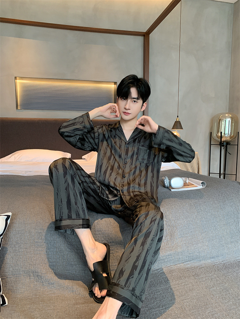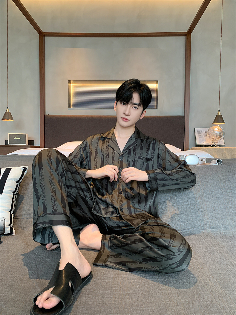 플러스 사이즈 아이스 실크 남자 잠옷 2025 여름 새로운 하이 엔드 V 넥 얇은 긴 소매 투피스 홈 옷스토어 가기