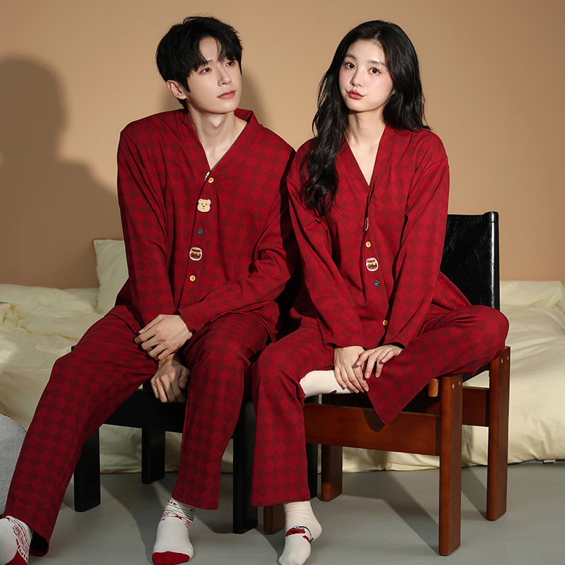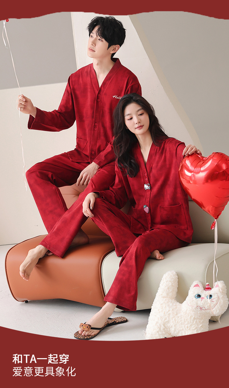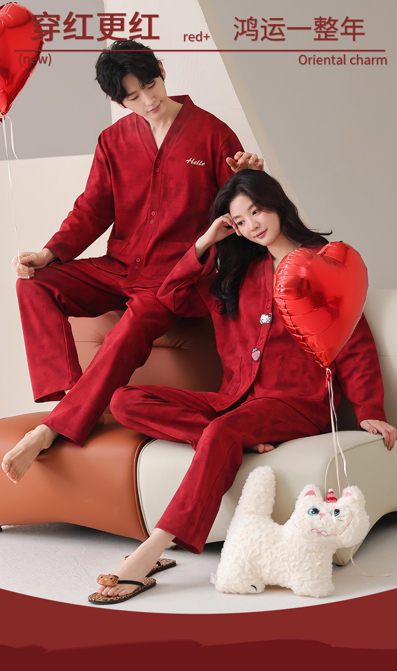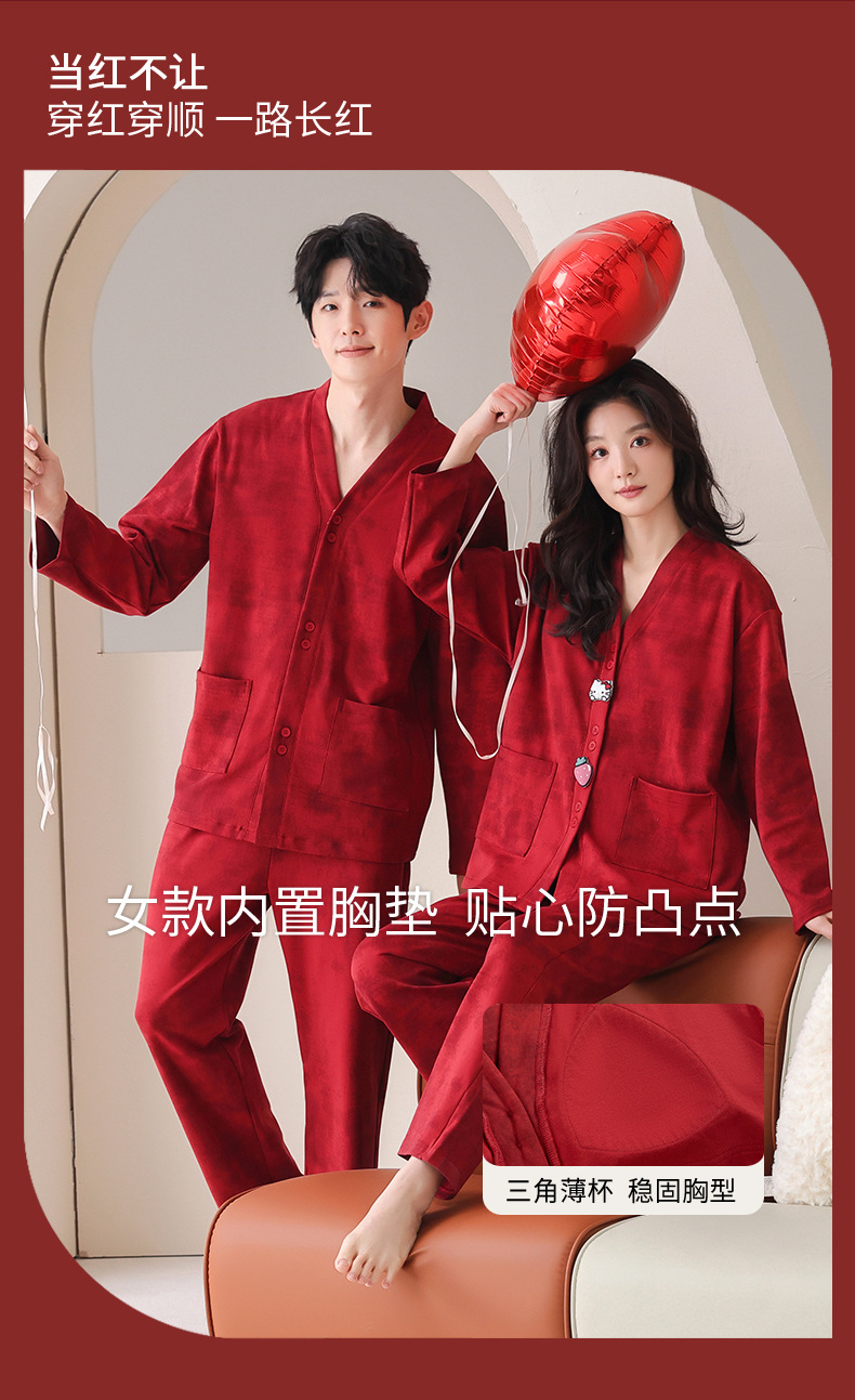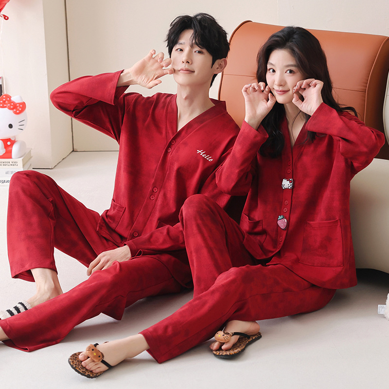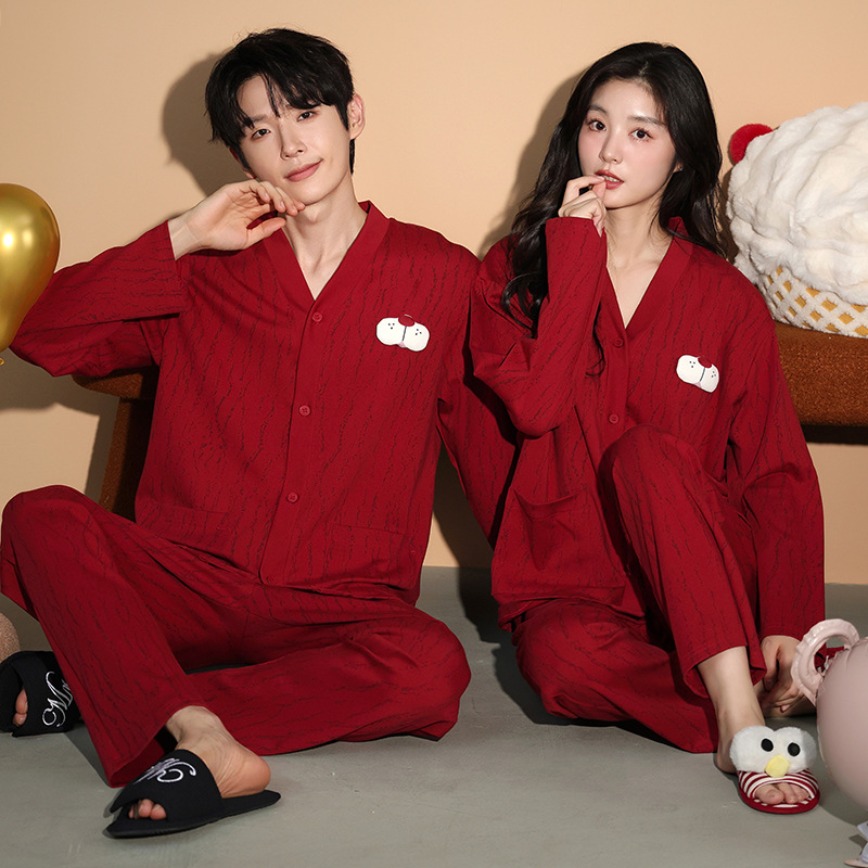 가슴 패드가있는 여성용 웨딩 커플 잠옷 봄, 가을 순수 코튼 긴팔 카디건 레드 축제 남성용 홈웨어 세트스토어 가기
